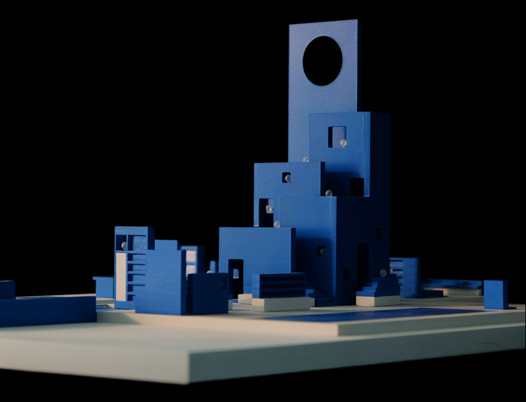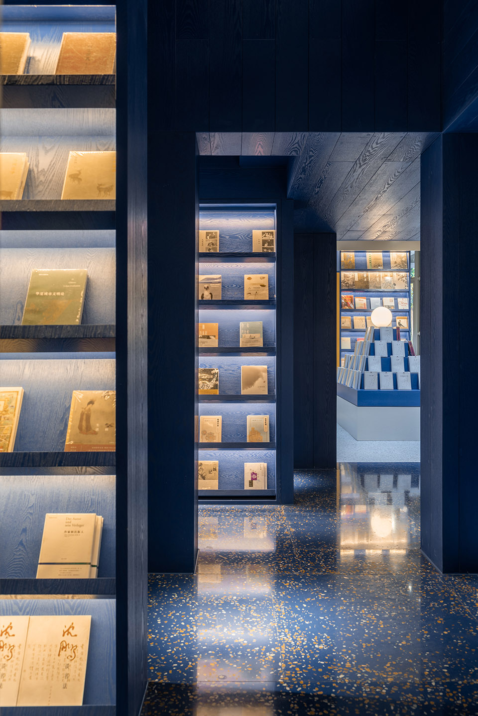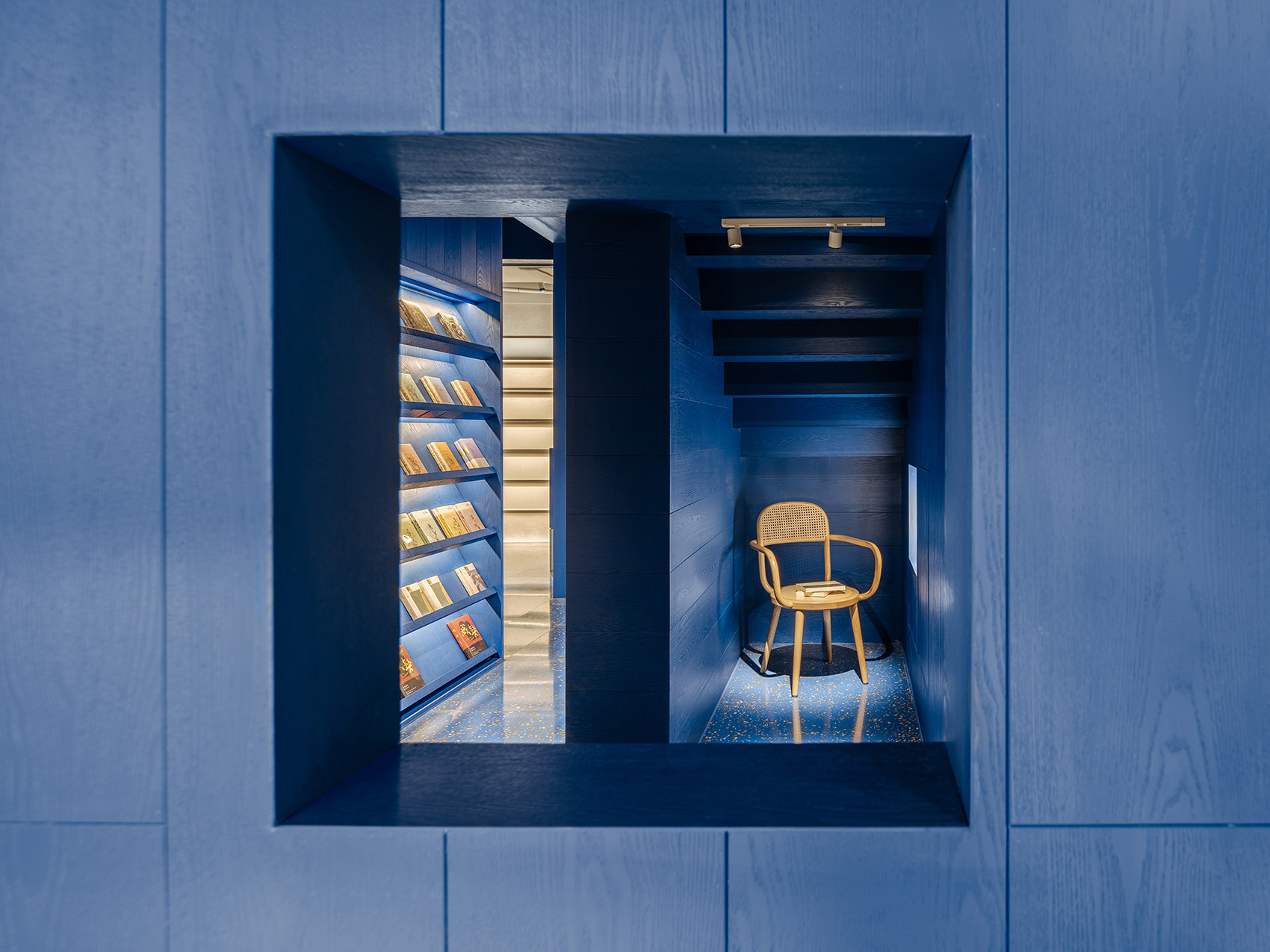 令我们意外的是,在后期和业主的讨论中,这蓝色又被大家赋予各种与书店主题相关的解读,为建筑师第一感觉的恰切反向求据:乒乓球桌的蓝、奥林匹克运动发源地的蓝、青绿山水画的蓝、马蒂斯动感剪纸的蓝……似乎蓝色也是最能融会体育与人文精神的色彩。最终,大家决定采用山体的蓝色木纹与墙面的灰色水泥并置,以精致与粗砺的对话回应精神锤炼和体育竞技间的关系。