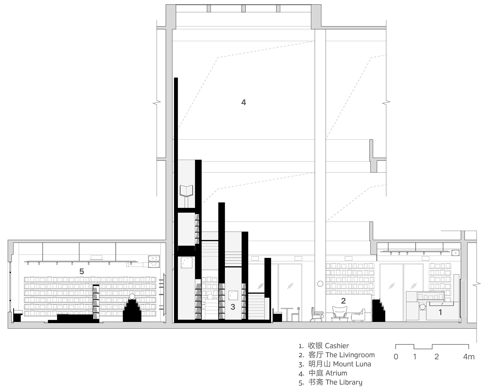 我们在初访基地时发现,受建筑原始结构限制,人进入书店后要先在一小段低暗天花下走几步才能拐个弯进入中庭,这恰好欲扬先抑地增强了中庭空间带来的感官冲击:室内高度陡然提升5倍,近1:2的底高比迫人抬头仰望;天光下拂,中庭西墙呈现出如同五代宋初巨嶂山水画般的巍峨气势。我们于是决定在此设置一座13米高的“主峰”,用来统领全店的“书山”。