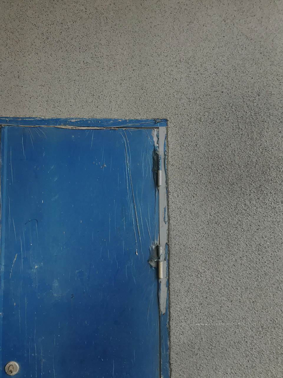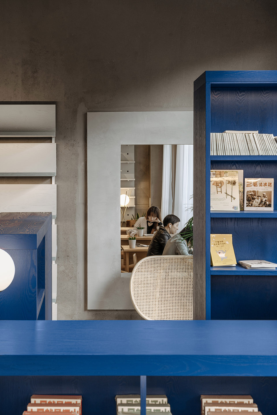空间中最瞩目的蓝色,来自我们初访基地时的偶然触动:一扇建筑外墙金属门上未剥落的蓝色保护膜与墙面的灰色真石漆并置,两种颜色与材质的微妙对比传递出一种动静相宜的独特气质,我们当场决定将蓝色与水泥色作为未来书店的主色。