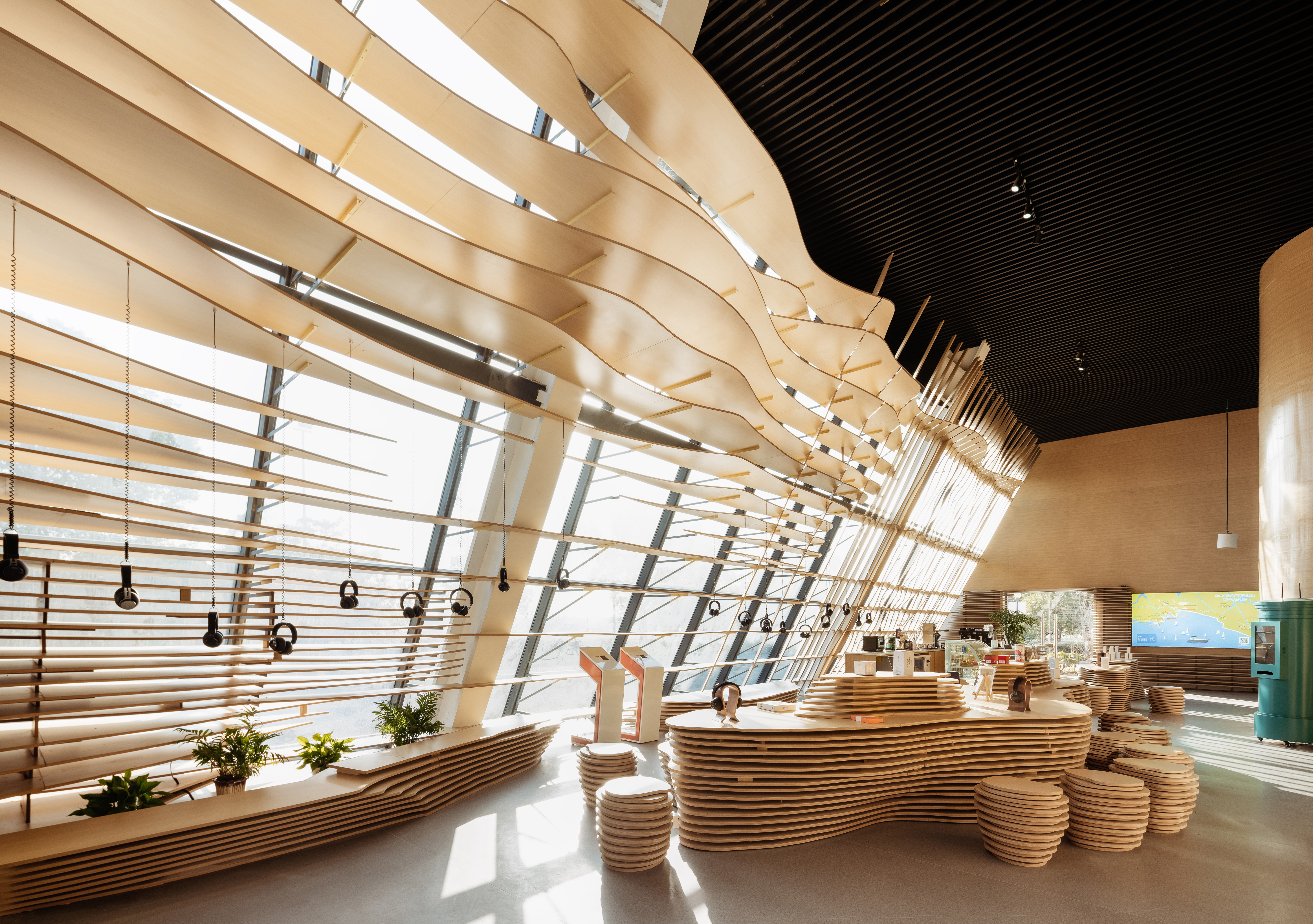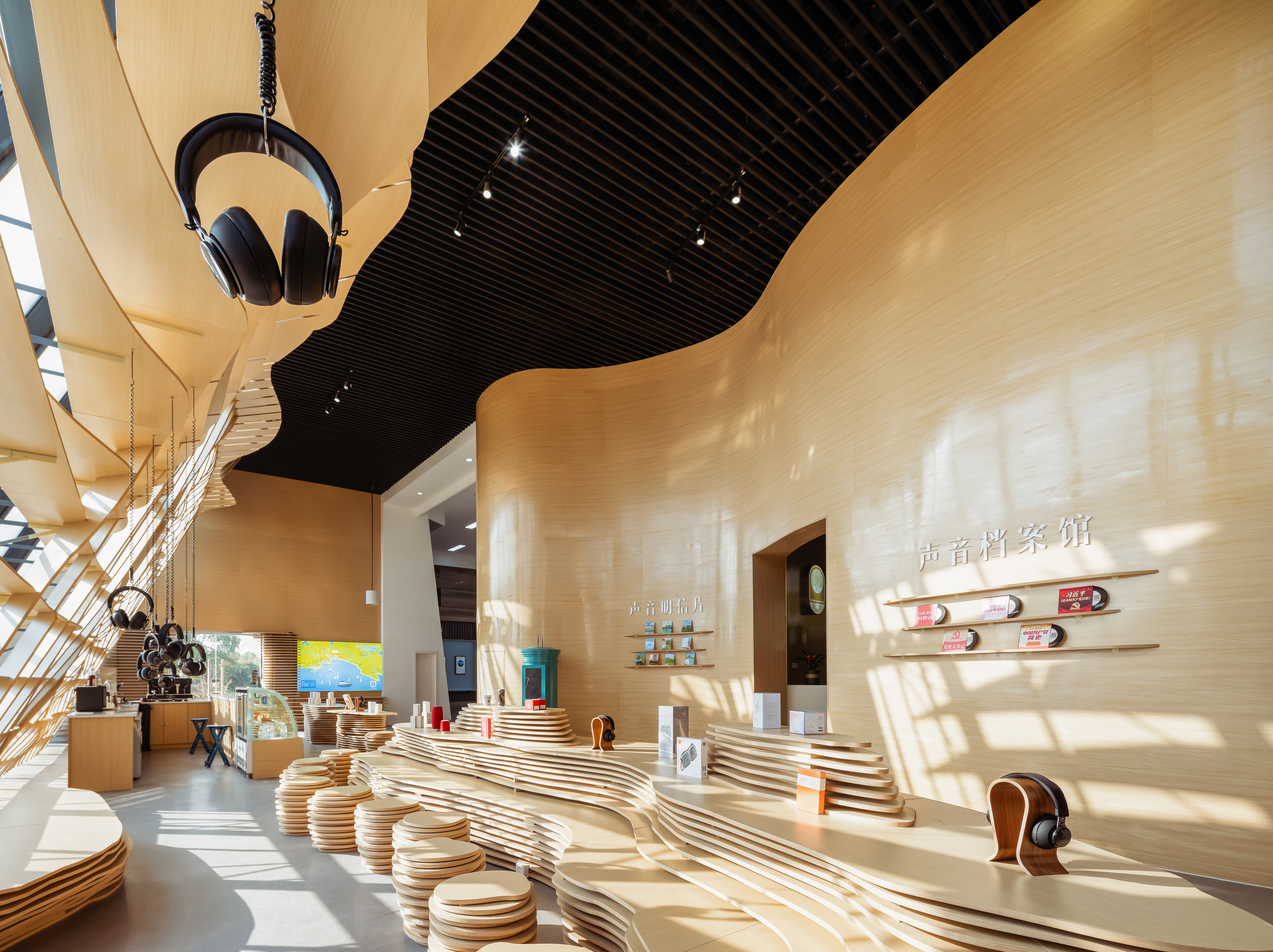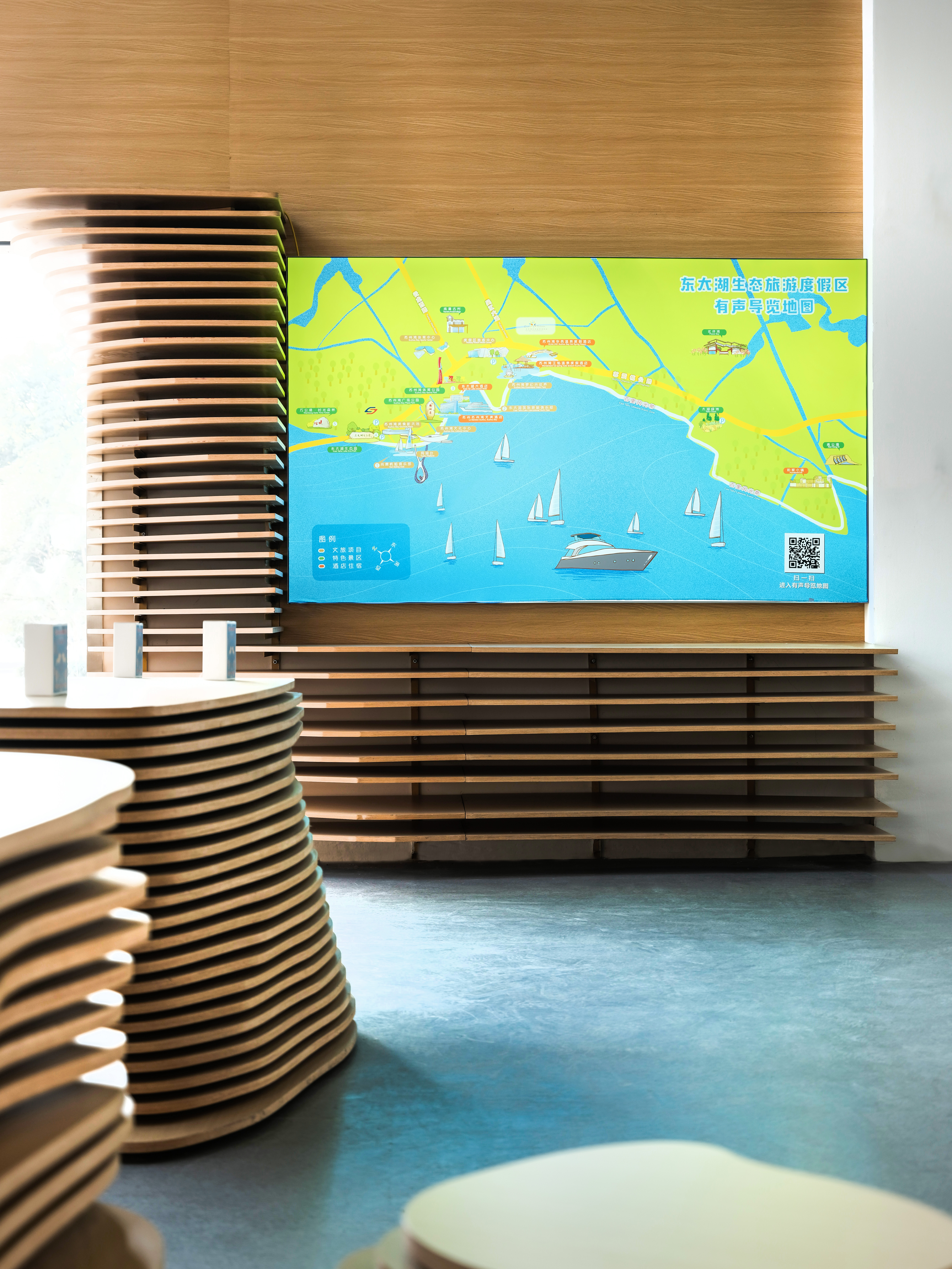 水流的元素贯穿了主厅的整体设计。设计师采用水流的形态将整个空间包覆,所有墙体都由涟漪型的格栅构成,在视觉方面让游客们感受到回荡在整个空间内的声音。除此之外,富有流动感的墙面容纳了“声音明信片”、“声音档案馆”、“声音工作坊”等功能,靠窗一侧的“耳机森林”、“文创展示”及“休闲座椅”等空间也是依据相同的理念设计而成。展厅内的座椅与展台也都依托水流形态延伸而成,与墙面风格统一。配合被展出的有声文创与定制产品,东太湖的特色被渗透在每个细节之处,通过声音与空间传递给游客。