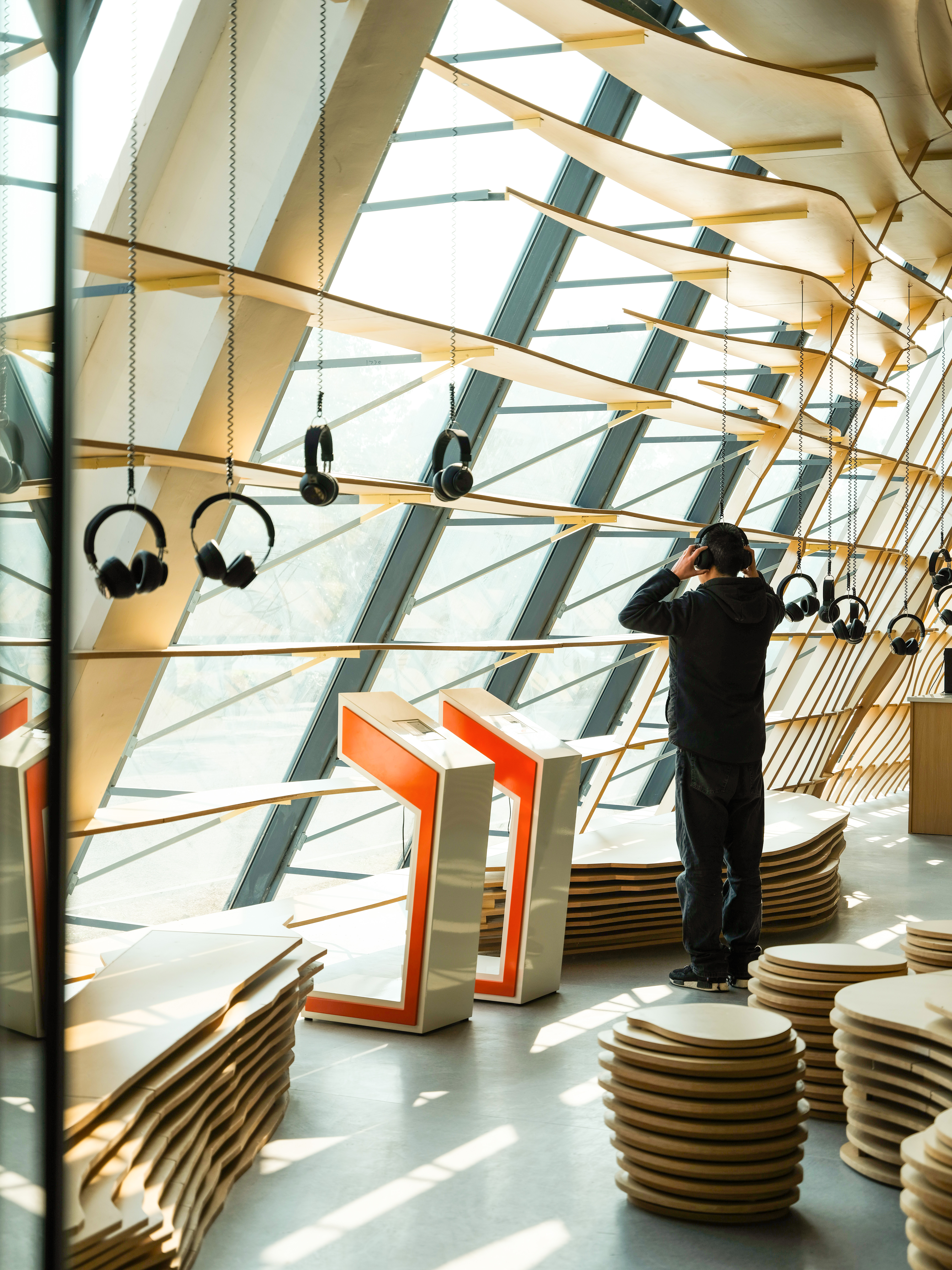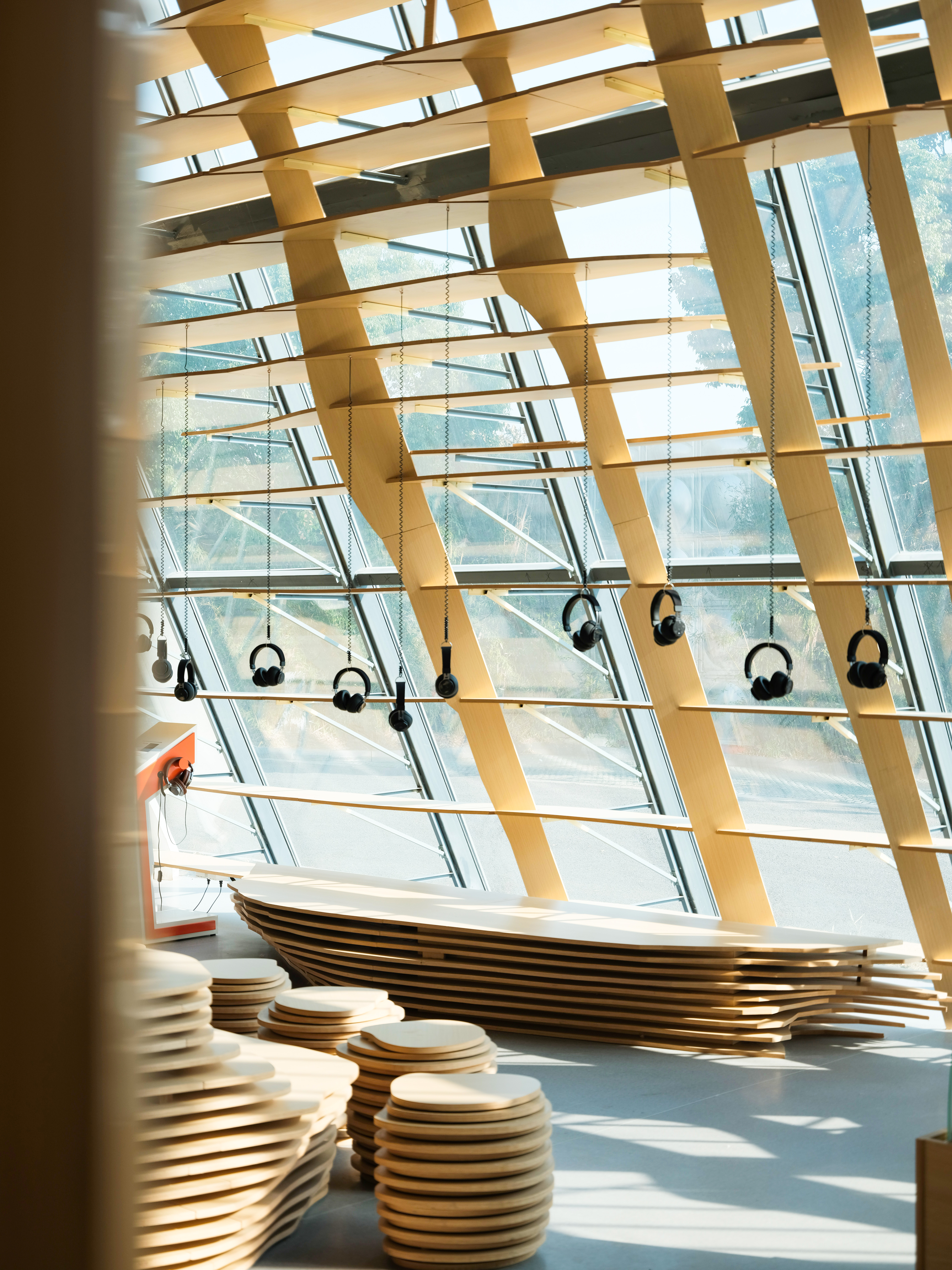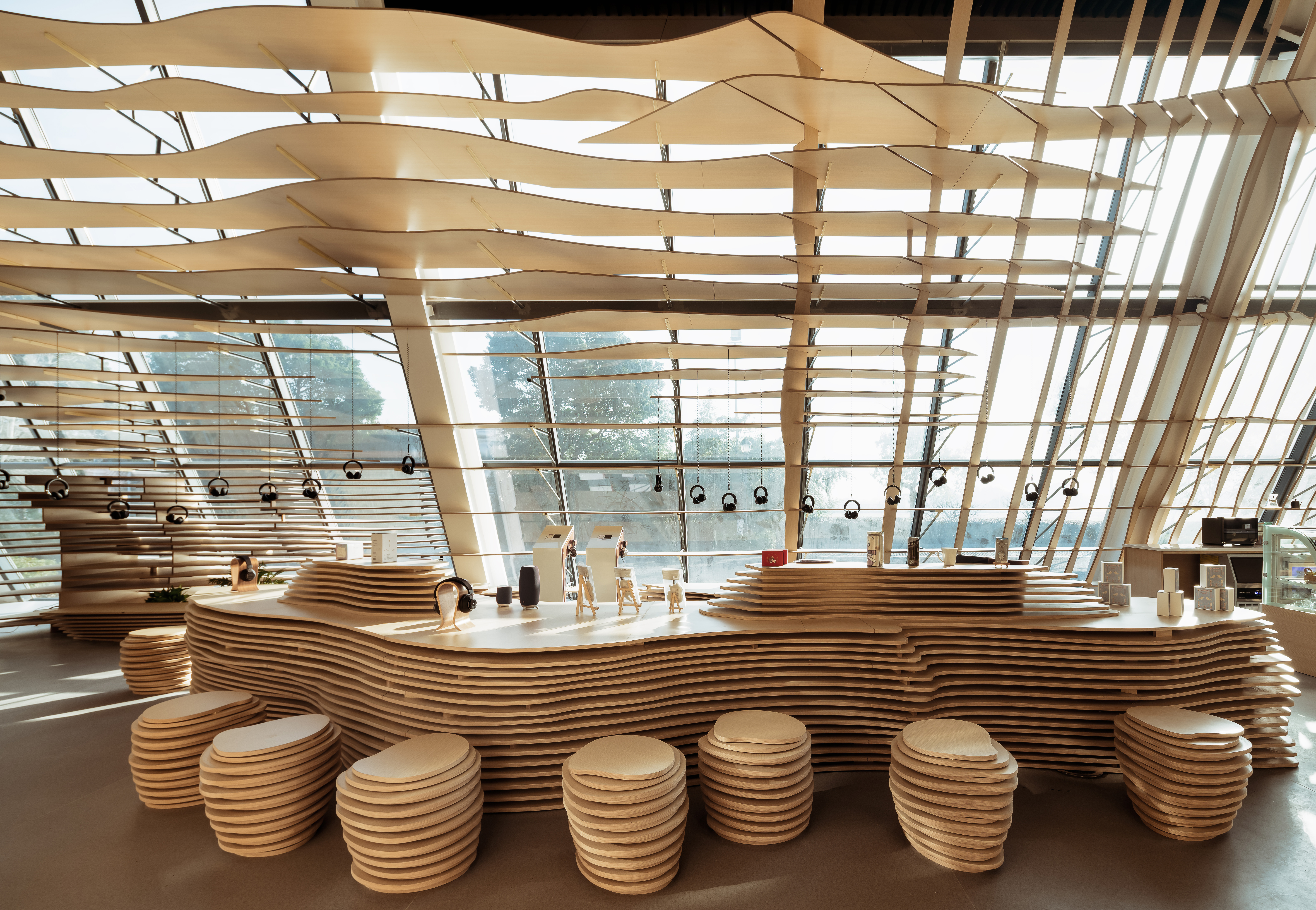 水流的元素贯穿了主厅的整体设计。设计师采用水流的形态将整个空间包覆,所有墙体都由涟漪型的格栅构成,在视觉方面让游客们感受到回荡在整个空间内的声音。除此之外,富有流动感的墙面容纳了“声音明信片”、“声音档案馆”、“声音工作坊”等功能,靠窗一侧的“耳机森林”、“文创展示”及“休闲座椅”等空间也是依据相同的理念设计而成。展厅内的座椅与展台也都依托水流形态延伸而成,与墙面风格统一。配合被展出的有声文创与定制产品,东太湖的特色被渗透在每个细节之处,通过声音与空间传递给游客。