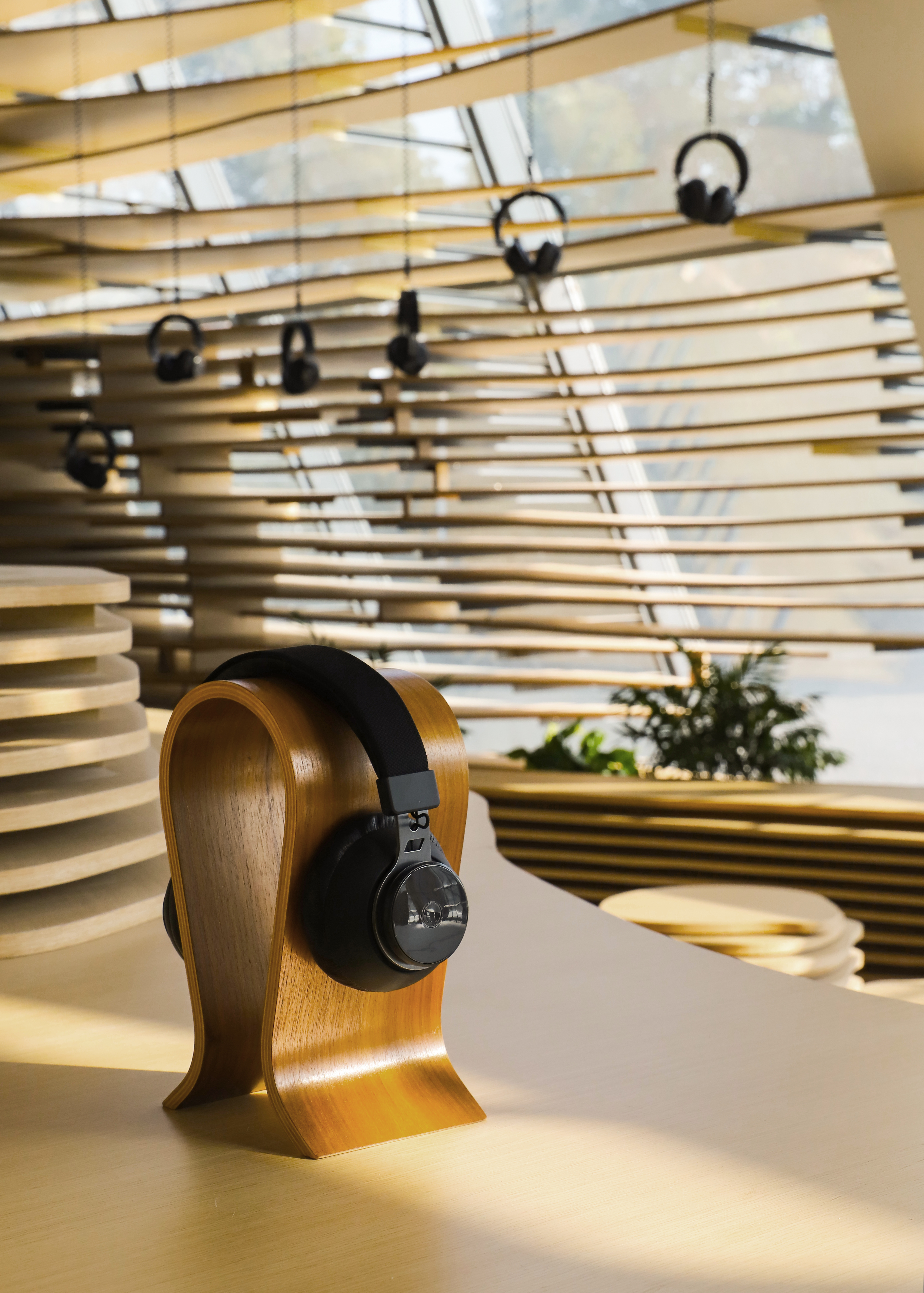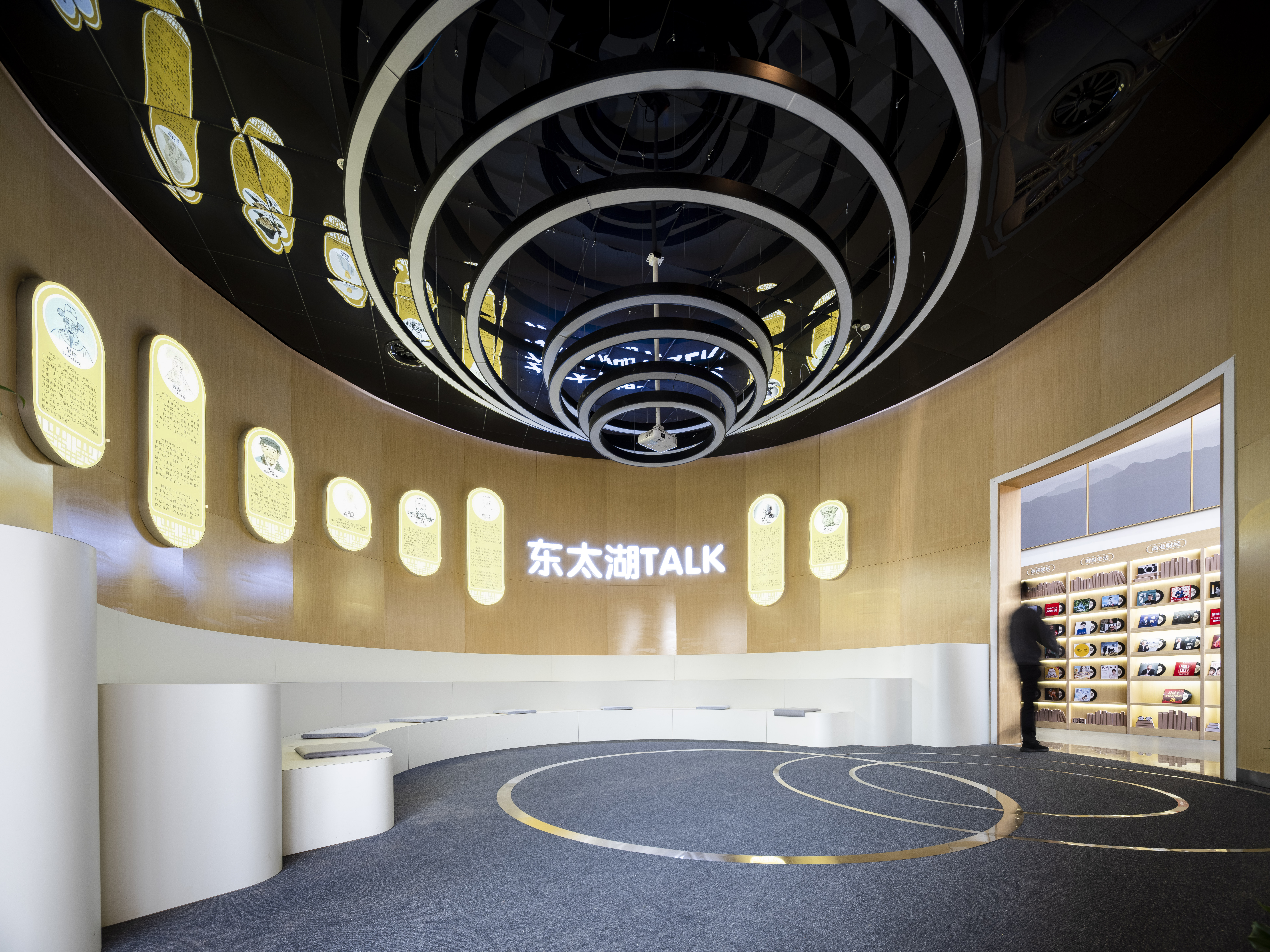东太湖慧客厅整体风格以原木色为主,声音流淌在木质纹路中,给人以温暖、舒适的感觉。慧客厅的设计灵感则来源于太湖景区的代表元素:太湖水面泛起的涟漪与声波十分相似,我们从中提取了圆形元素;而湖湾的整体外形又与水流的形态十分相似,我们从中提取了流动的概念,层层圆形与流动的线条相结合生成了整个展厅的空间。