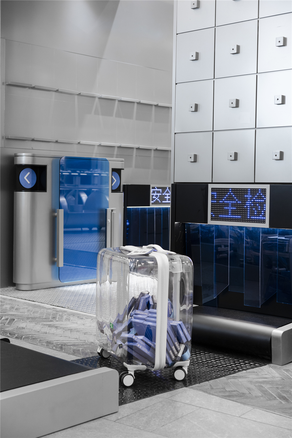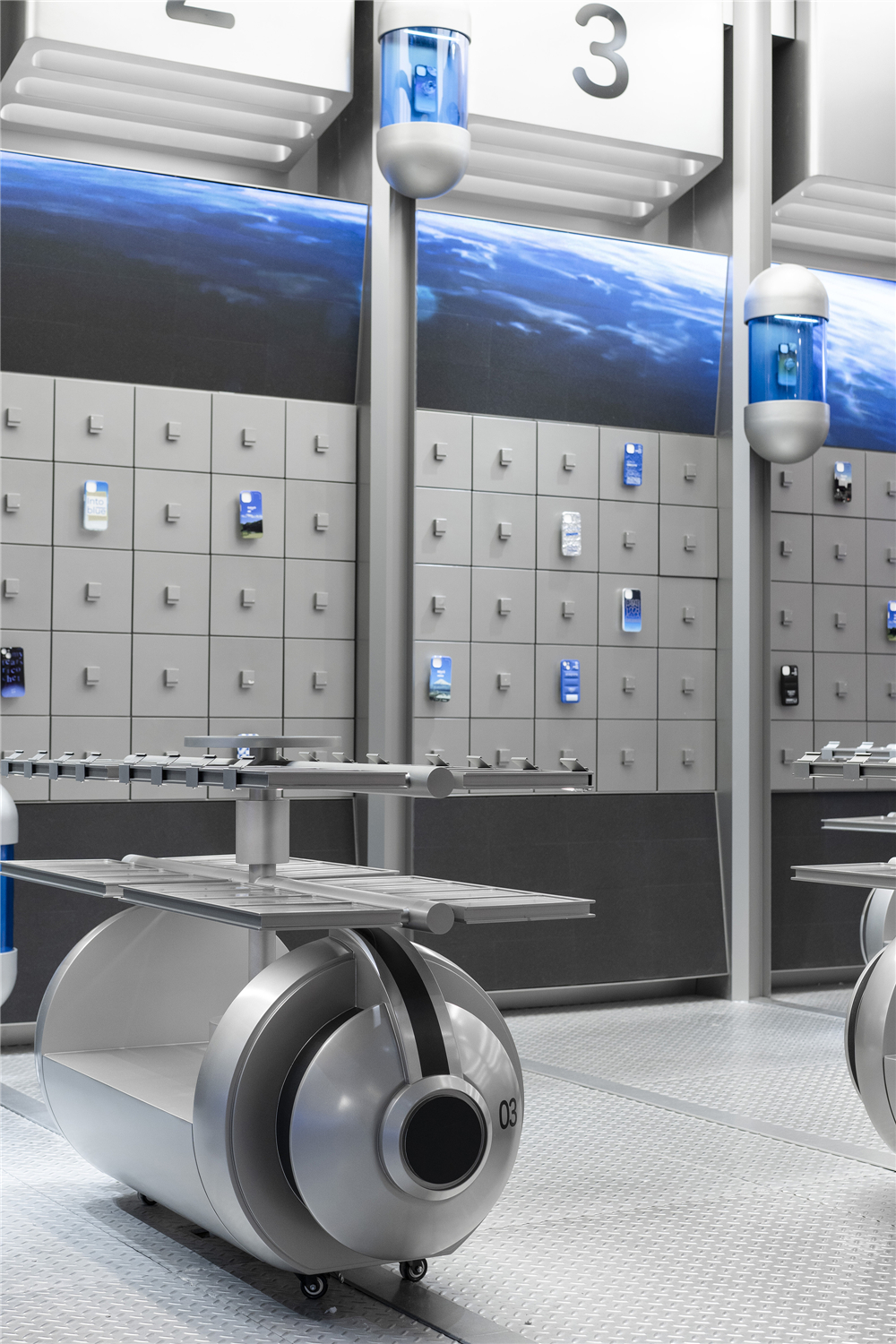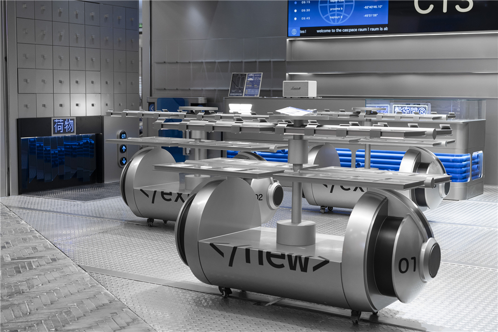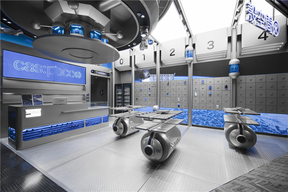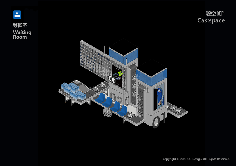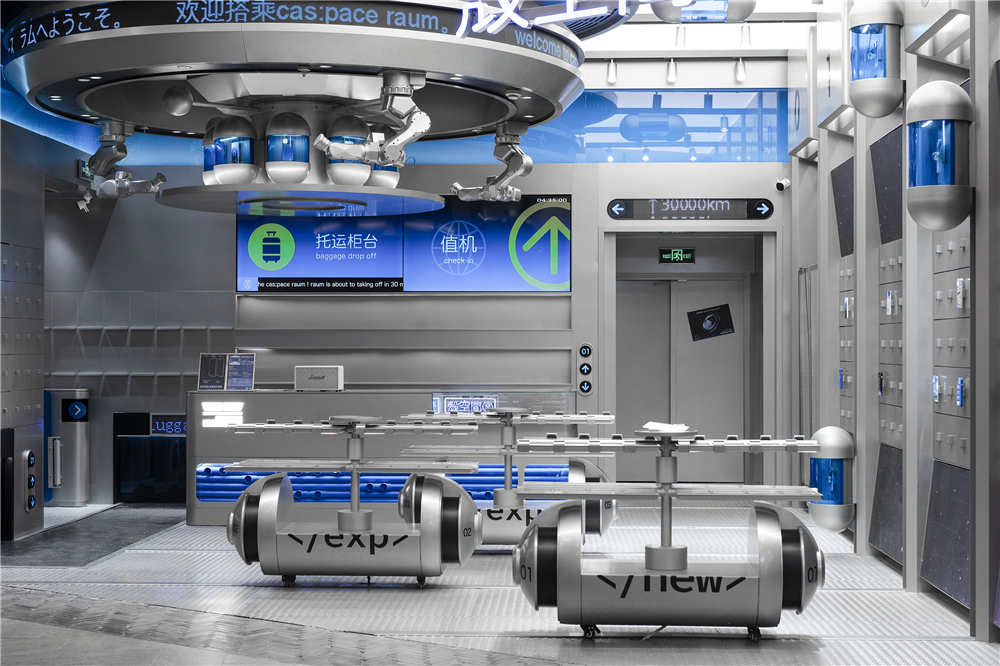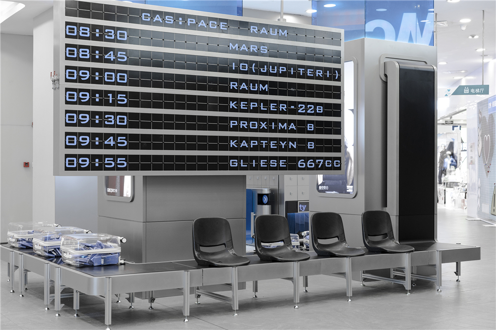 宇宙电梯是一个宏大的计划与构想,这次设计却是要把它融入到一个80㎡的空间中,是一件很有挑战的任务。最终我们把场景叙事设定到了宇宙电梯的起点。把我们产品定义为需要被运输的对象“殻物质”。它需要通过等候,安检,服务中心,运输等一系列场景与动作才能出发到终点。这样的流程也像极了一个产品从生产开始最终到消费者手中需要经历的层层关卡,从而让顾客能体验到最优质的产品。