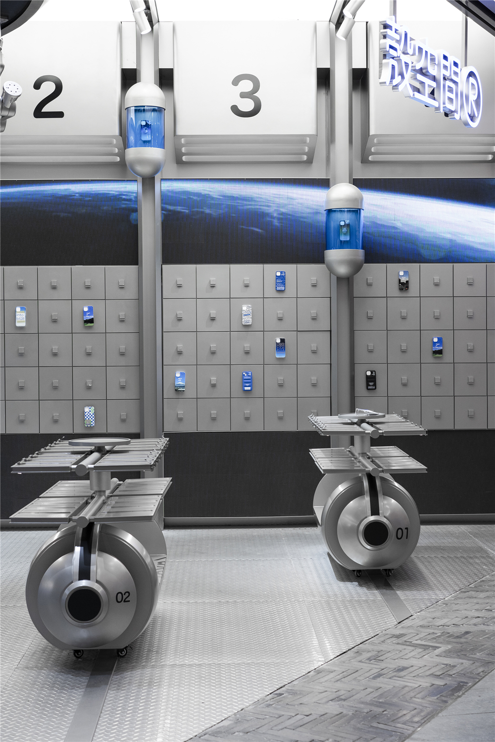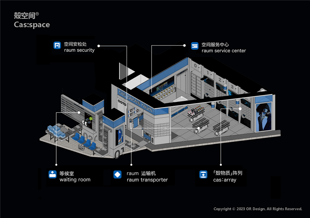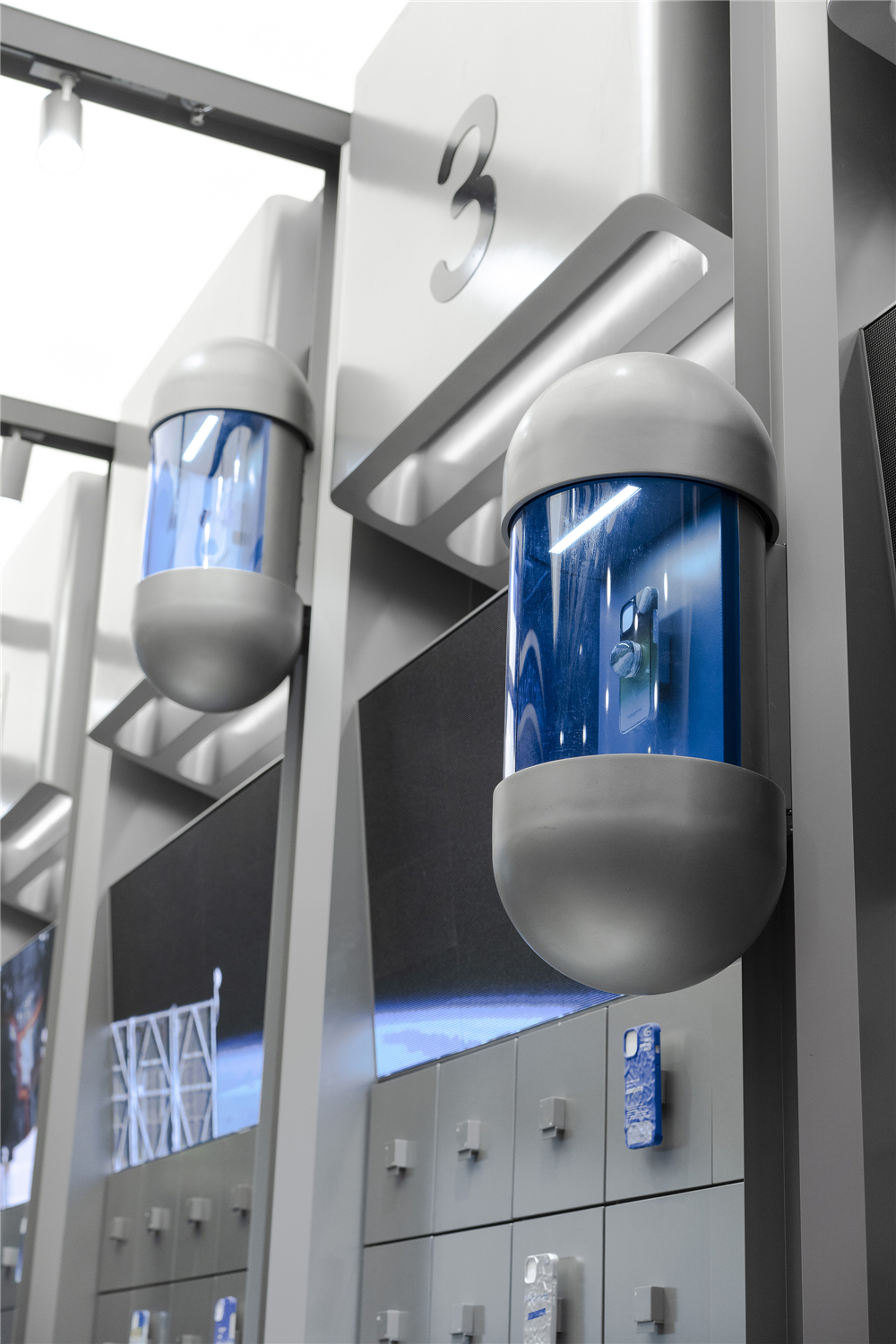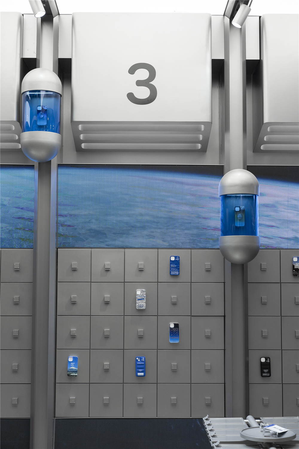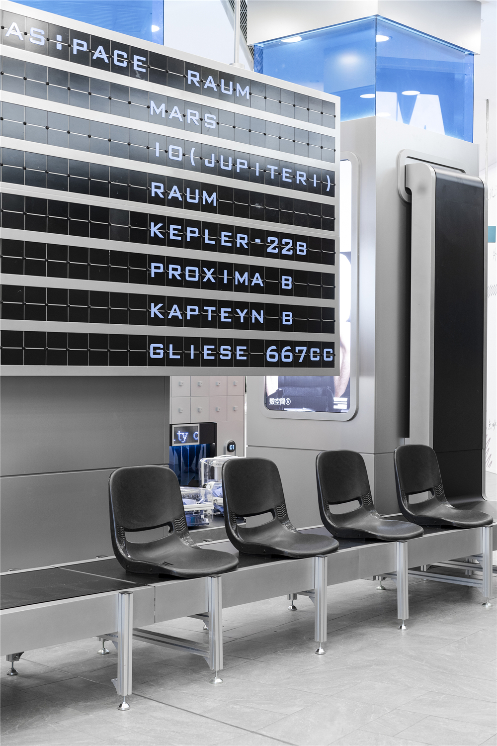 宇宙电梯是一个宏大的计划与构想,这次设计却是要把它融入到一个80㎡的空间中,是一件很有挑战的任务。最终我们把场景叙事设定到了宇宙电梯的起点。把我们产品定义为需要被运输的对象“殻物质”。它需要通过等候,安检,服务中心,运输等一系列场景与动作才能出发到终点。这样的流程也像极了一个产品从生产开始最终到消费者手中需要经历的层层关卡,从而让顾客能体验到最优质的产品。