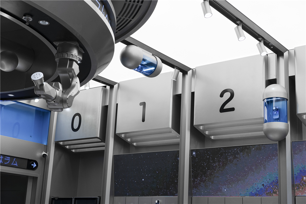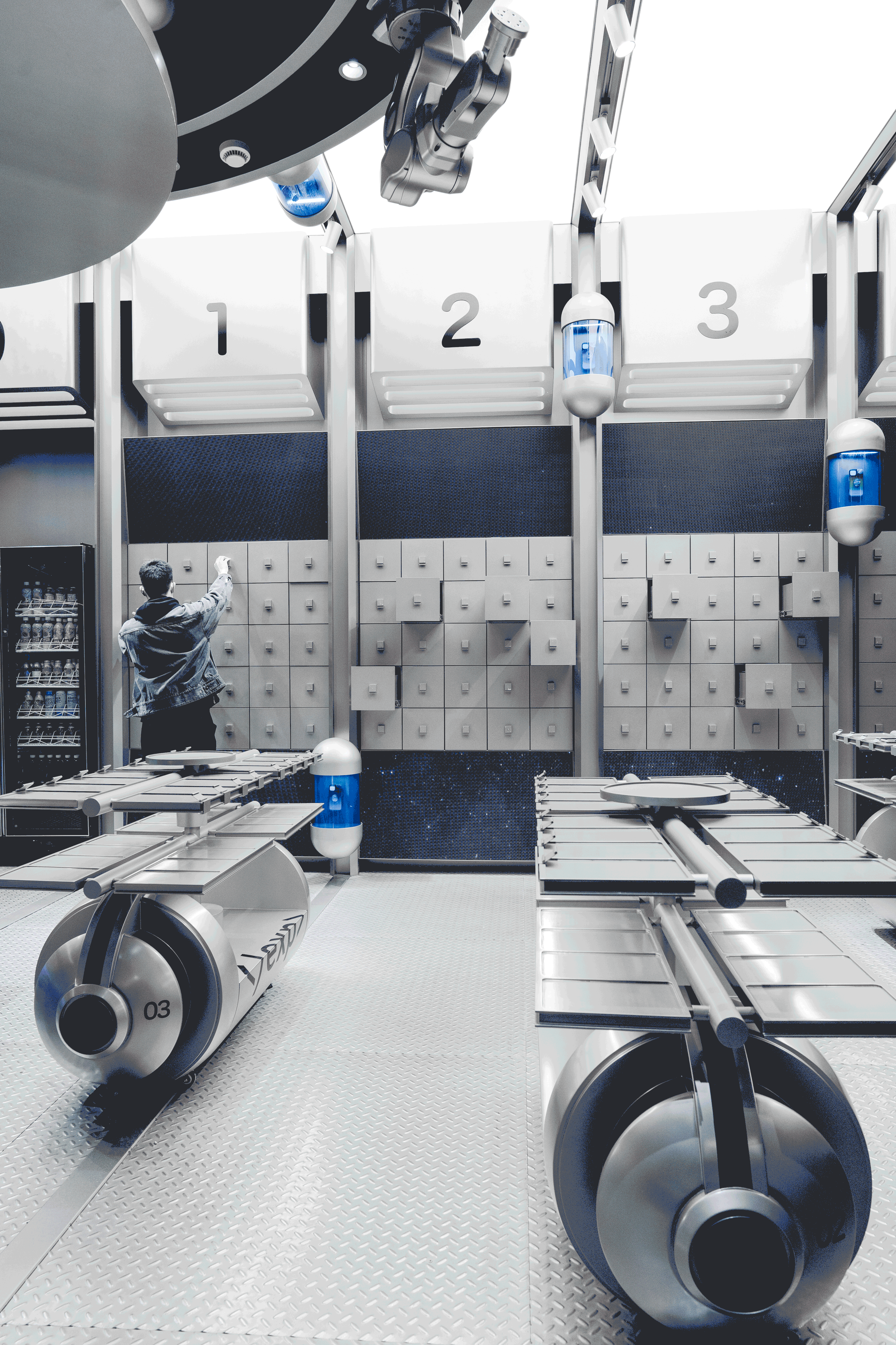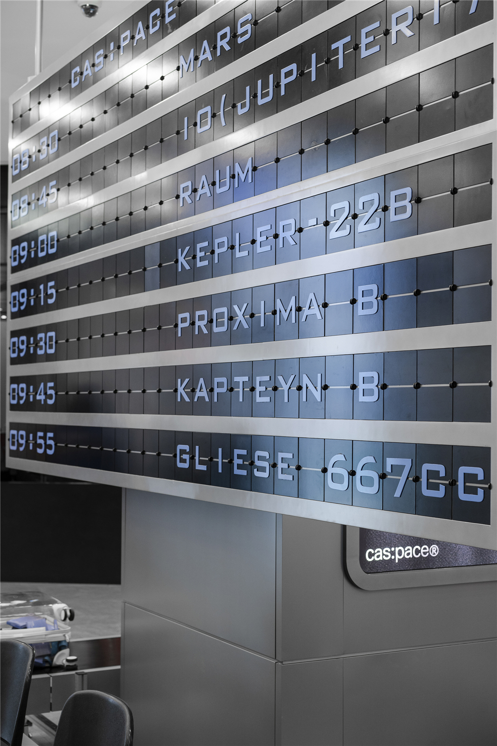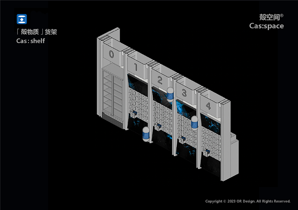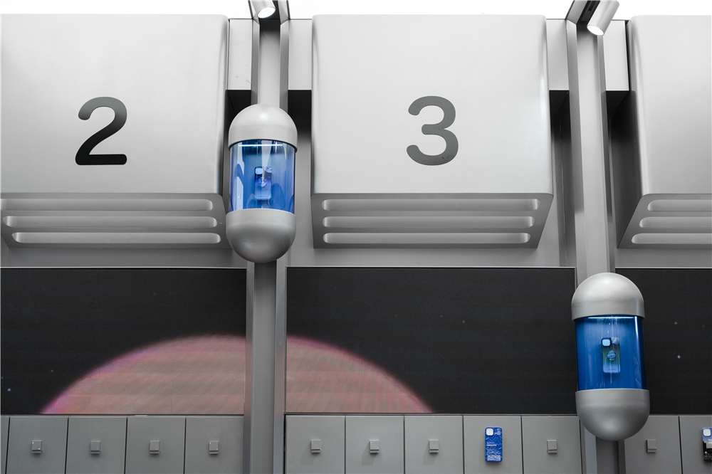 宇宙电梯是一个宏大的计划与构想,这次设计却是要把它融入到一个80㎡的空间中,是一件很有挑战的任务。最终我们把场景叙事设定到了宇宙电梯的起点。把我们产品定义为需要被运输的对象“殻物质”。它需要通过等候,安检,服务中心,运输等一系列场景与动作才能出发到终点。这样的流程也像极了一个产品从生产开始最终到消费者手中需要经历的层层关卡,从而让顾客能体验到最优质的产品。