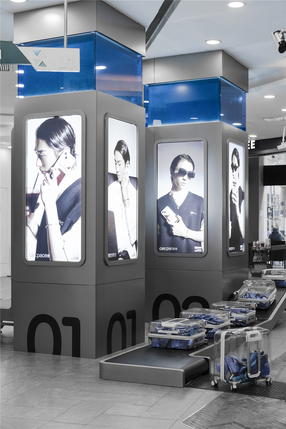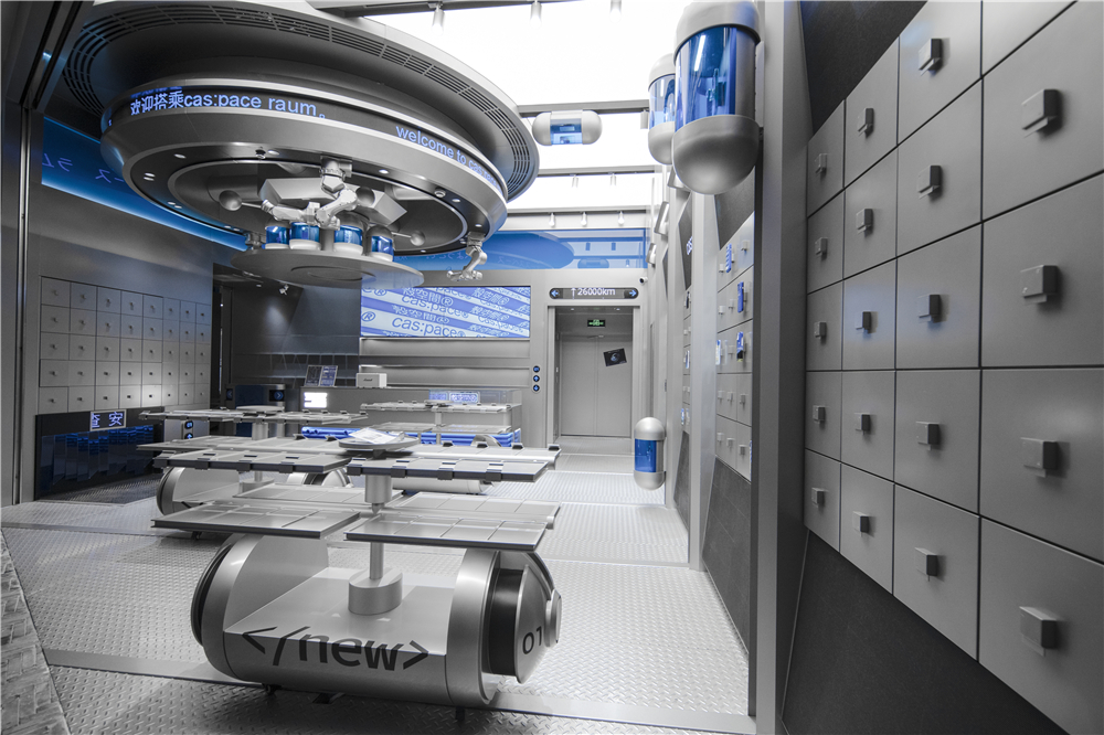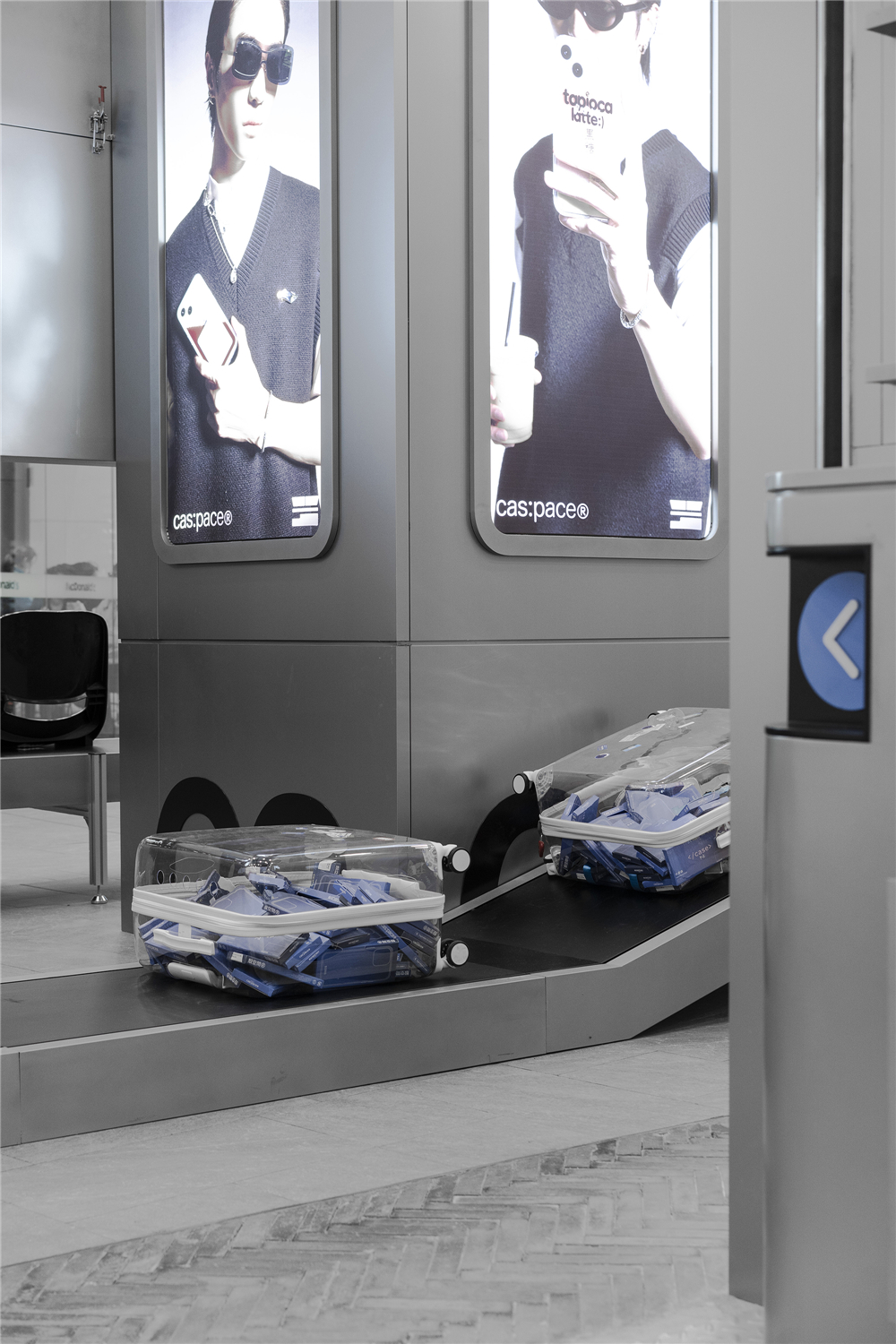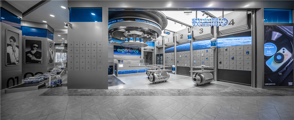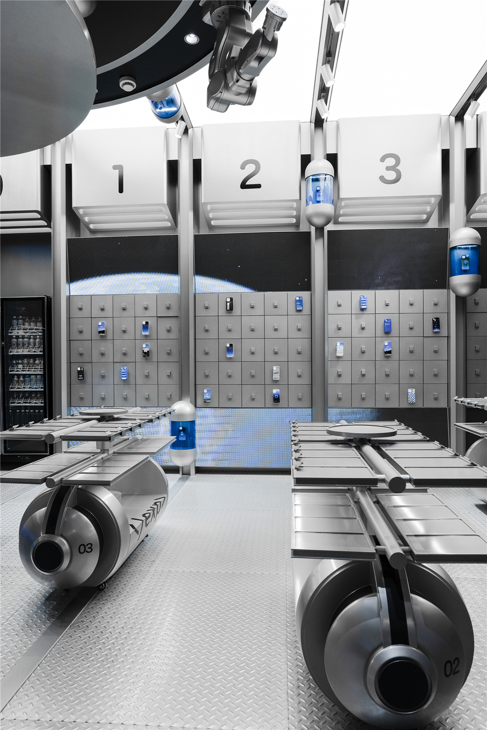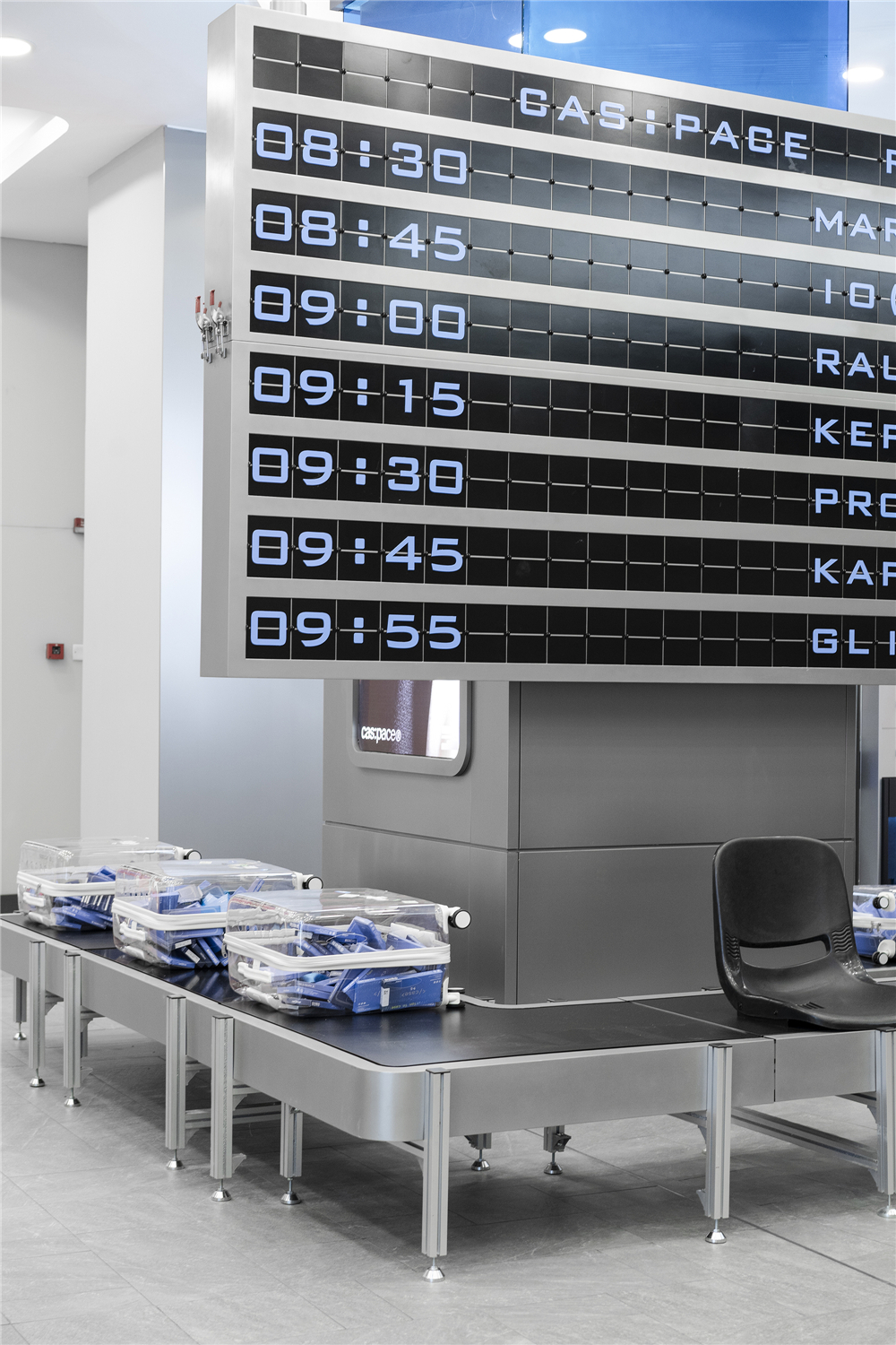 宇宙电梯是一个宏大的计划与构想,这次设计却是要把它融入到一个80㎡的空间中,是一件很有挑战的任务。最终我们把场景叙事设定到了宇宙电梯的起点。把我们产品定义为需要被运输的对象“殻物质”。它需要通过等候,安检,服务中心,运输等一系列场景与动作才能出发到终点。这样的流程也像极了一个产品从生产开始最终到消费者手中需要经历的层层关卡,从而让顾客能体验到最优质的产品。