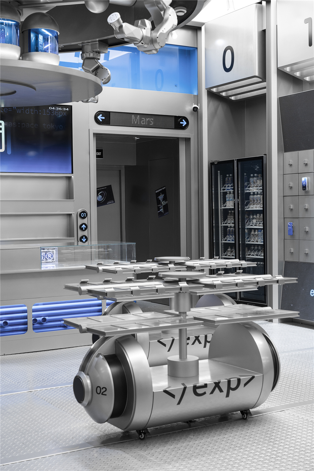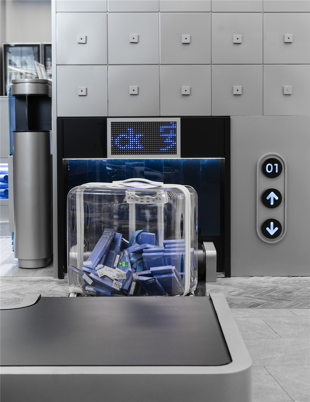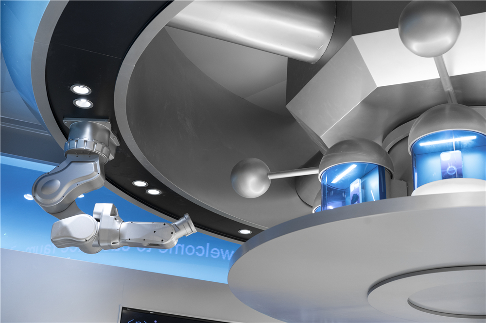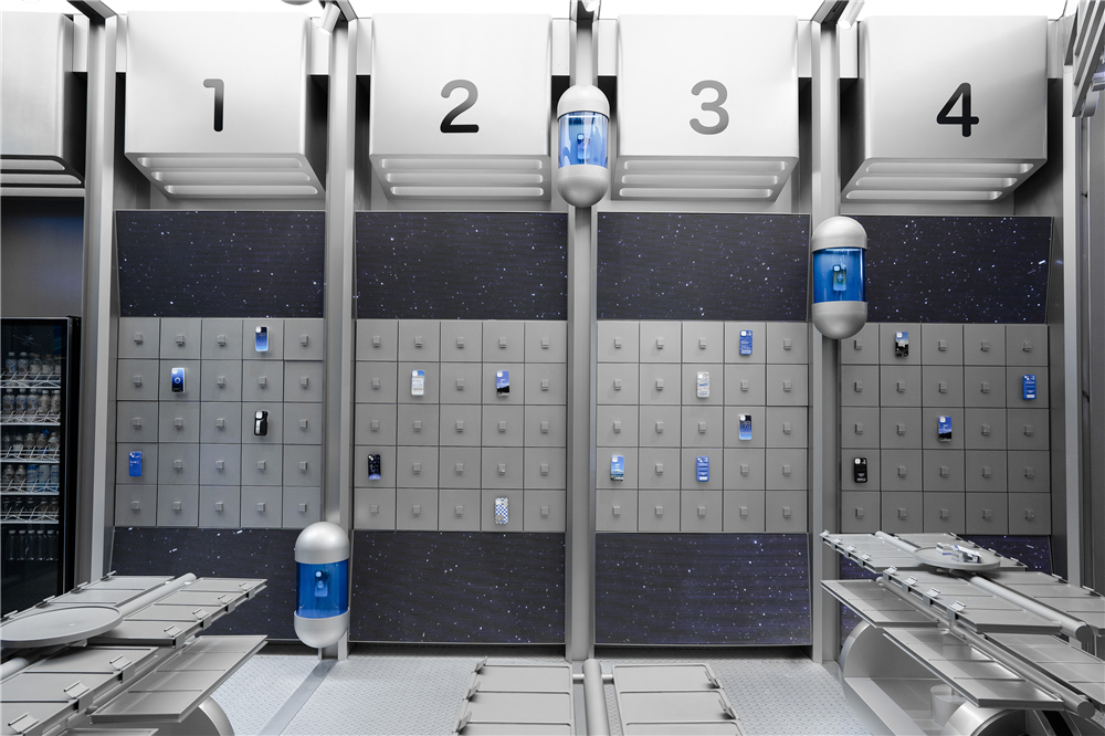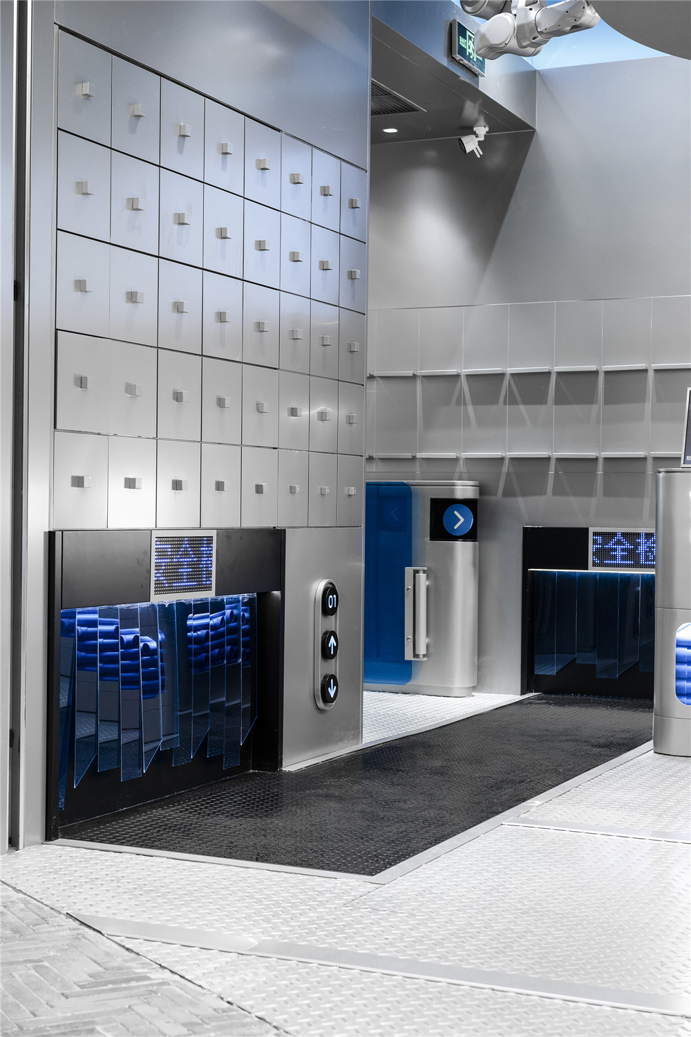 宇宙电梯是一个宏大的计划与构想,这次设计却是要把它融入到一个80㎡的空间中,是一件很有挑战的任务。最终我们把场景叙事设定到了宇宙电梯的起点。把我们产品定义为需要被运输的对象“殻物质”。它需要通过等候,安检,服务中心,运输等一系列场景与动作才能出发到终点。这样的流程也像极了一个产品从生产开始最终到消费者手中需要经历的层层关卡,从而让顾客能体验到最优质的产品。