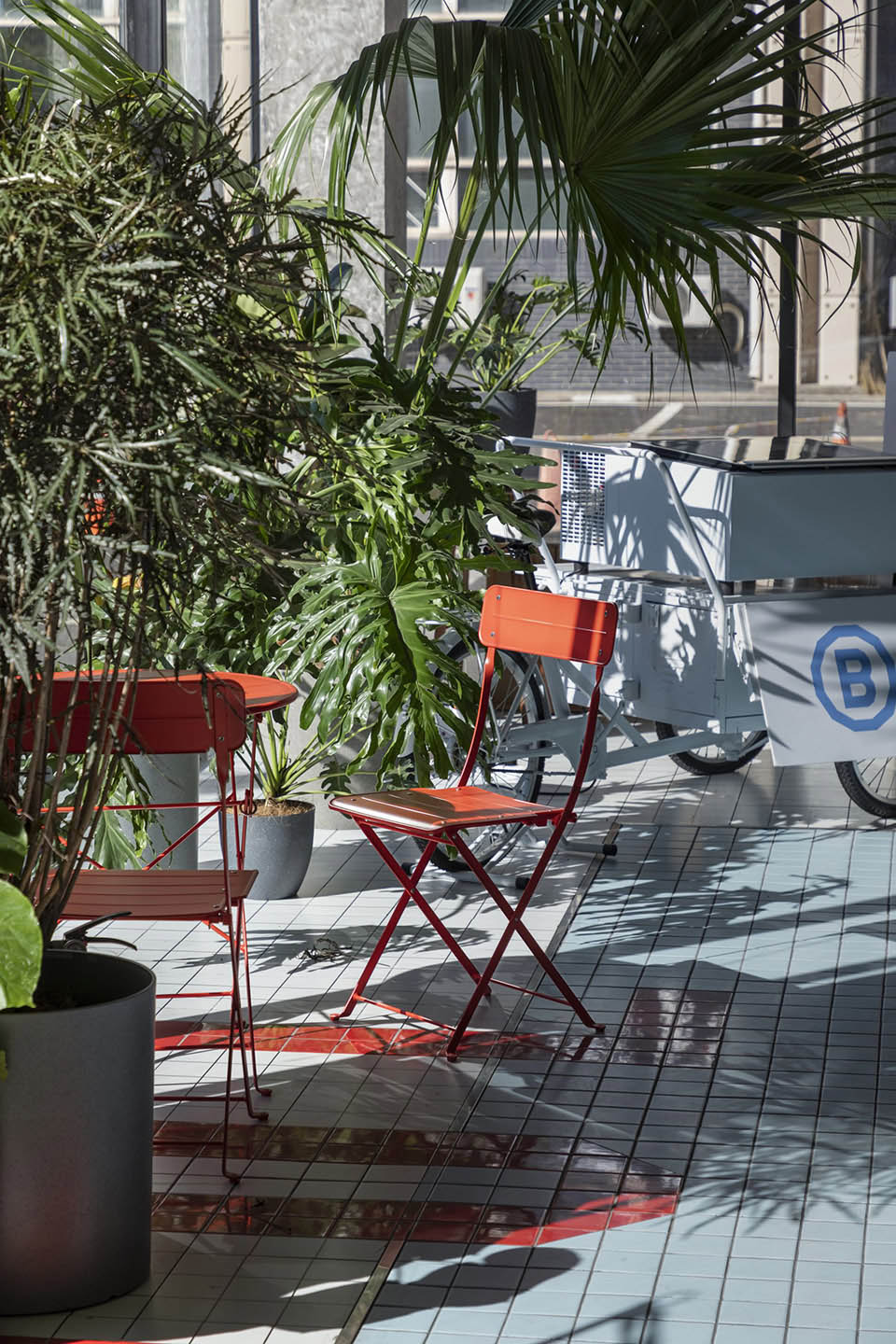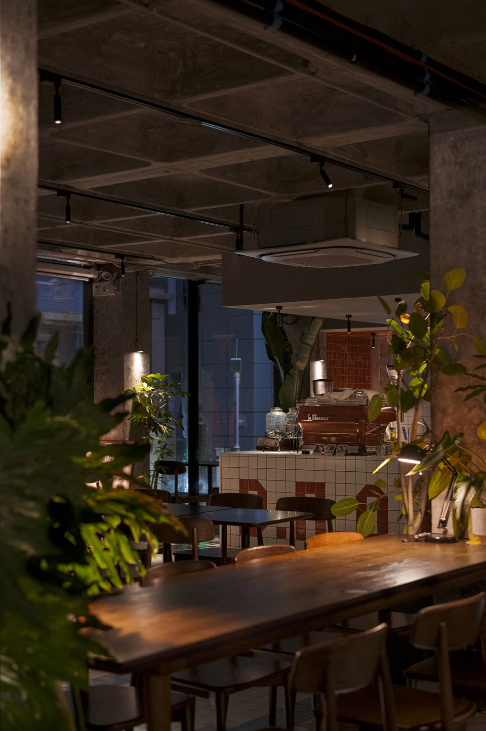 当穿过湛蓝海水和葱郁的绿植,从泳池的边缘向前直行,点餐区成为动线的交汇之处、消费行为的终点。吧台顶部的灯光是预设日咖夜酒的关键。灯光的透明、半透明与不透明性,它的反射与折射性,会激发出某种富于表现力的特质,这些元素营造出了具有精神堡垒的强烈感受,采光的同时模糊室内外的界限,使室内外空间再一定程度上相融。