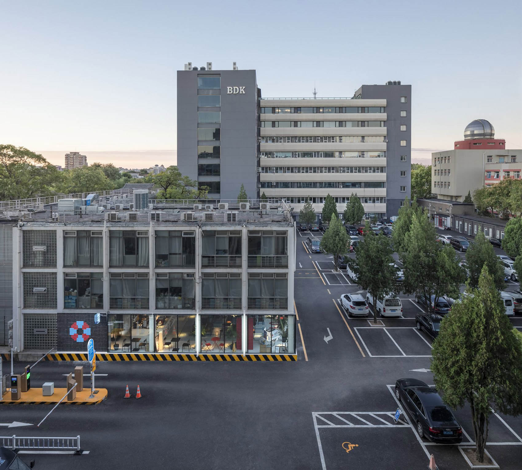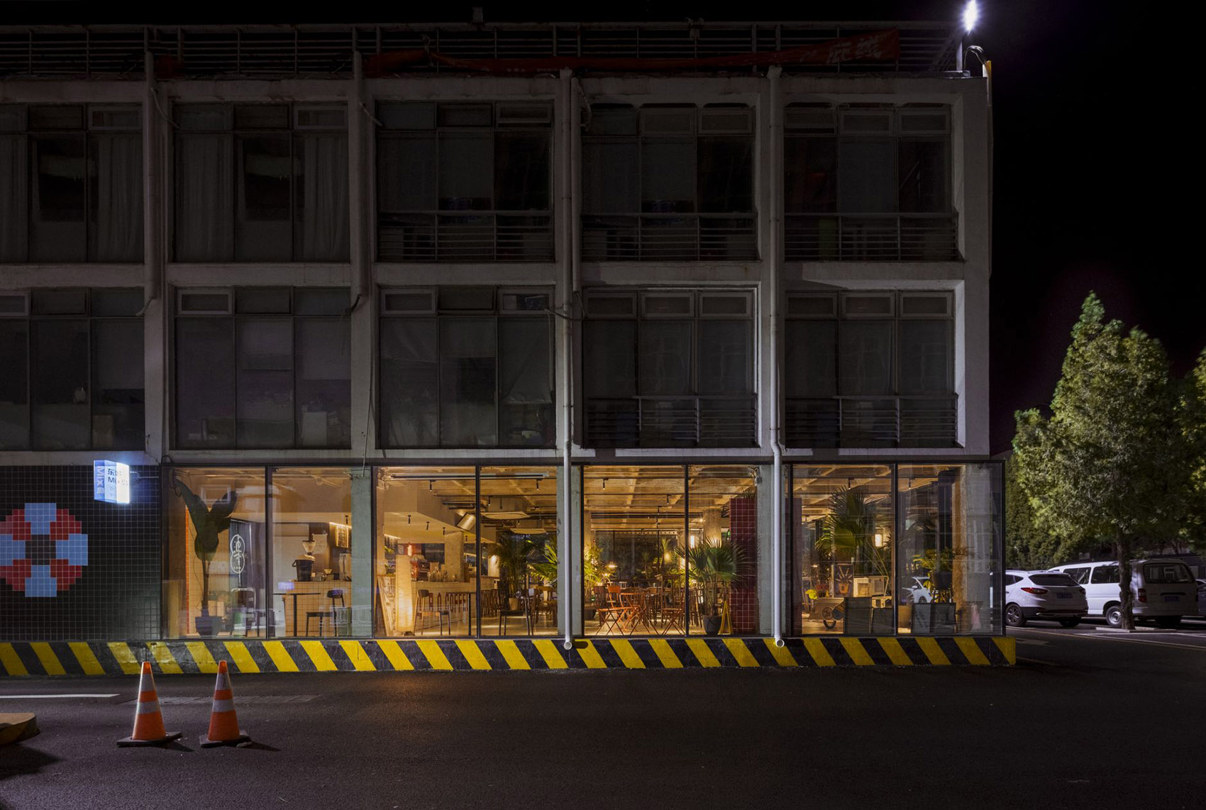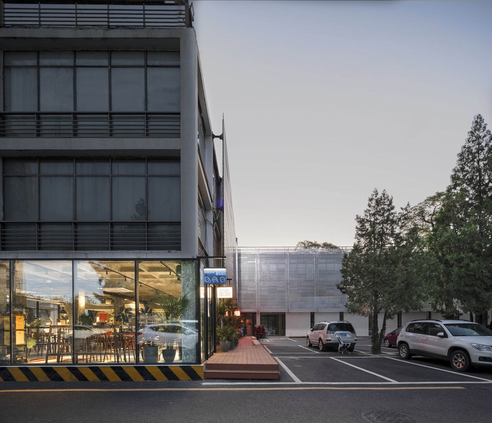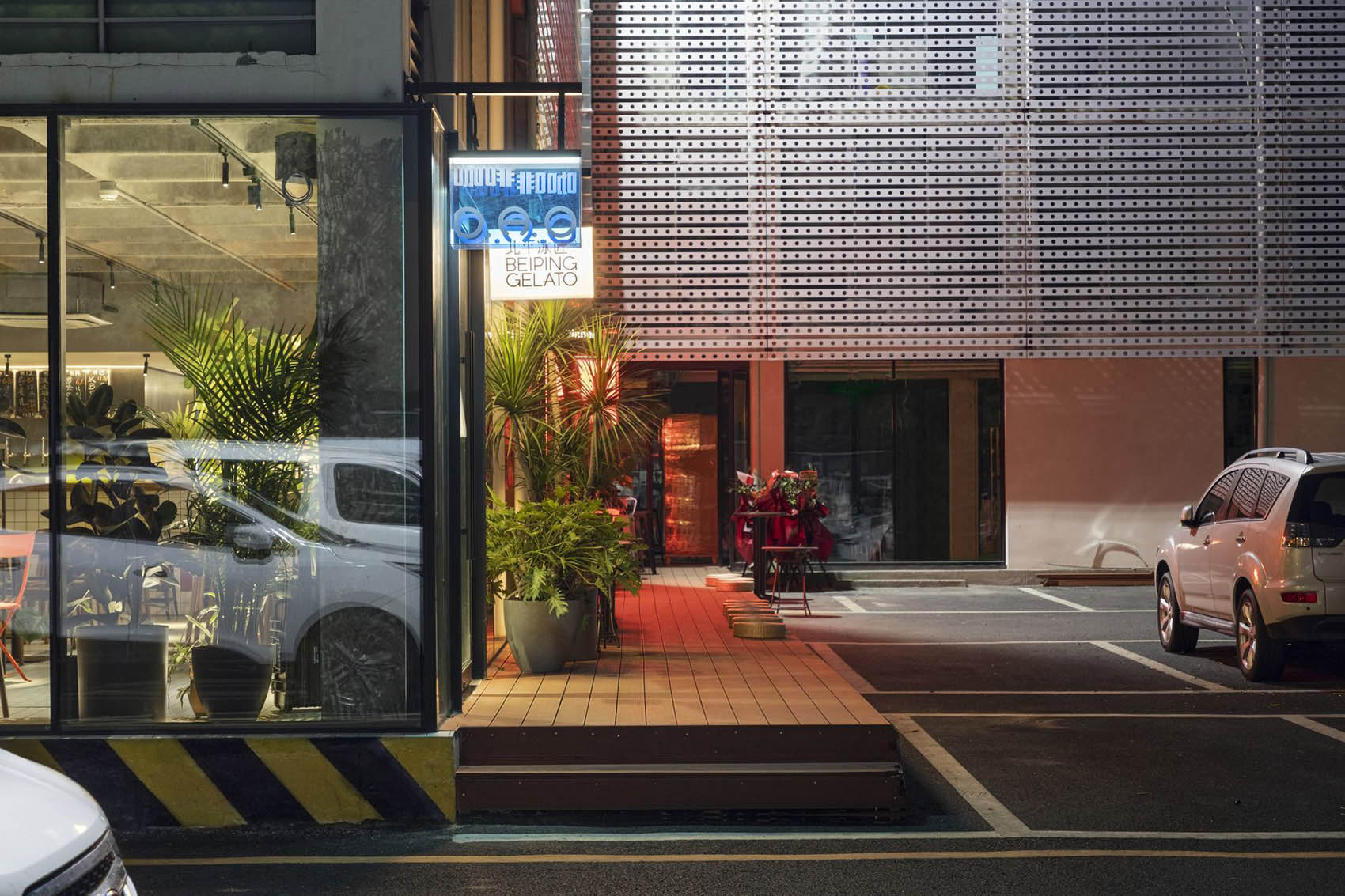 东城Mix岛原址本身是一栋3层高办公楼的一楼架空层,临近园区停车场及入口护栏,以此为场地基础,我们小范围改造内部,创造一个停车便利,满足周边社交、工作等公共活动和交流的日咖夜酒空间。