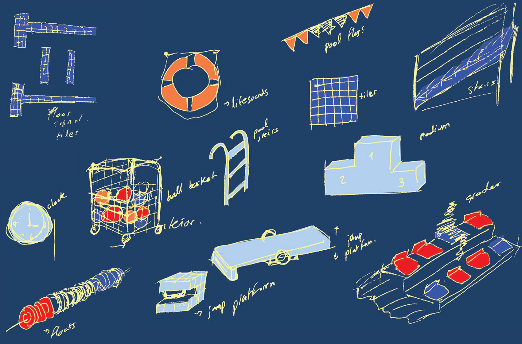 仪式感是最为直接的视觉符号,能够清晰地表达出设计者的逻辑概念。本案内,立面中使用的游泳圈元素成为对场域性格的第一眼印象。原始基础地台被粉刷成醒目的警戒线符号,与停车场空间形成呼应。通透的玻璃幕墙引入自然光线,将室内向周围环境敞开,让内与外有更多视觉交流。这种将内部的活动场景置入公共空间的手法,会自然而然的吸引来访者走进泳池一探究竟。