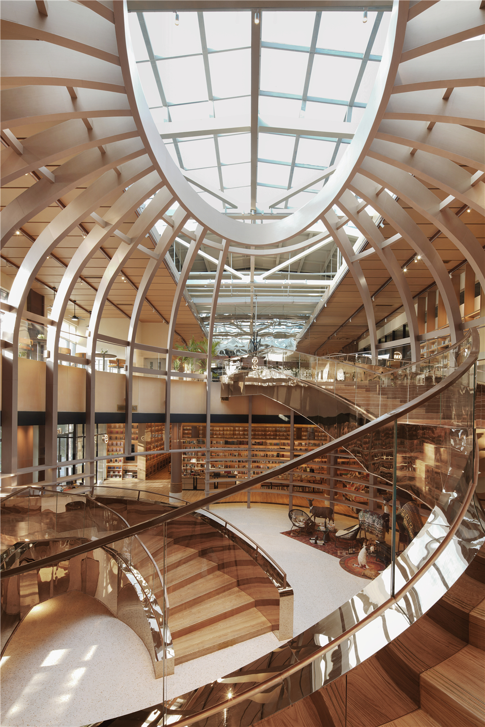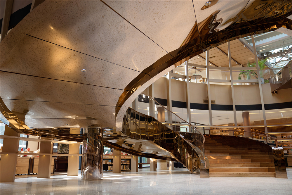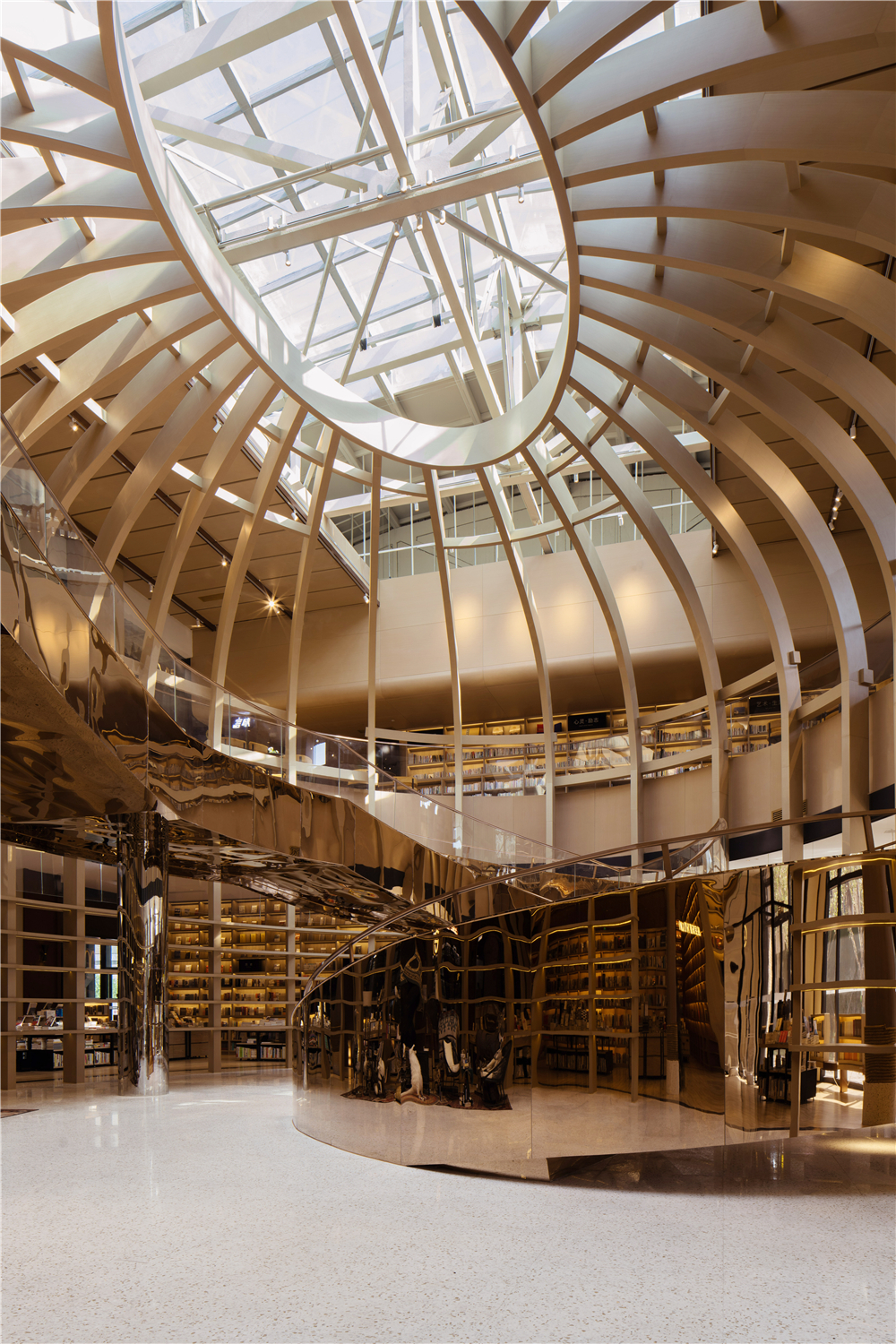 旋转楼梯在动态感与跃升、舒展间,如知识天梯般游弋半空,赋予项目独特的IP符号。黄铜镜面不锈钢与木质阶梯的搭配,营造震撼的视觉张力与空间层次感。