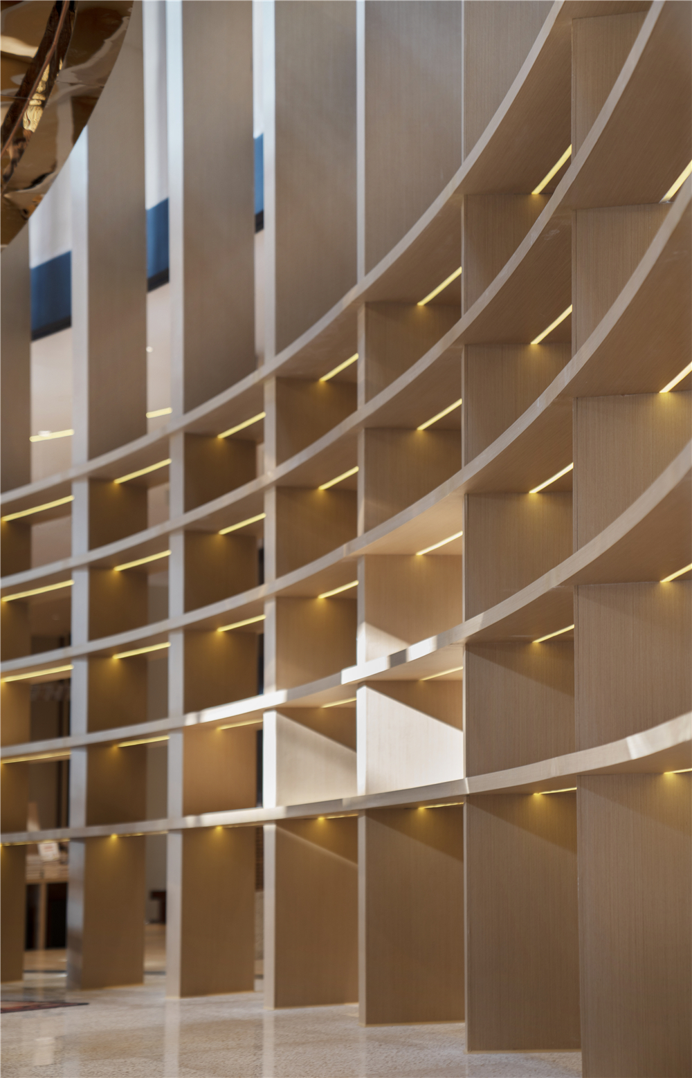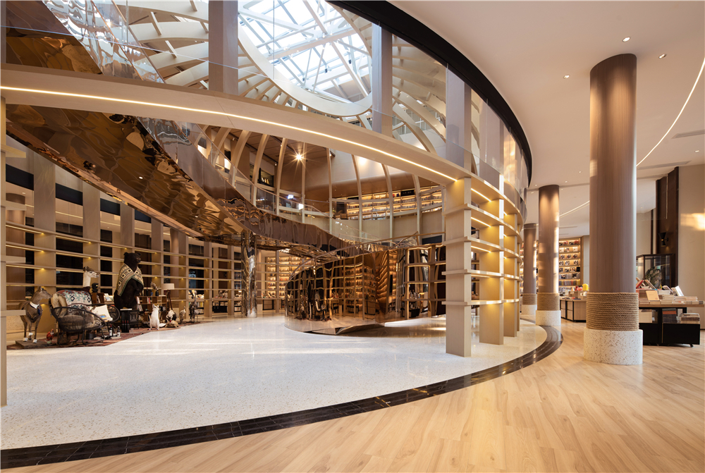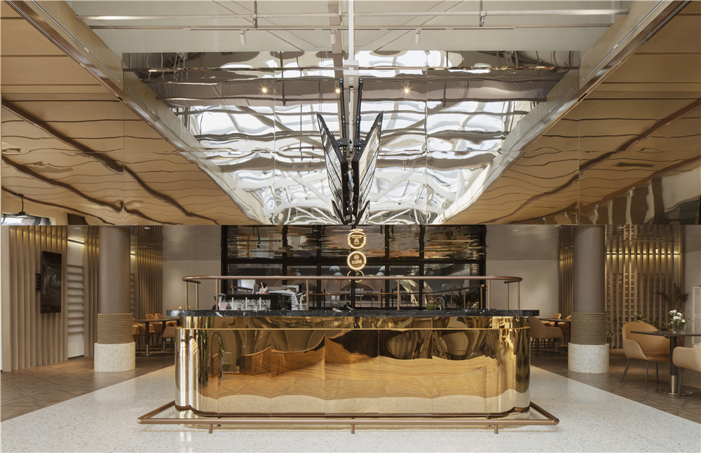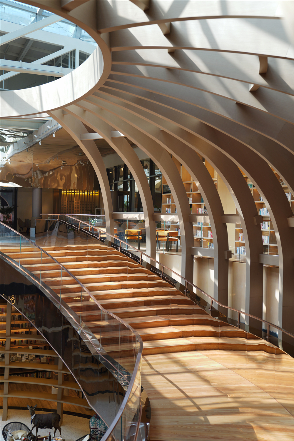 旋转楼梯在动态感与跃升、舒展间,如知识天梯般游弋半空,赋予项目独特的IP符号。黄铜镜面不锈钢与木质阶梯的搭配,营造震撼的视觉张力与空间层次感。