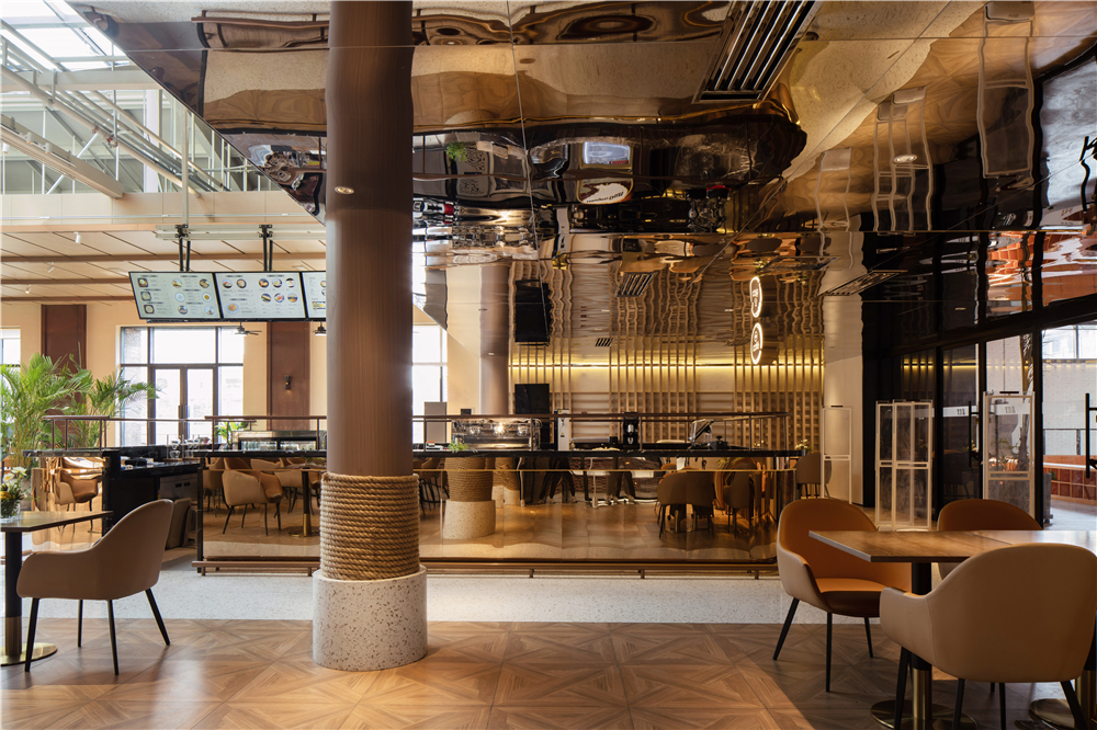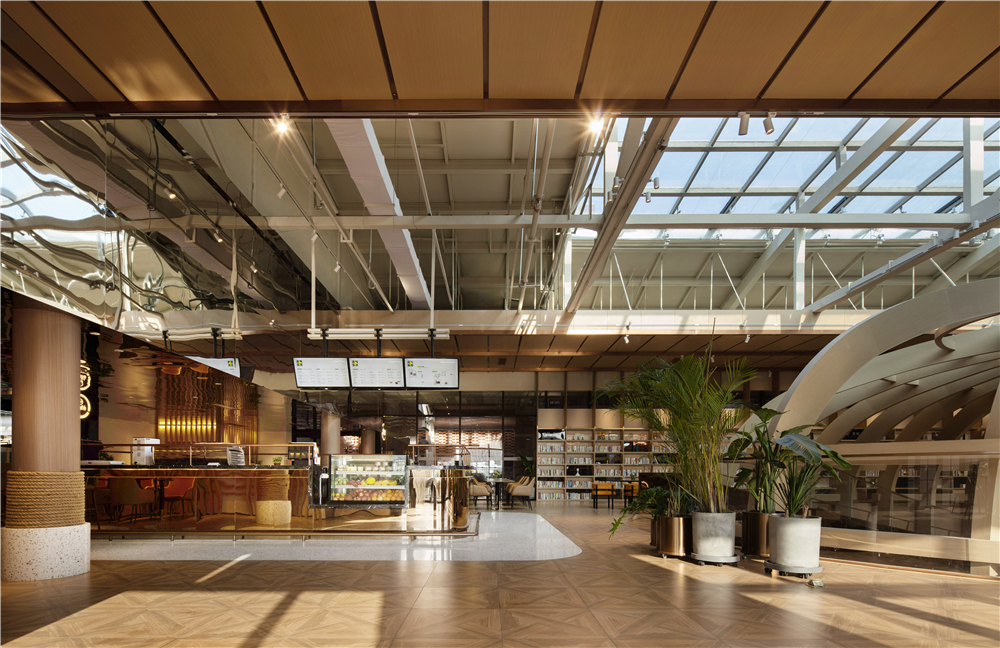 室内以木与铜等承载着工业记忆的材质来回应砖石结构的厂房框架,砖墙与玻璃,一面工业,一面艺术,舒适温馨的场景营造打造文化复合商业独有的“自洽与松弛”,成为年轻人的城市心灵休憩地。