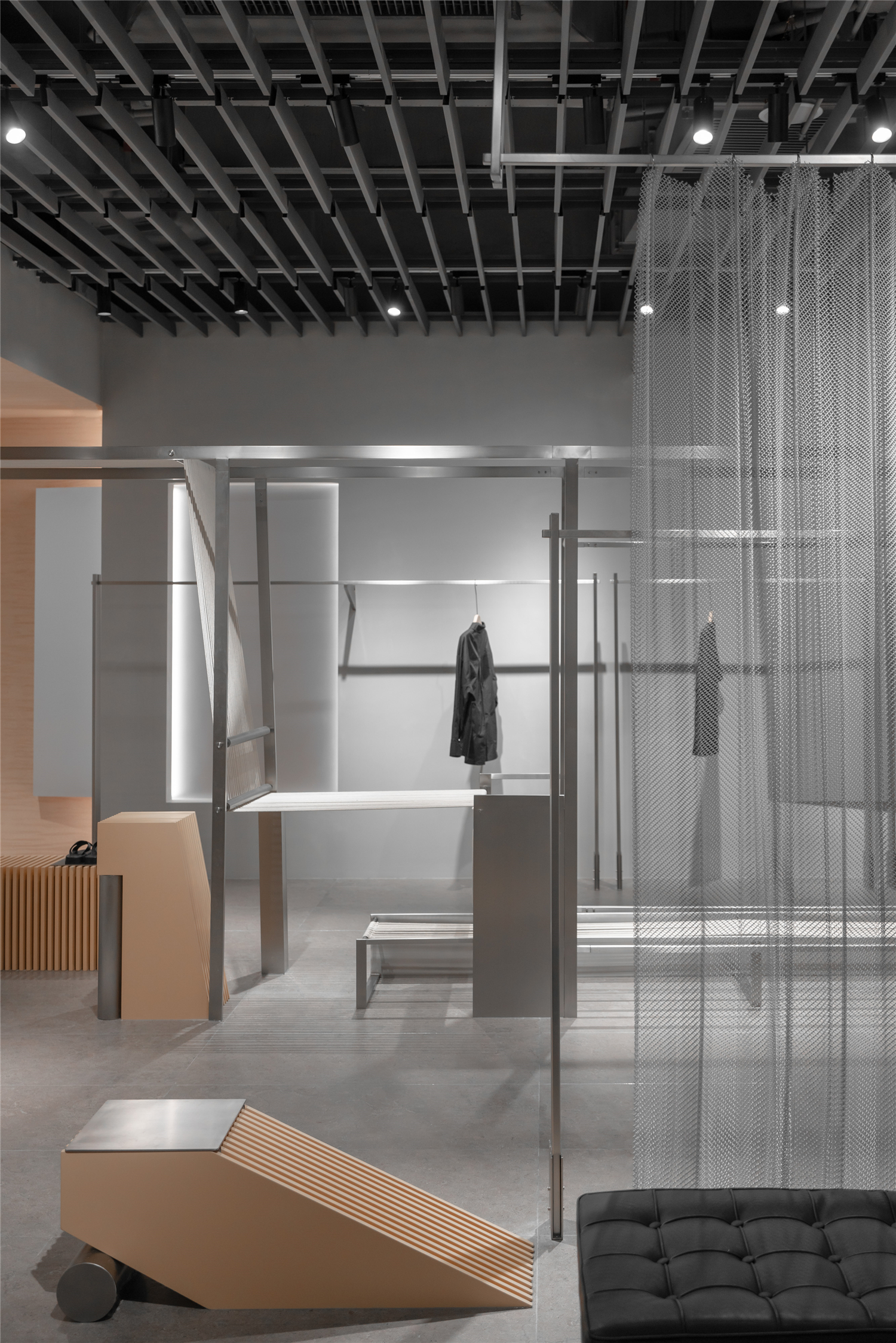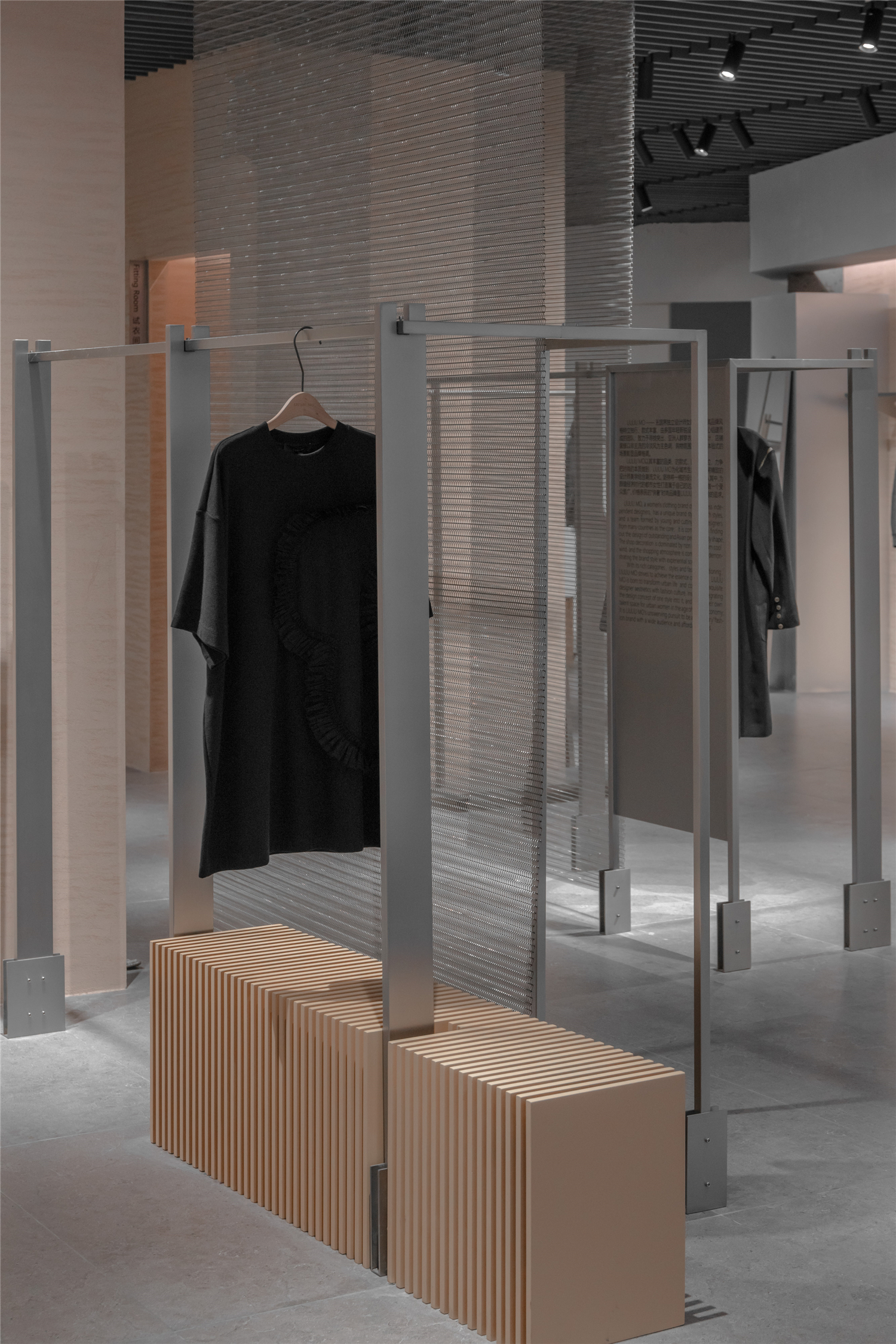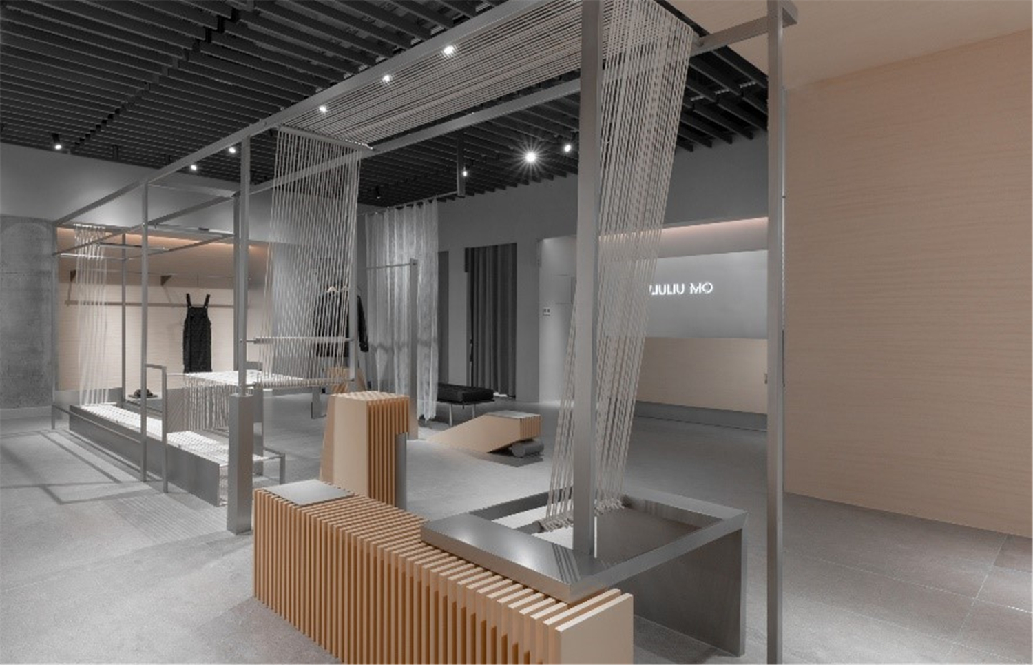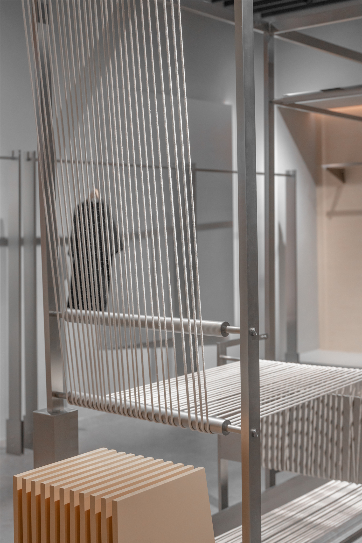 而负型之外的销售展示部分则以岛台为中心,形成环绕型的动线。中岛的展示道具利用绳索,不锈钢板与金属织网等现代工业材料,以抽象化的方式转译传统织布机与纱帘。暗喻服装纺织行业从传统的手工制造业到现在的工业化生产,再到智能制造的过程。