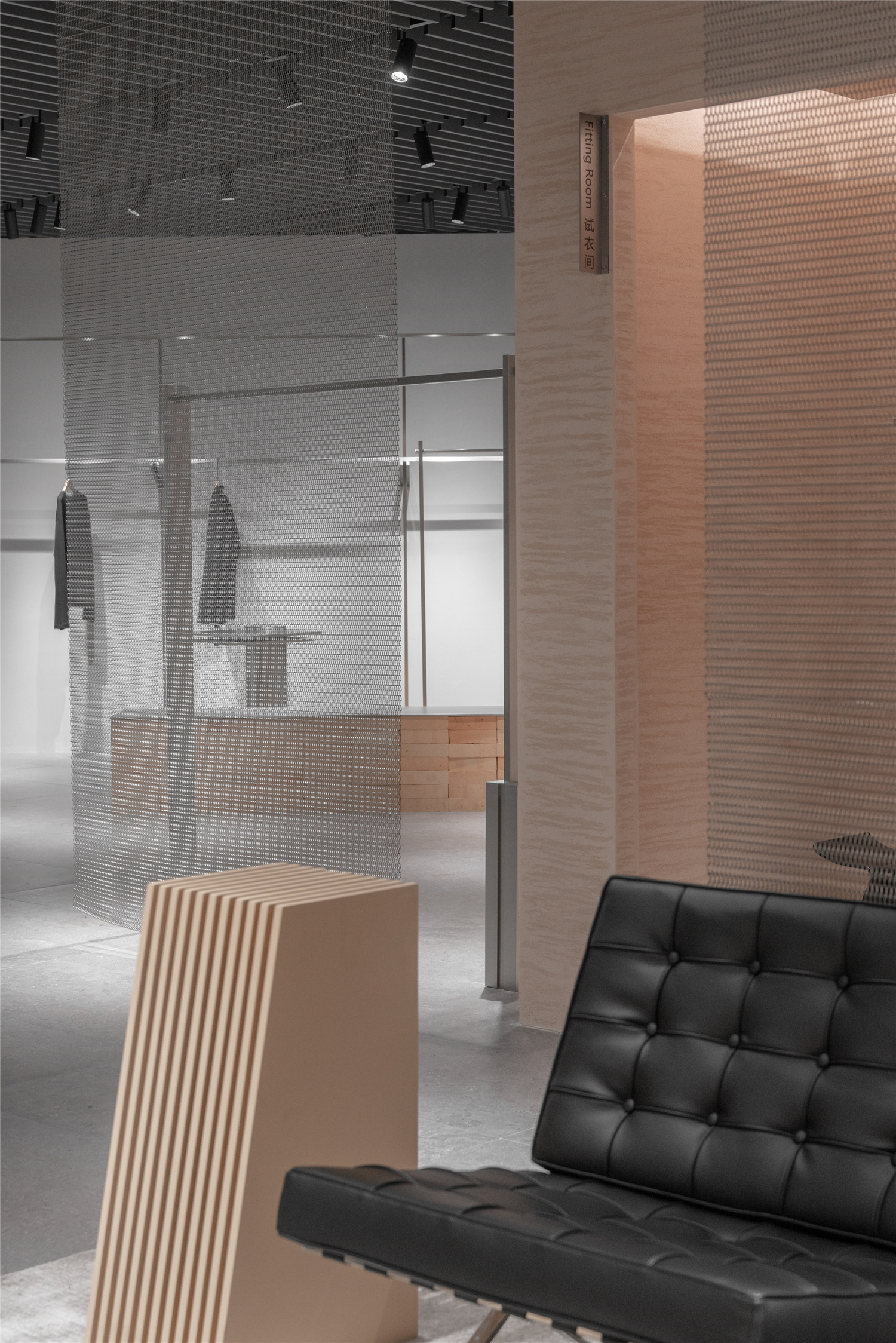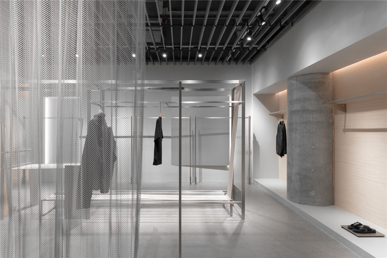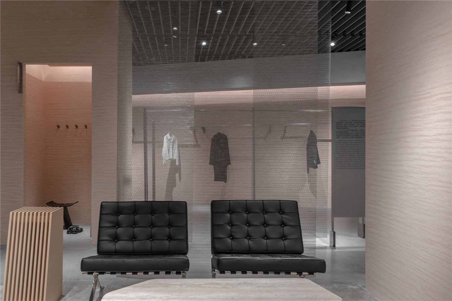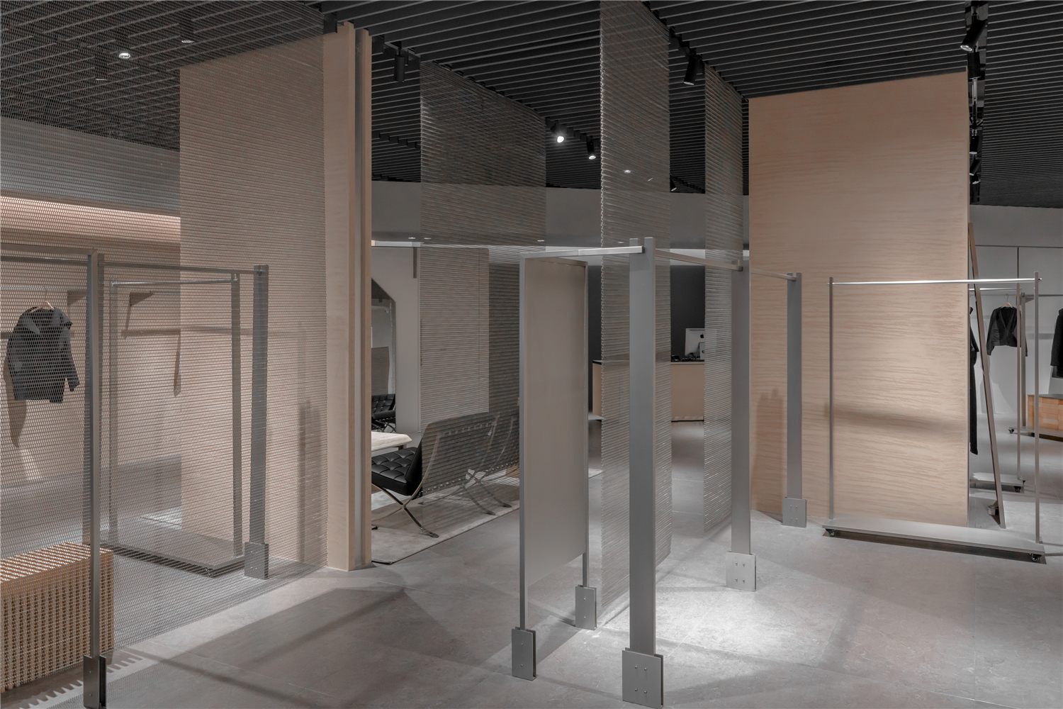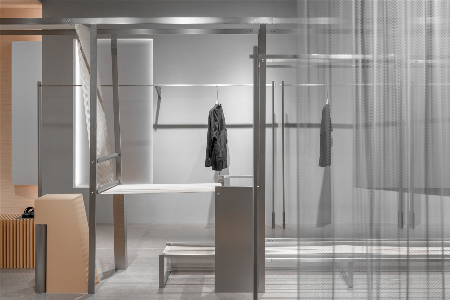 而负型之外的销售展示部分则以岛台为中心,形成环绕型的动线。中岛的展示道具利用绳索,不锈钢板与金属织网等现代工业材料,以抽象化的方式转译传统织布机与纱帘。暗喻服装纺织行业从传统的手工制造业到现在的工业化生产,再到智能制造的过程。