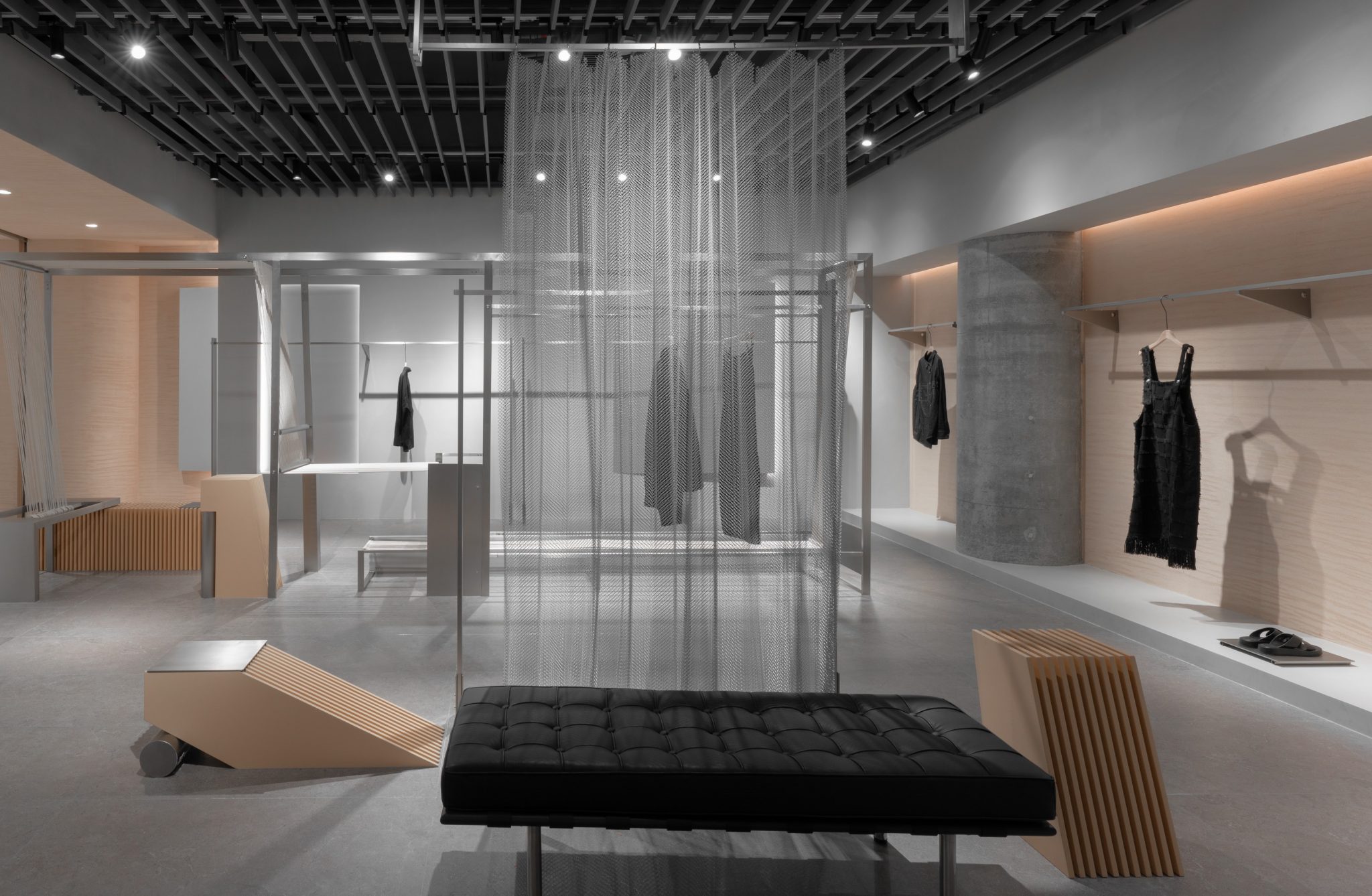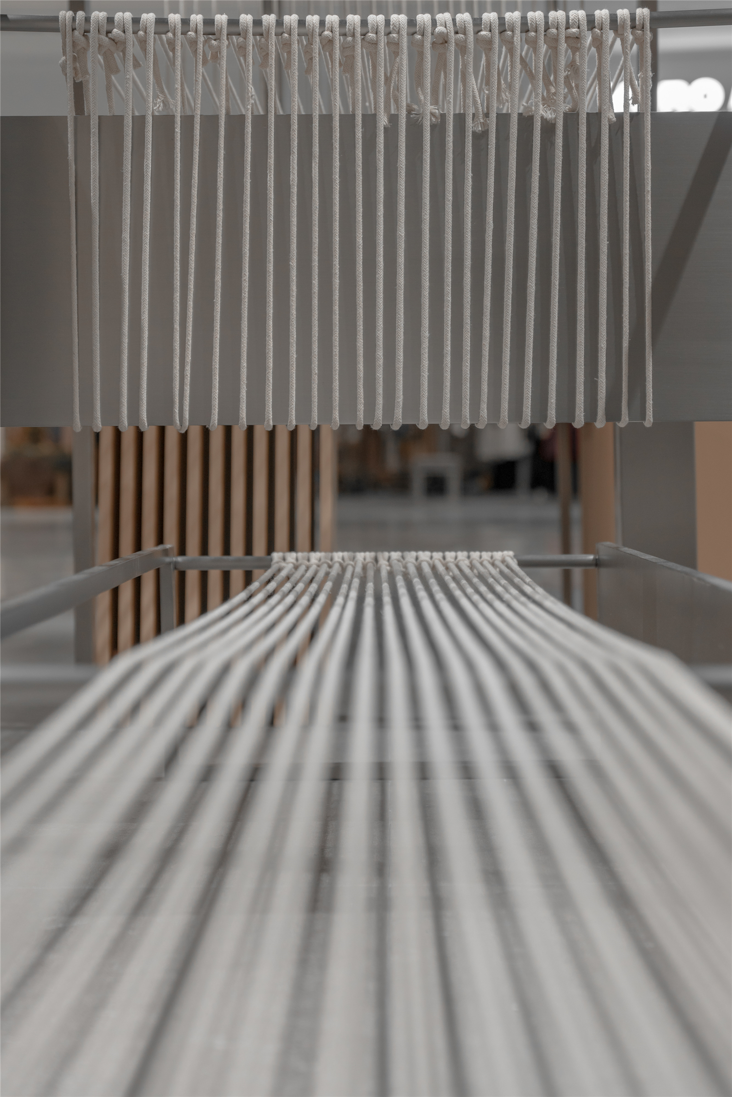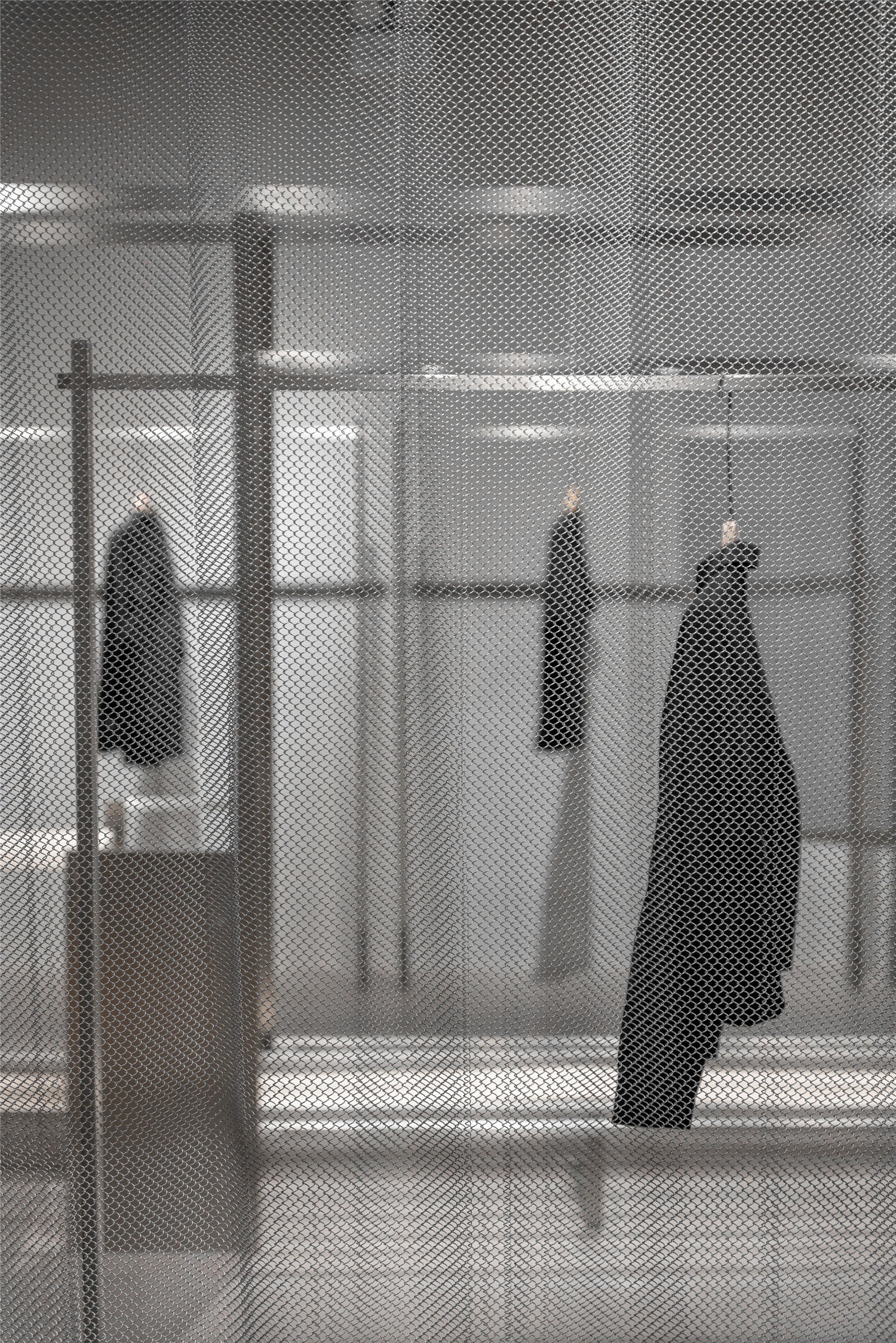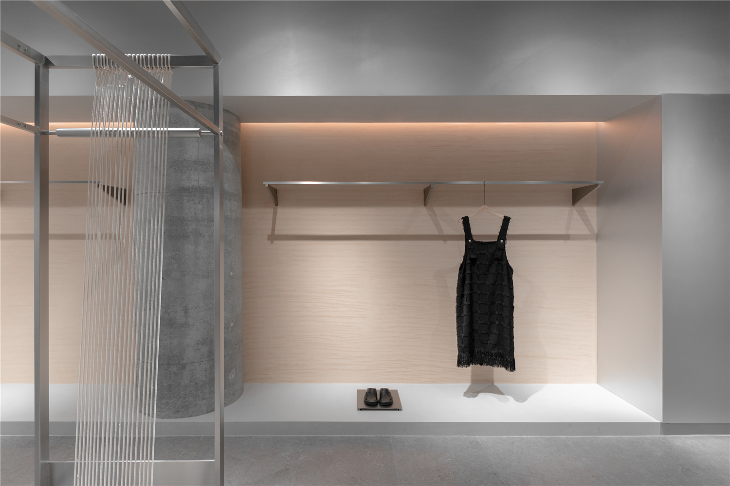 而负型之外的销售展示部分则以岛台为中心,形成环绕型的动线。中岛的展示道具利用绳索,不锈钢板与金属织网等现代工业材料,以抽象化的方式转译传统织布机与纱帘。暗喻服装纺织行业从传统的手工制造业到现在的工业化生产,再到智能制造的过程。