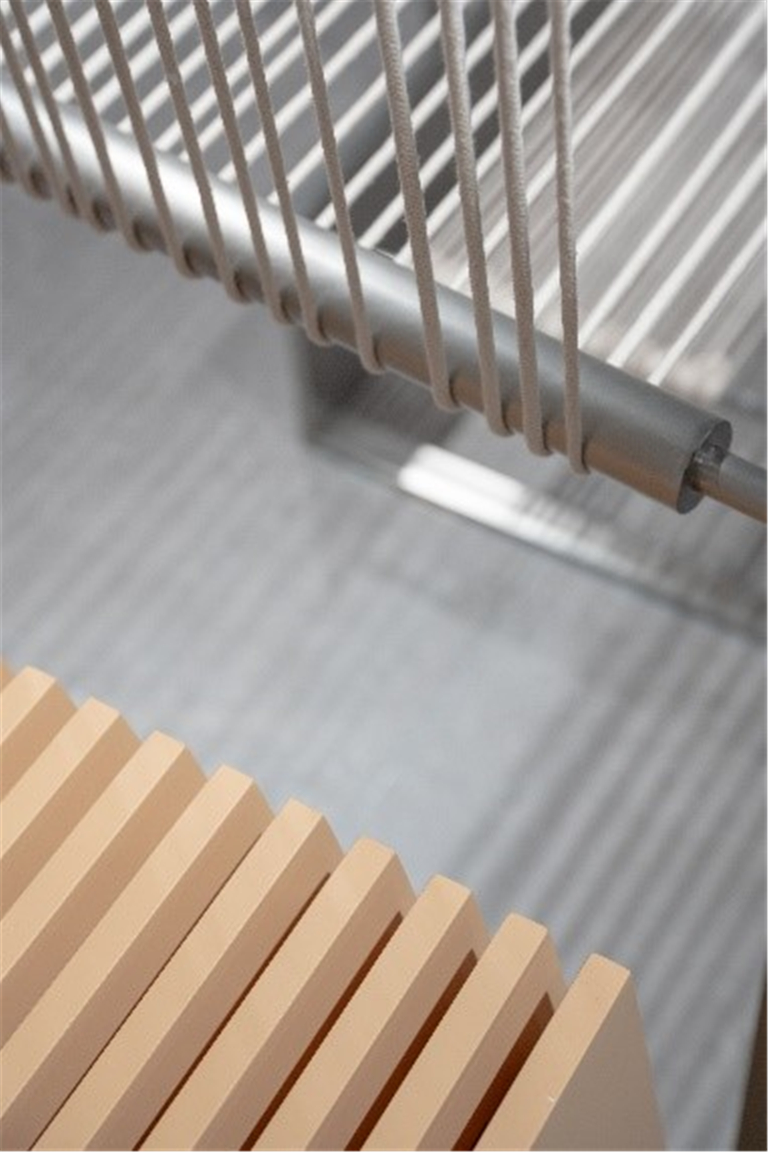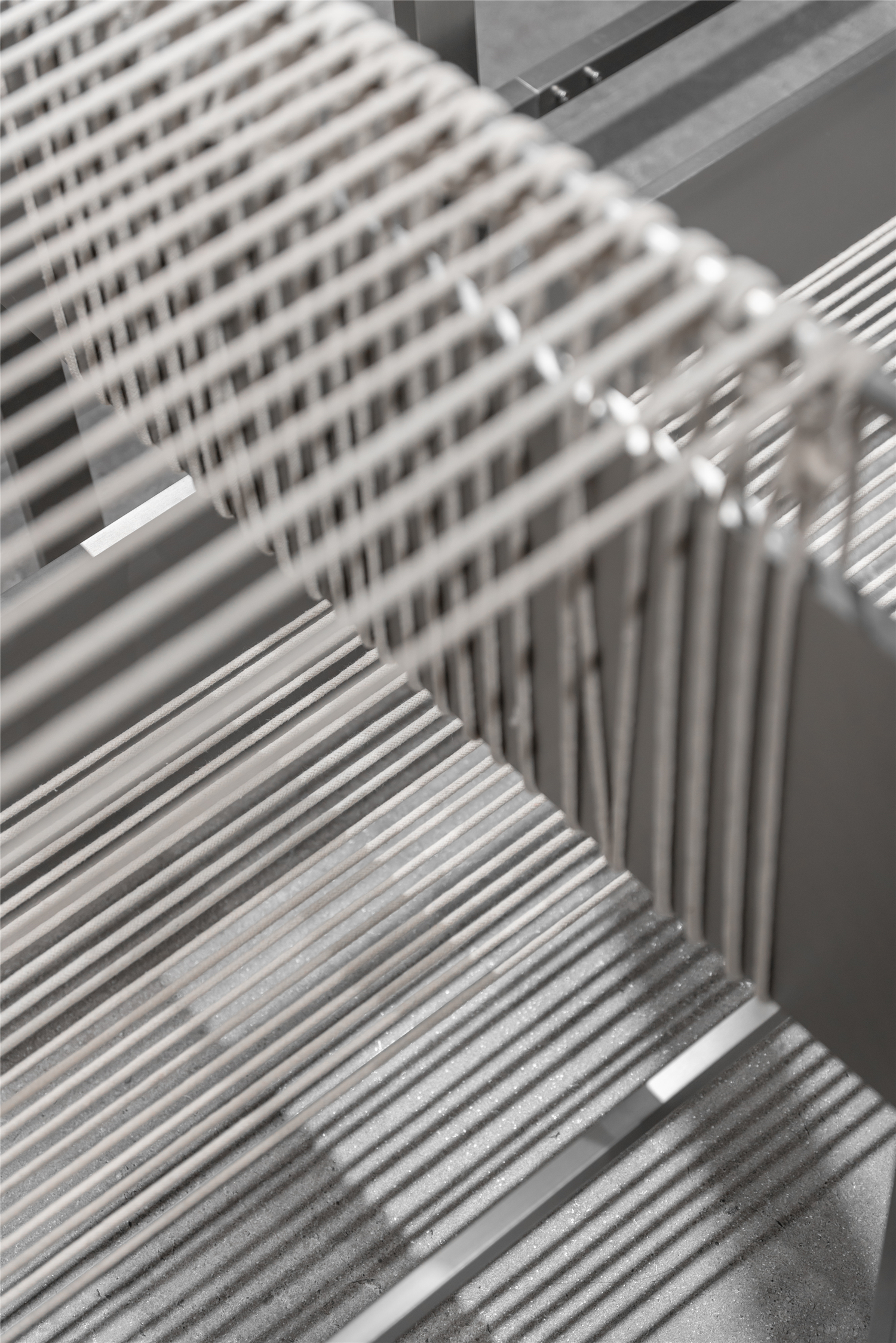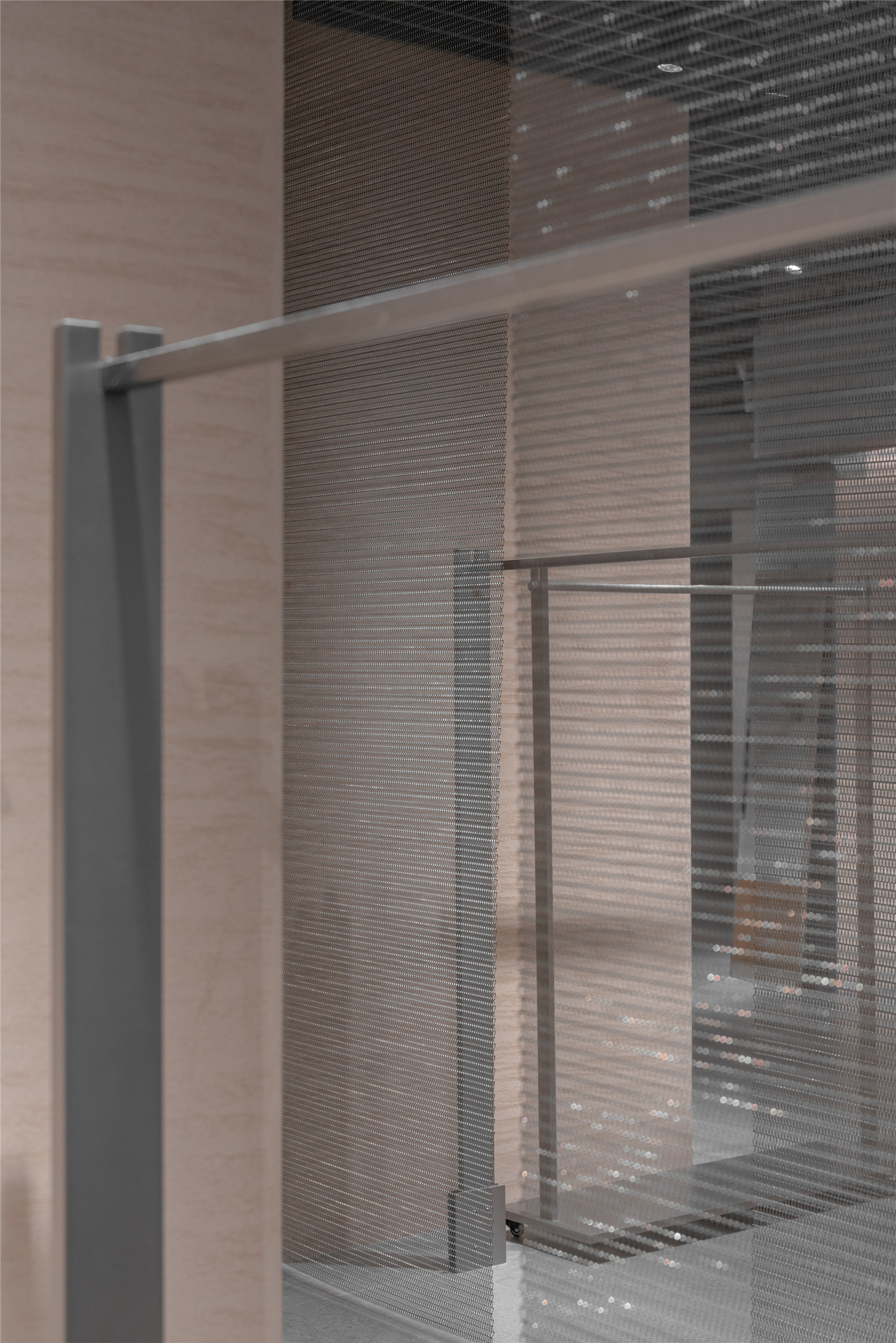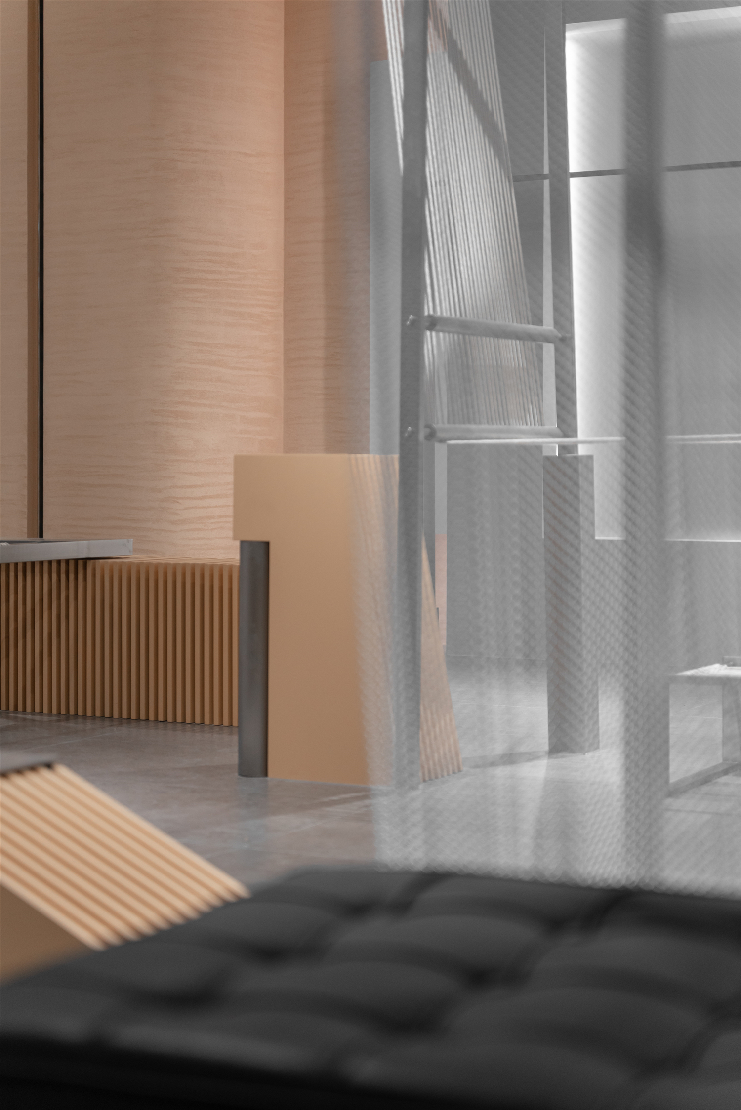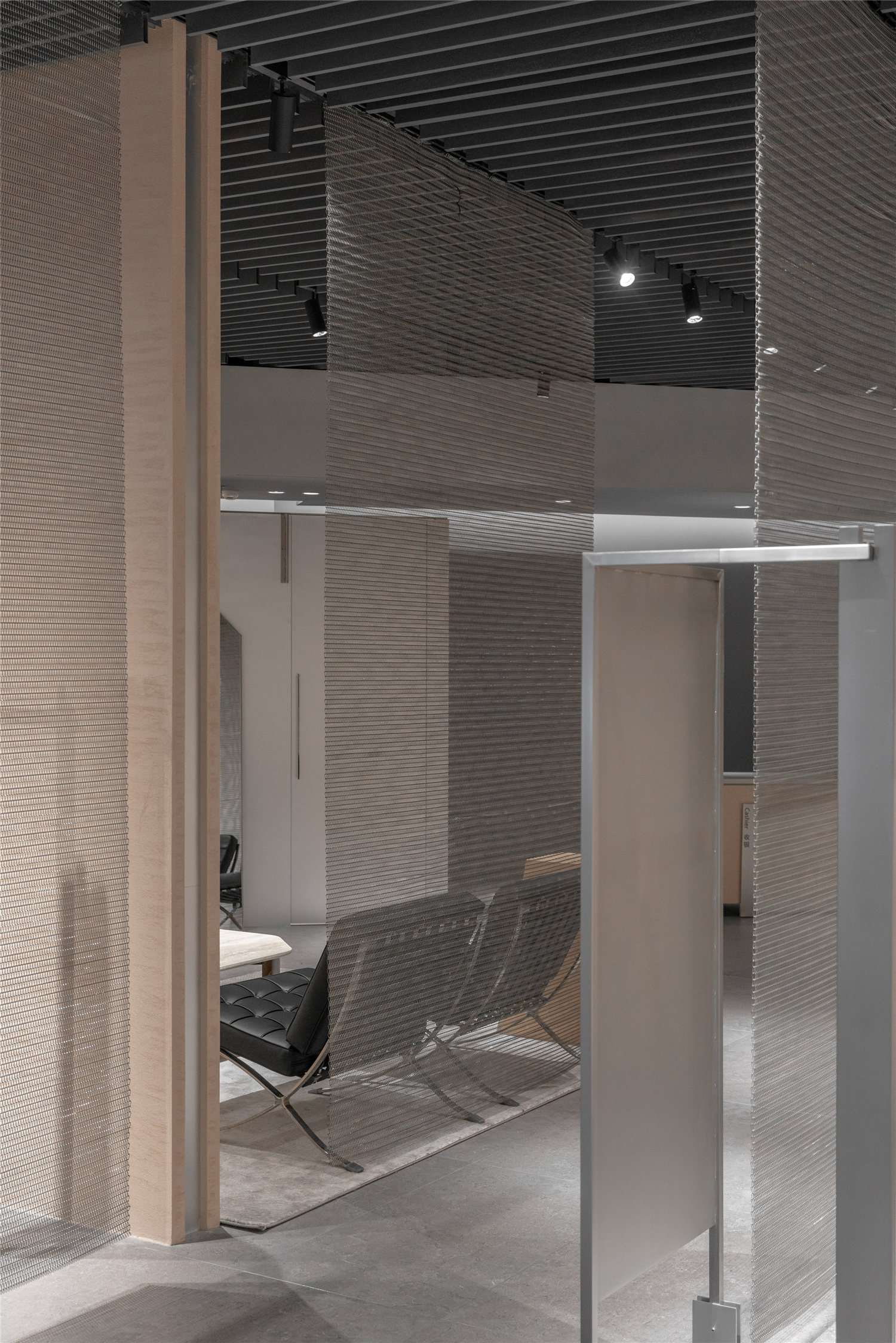 而负型之外的销售展示部分则以岛台为中心,形成环绕型的动线。中岛的展示道具利用绳索,不锈钢板与金属织网等现代工业材料,以抽象化的方式转译传统织布机与纱帘。暗喻服装纺织行业从传统的手工制造业到现在的工业化生产,再到智能制造的过程。