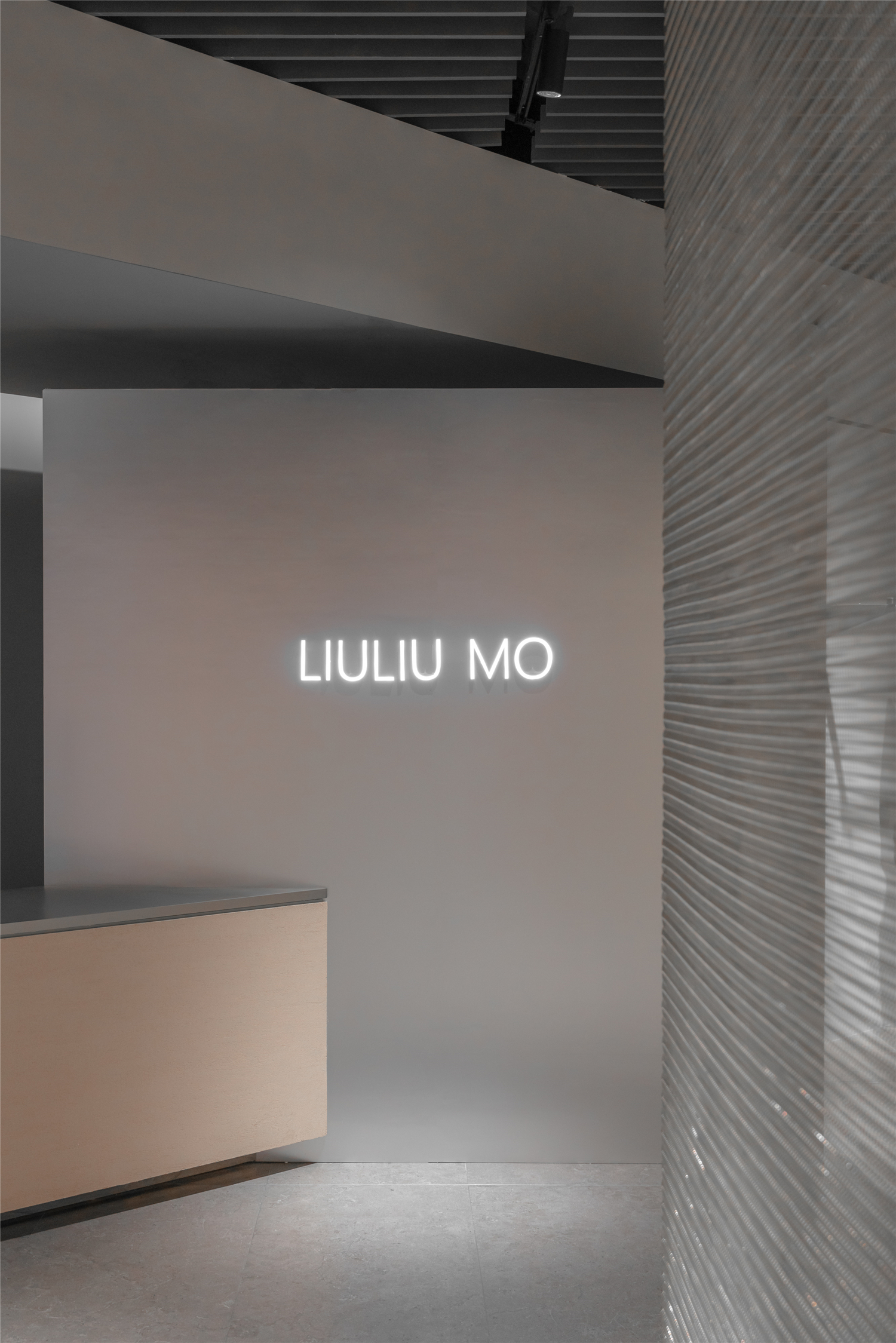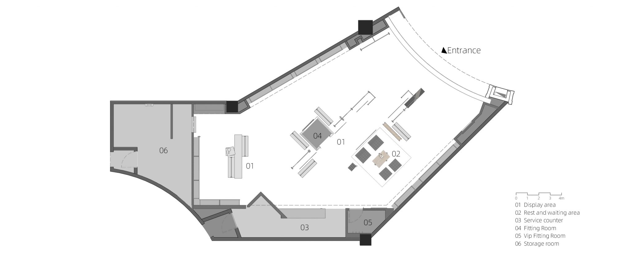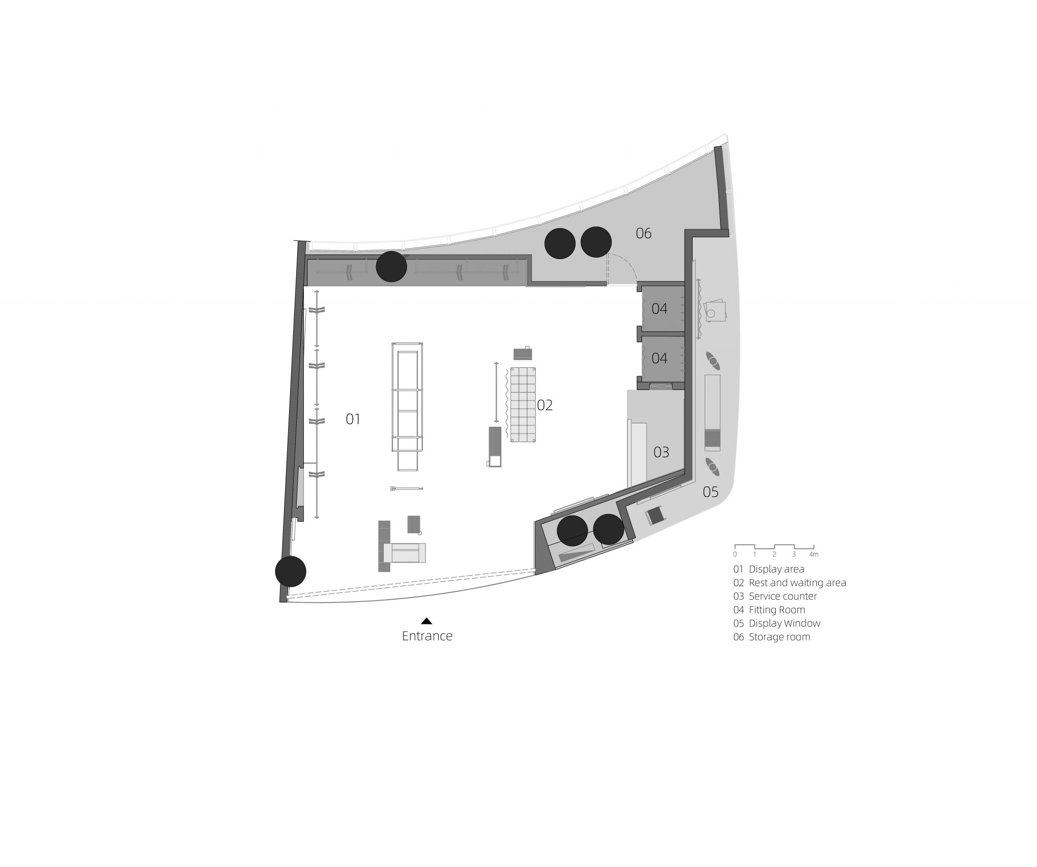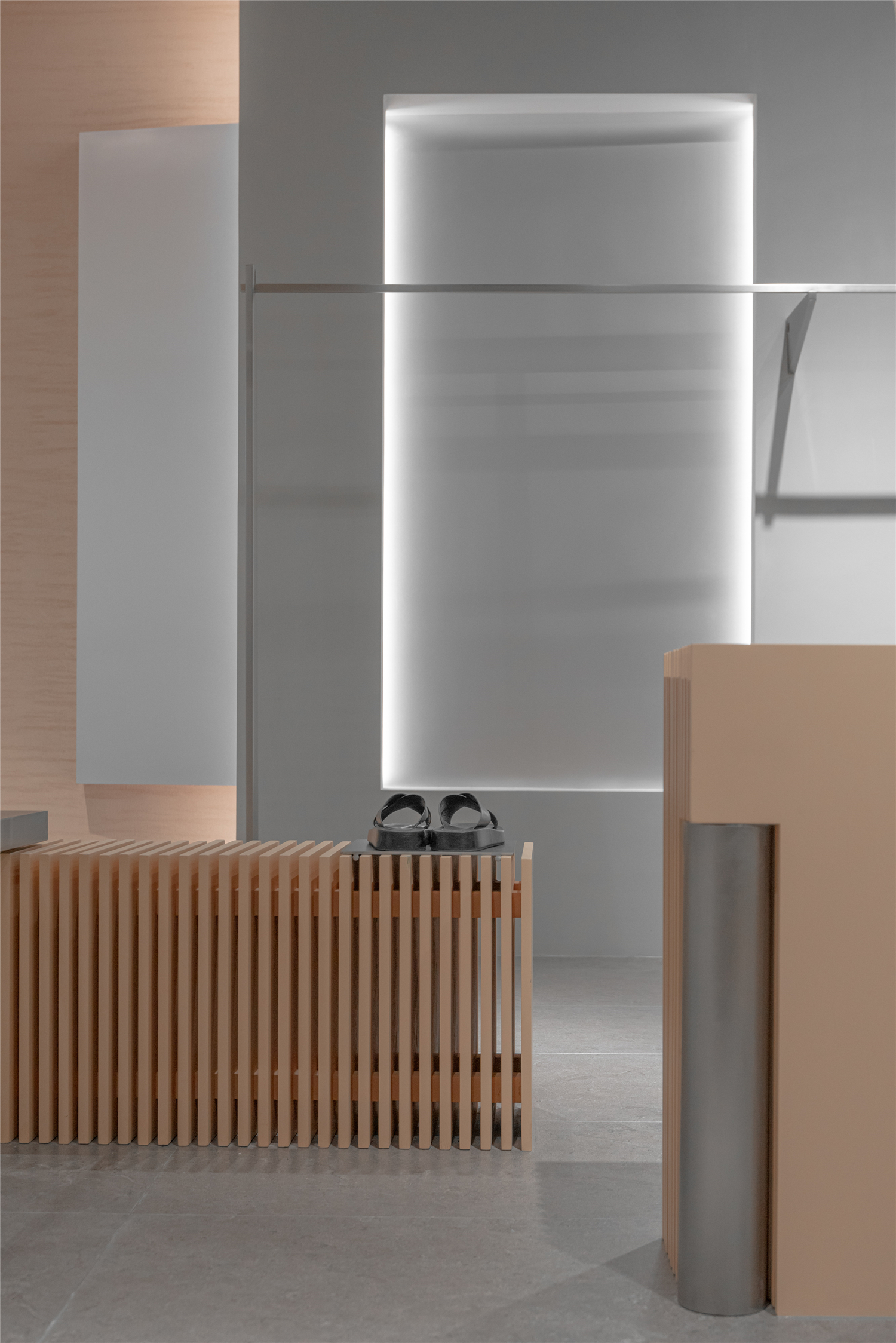 在新形象店的场地条件中,四面墙体并非完全方正,且场地中有较大的柱子。为应对这样的地条件,新砌墙体需尽可能将空间重新规整:入口左边的斜墙通过规整后,能与空间其他墙面达成方正空间,而原始墙面的斜角,也通过穿插在新筑墙体上的金属板体块被暗示出来。底部原始较大的圆柱,通过墙体的退让,以最原始裸露的状态直接呈现在挂衣服的壁龛中。
