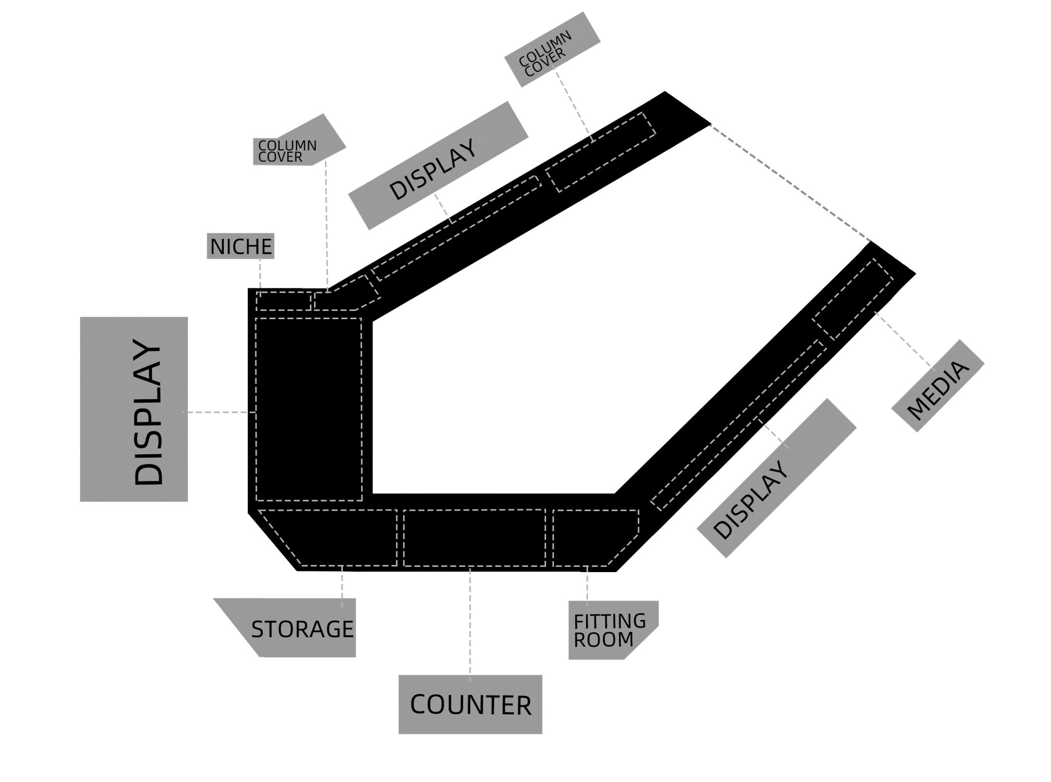 新的SI设计将店铺的墙体与结构做出重新的梳理,以四周的墙体作为基底,吃出一圈变化的厚度形成一套负型的系统。在这个厚度之内把店内的辅助空间灵活排布,收银、试衣、仓库、货架壁龛这些被拆散的元件被镶嵌到负型系统的厚度之中,作为新SI系统的常态化固定部分。