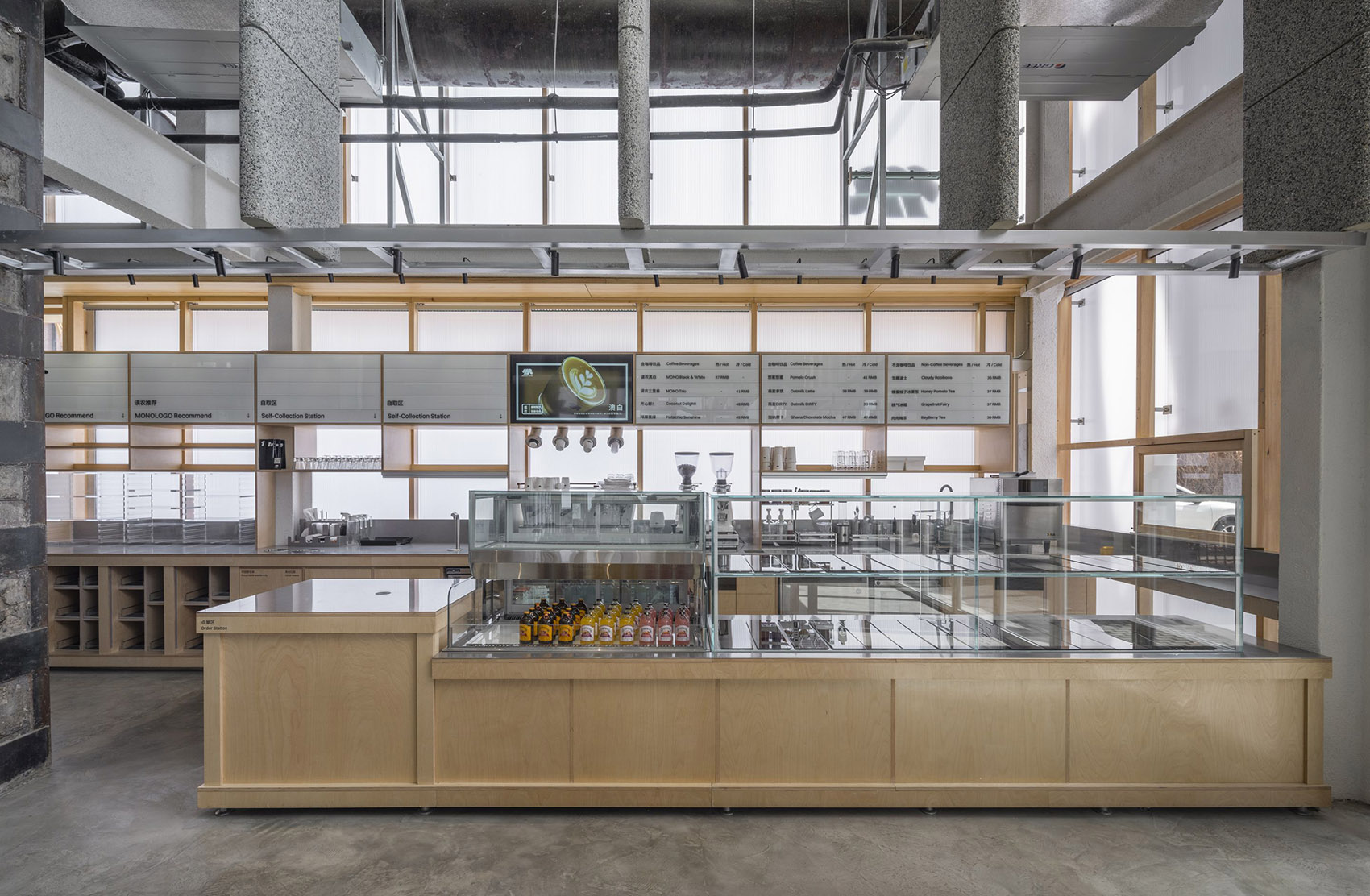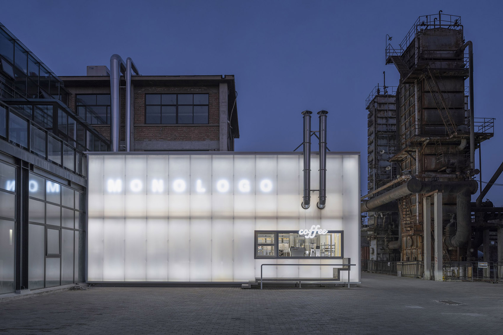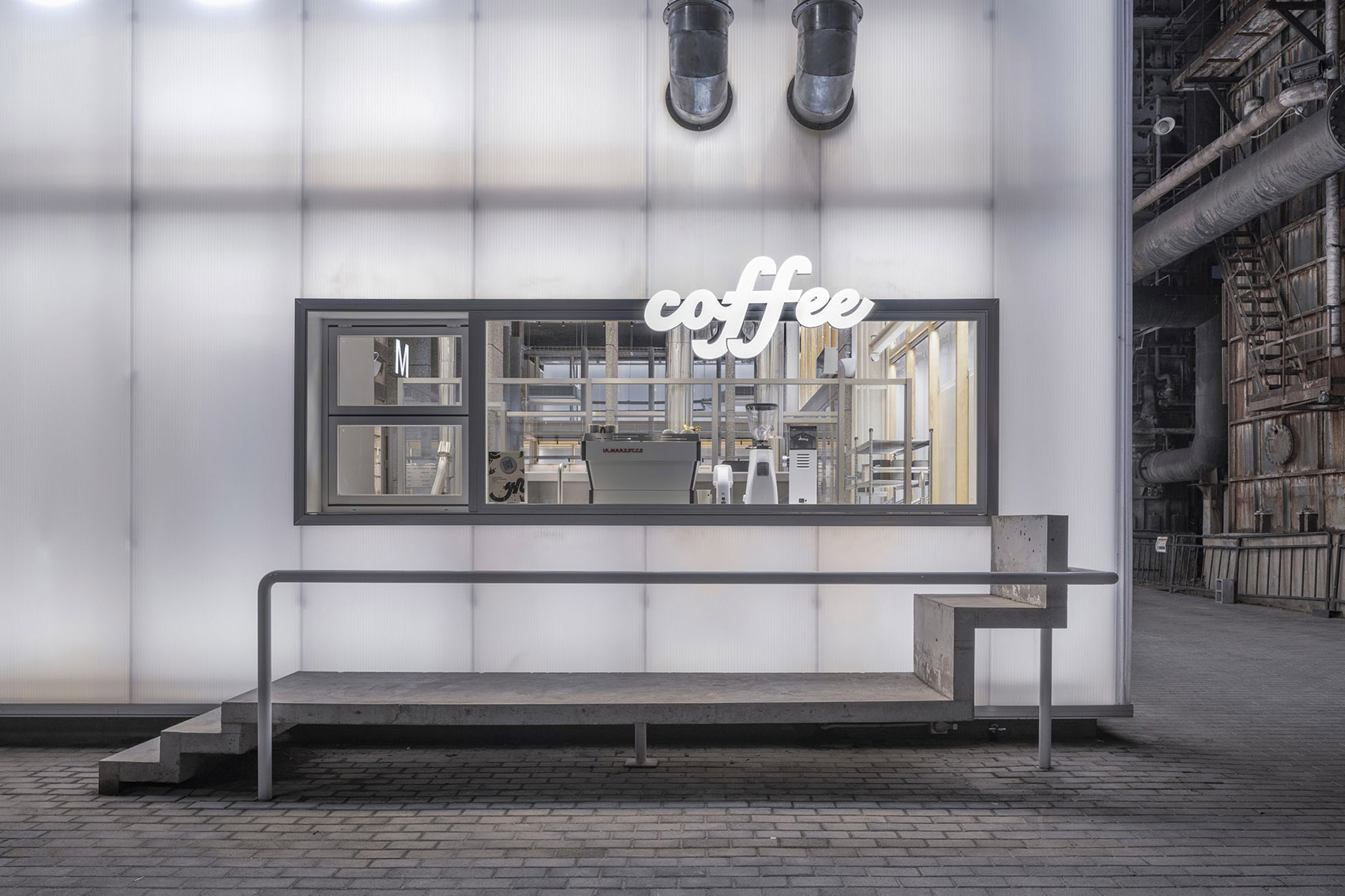 MONOLOGO (谟农咖啡)的选址在北京751园区的工业景观保护区内。南侧的炉罐区得以完整保留,西侧与园区主路之间是一片开阔的场地。