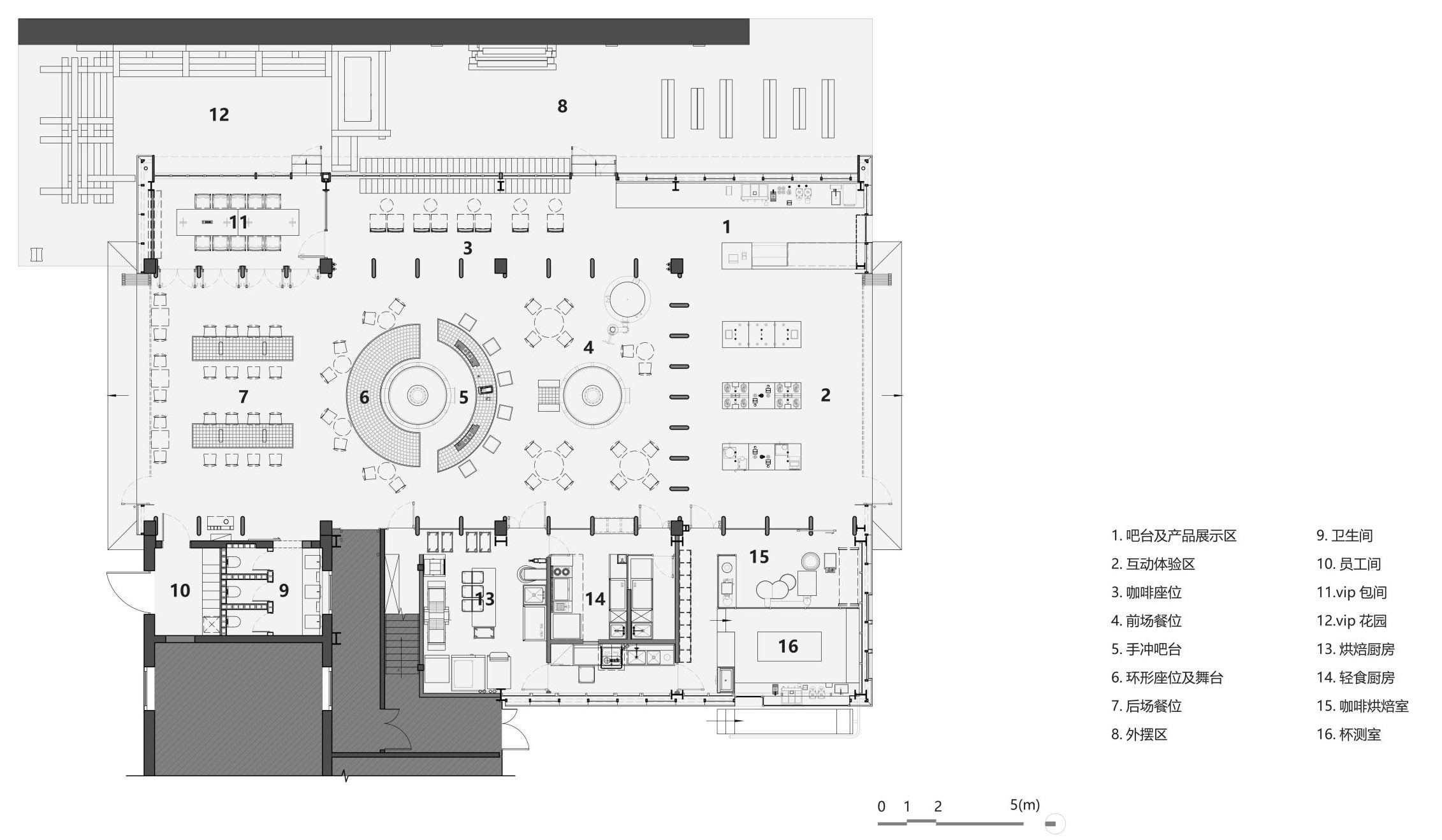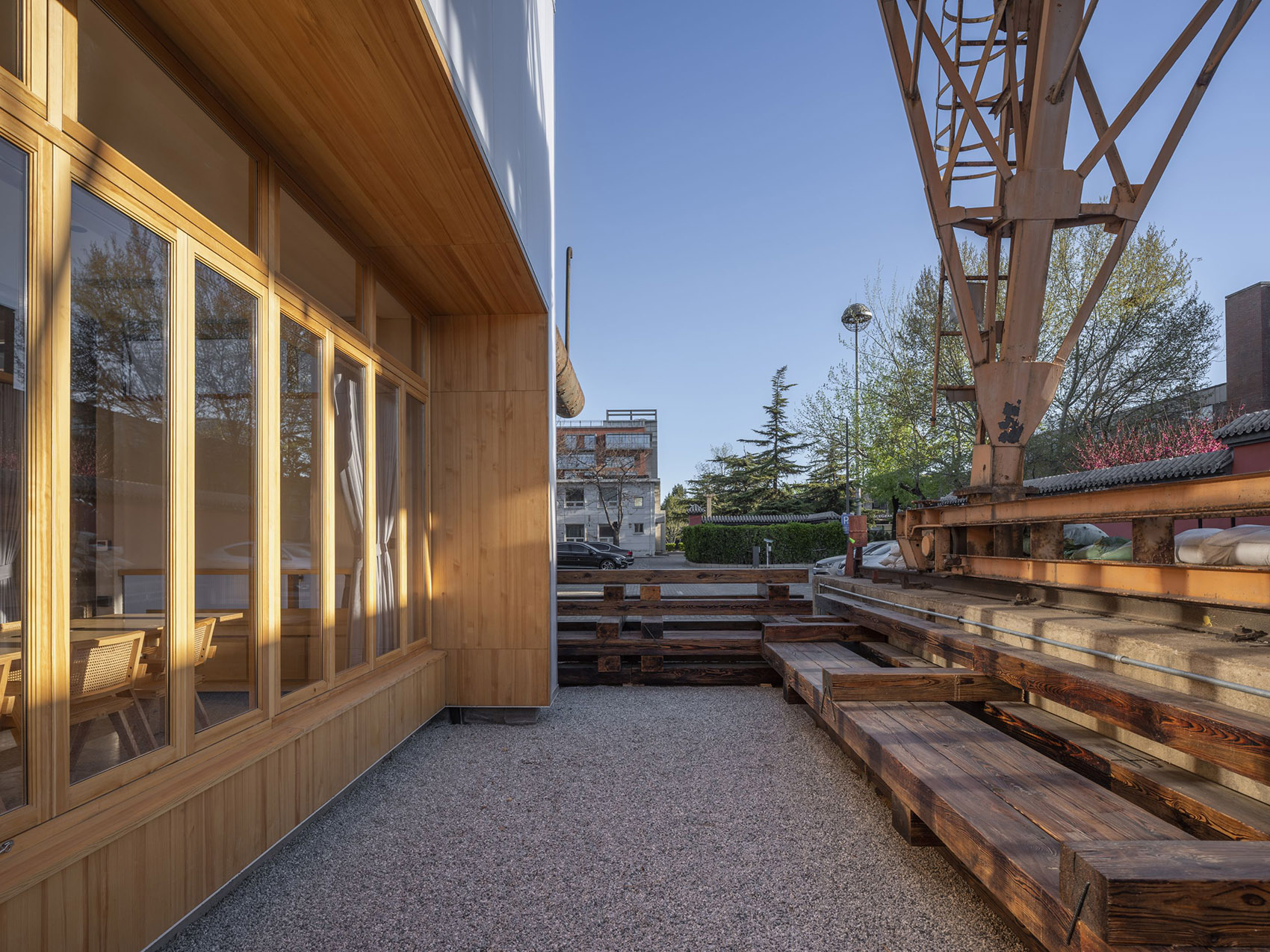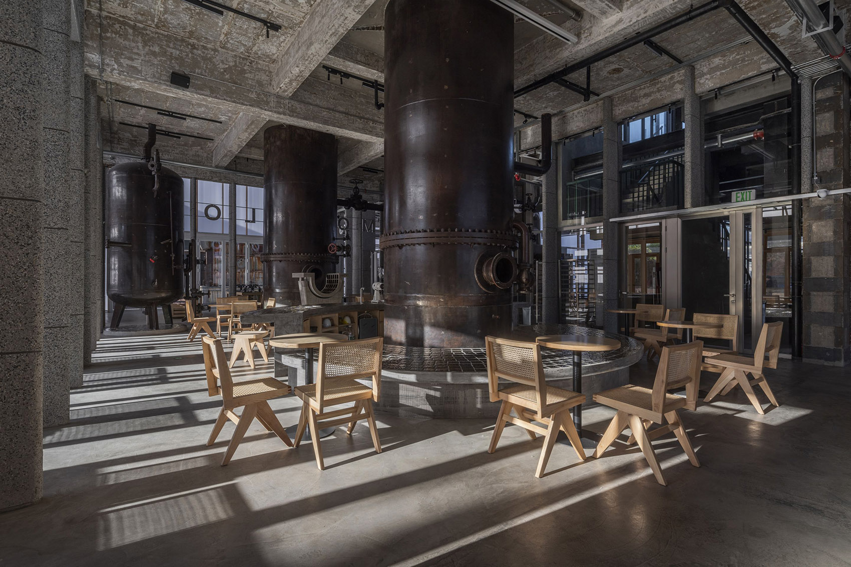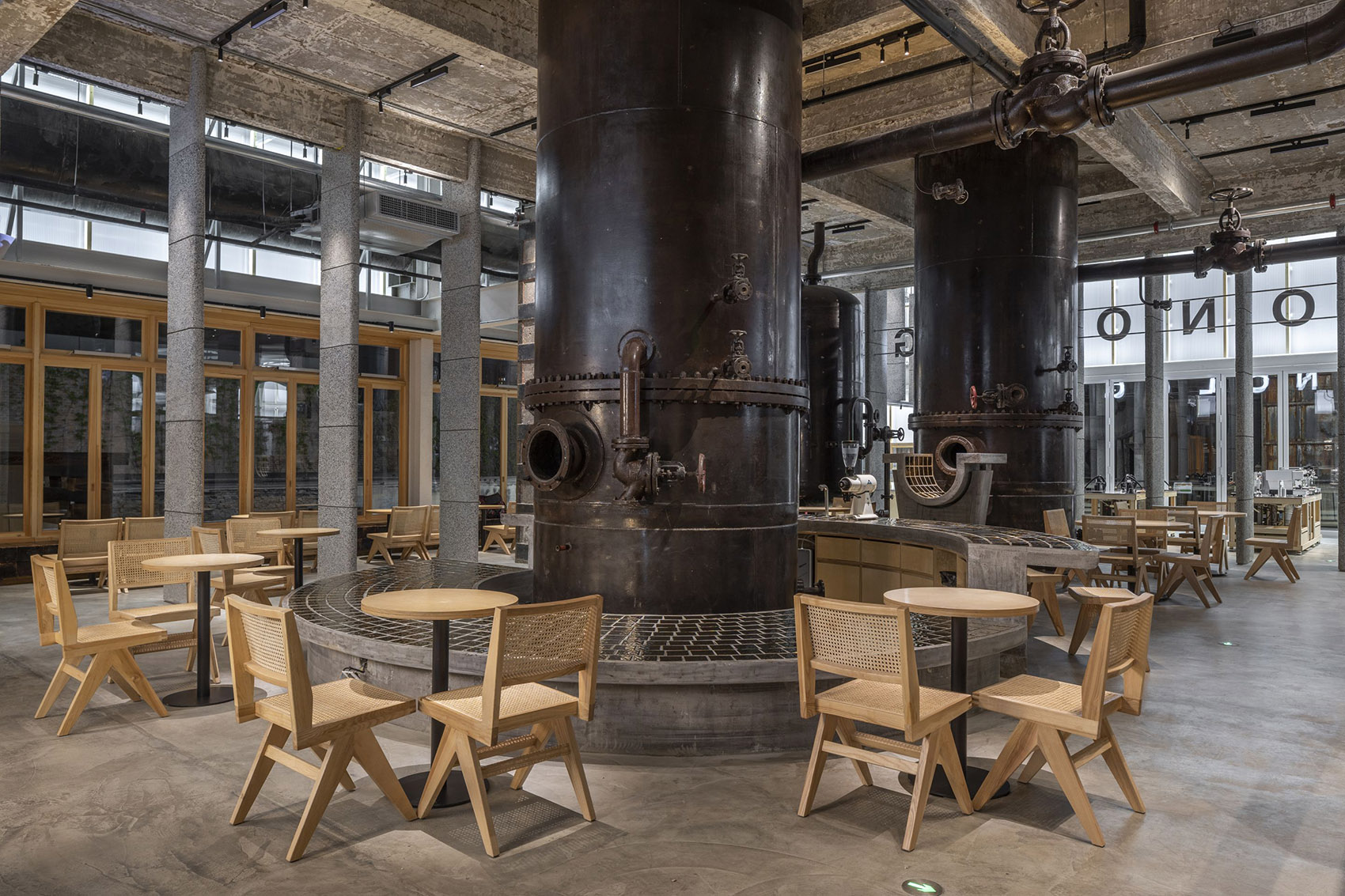 MONOLOGO (谟农咖啡)的选址在北京751园区的工业景观保护区内。南侧的炉罐区得以完整保留,西侧与园区主路之间是一片开阔的场地。