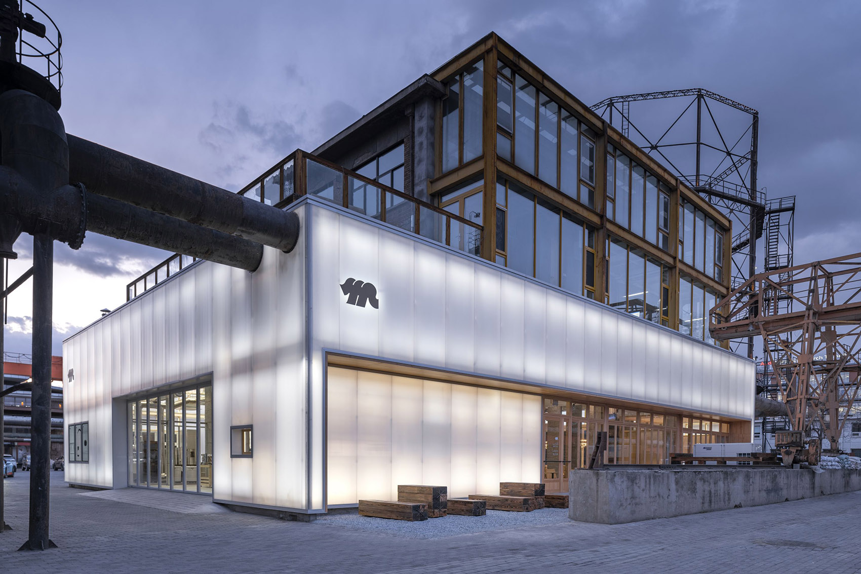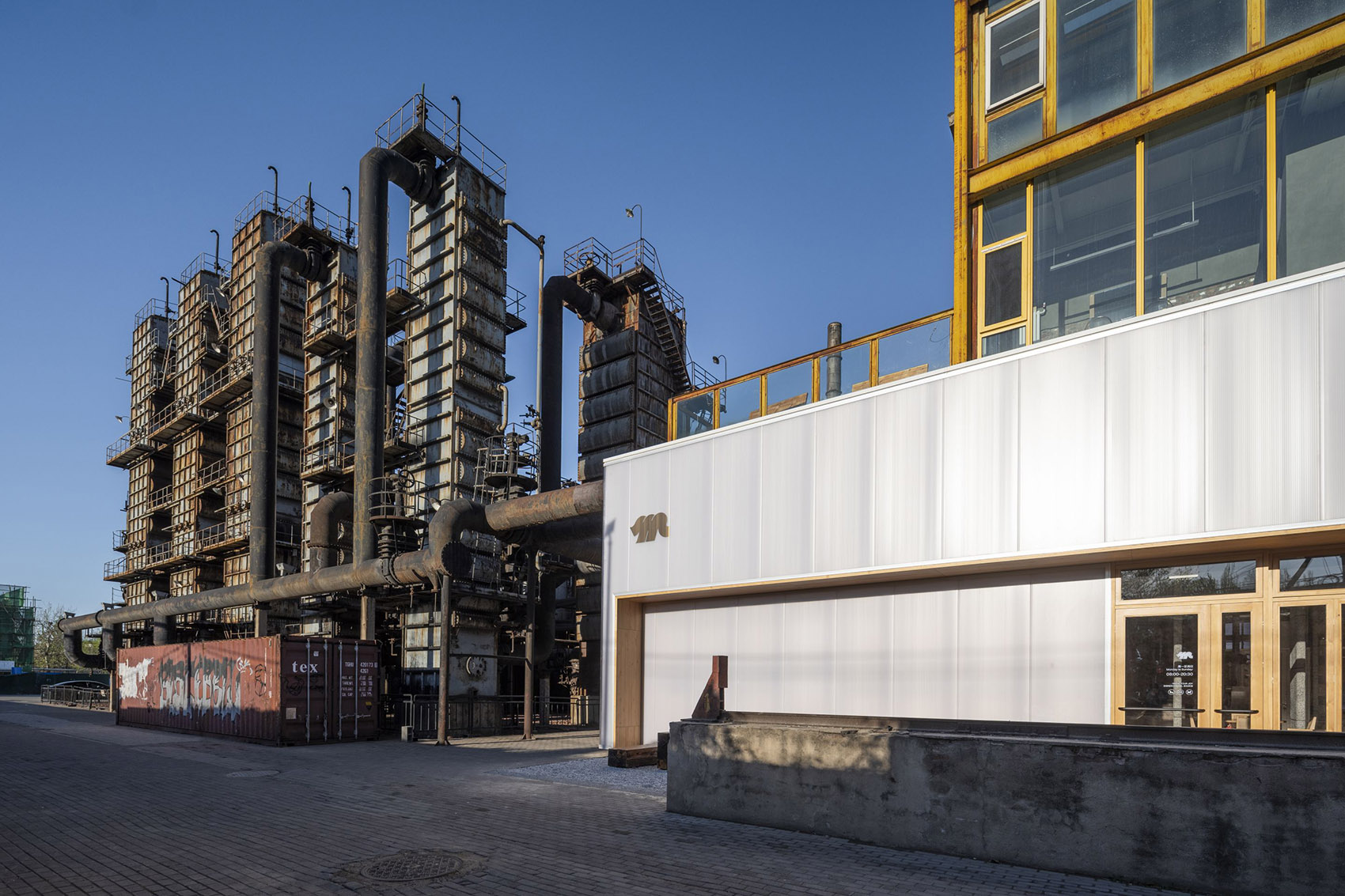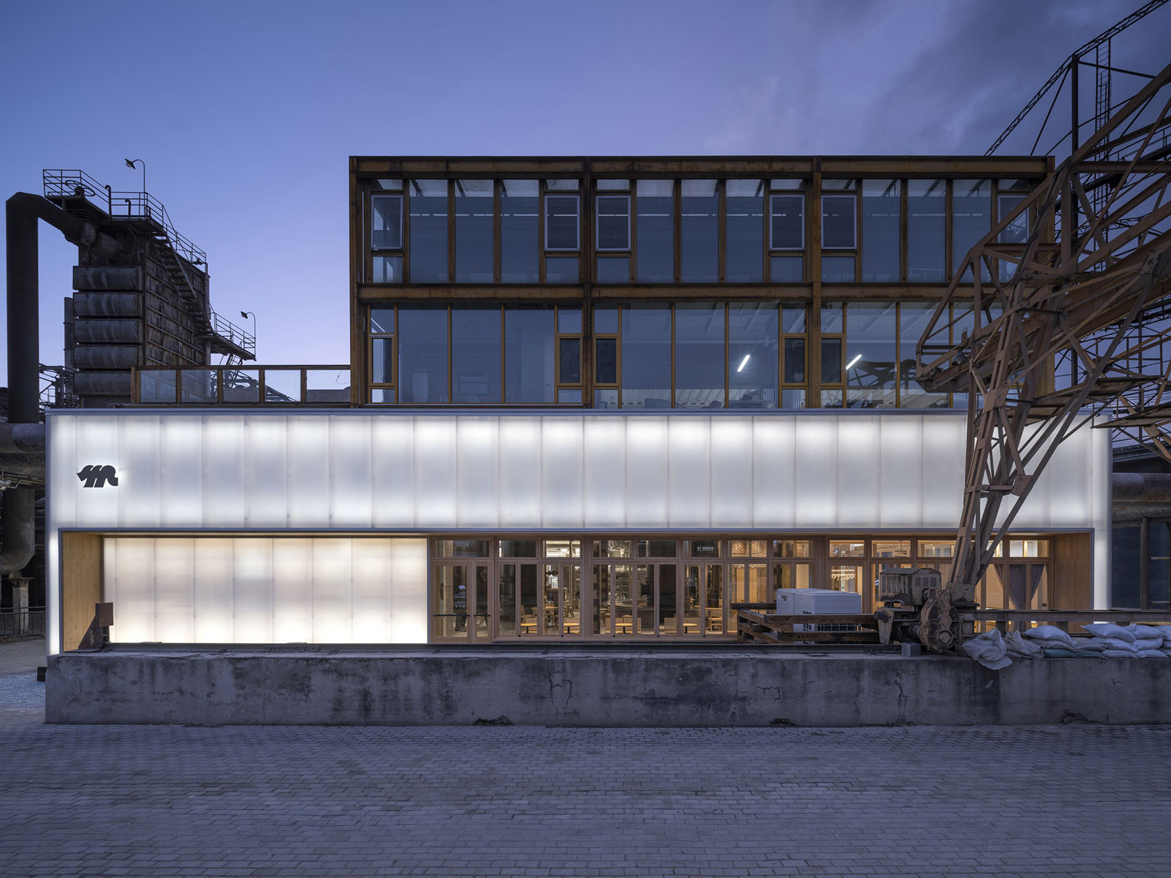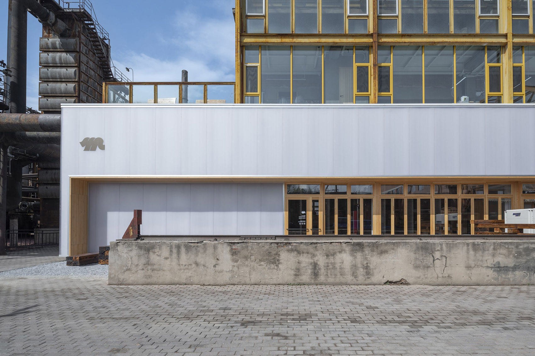 第三步是用一个纯白色的“外套”将这三部分包裹成一个完整的方盒子。白色半透明的聚碳酸脂板立面非常纯净,从外部看不到任何框材结构,白天可以将自然光引入,晚上的灯光还可以穿透到外部。带有一点临时感的姿态与周围的工业景观保护区形成了有趣的对话。