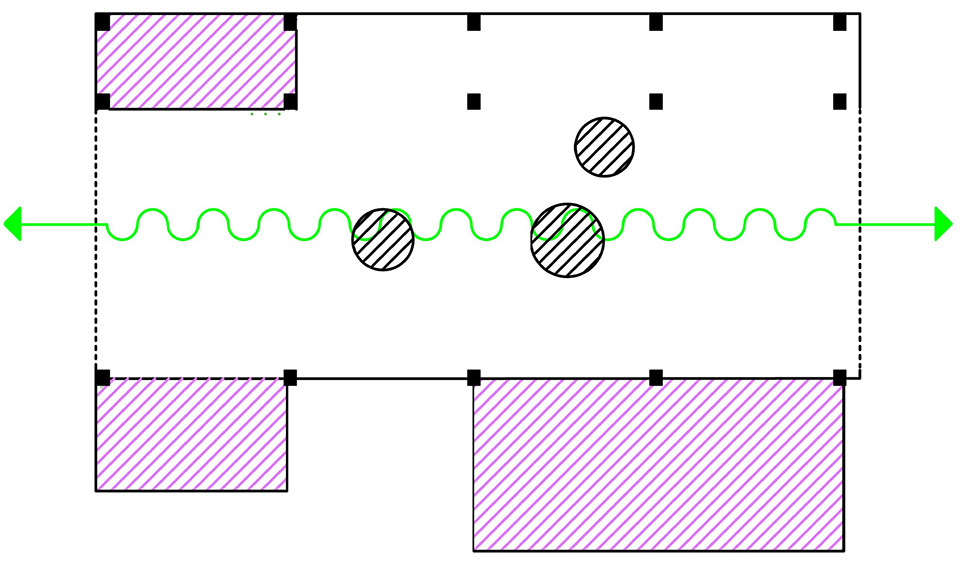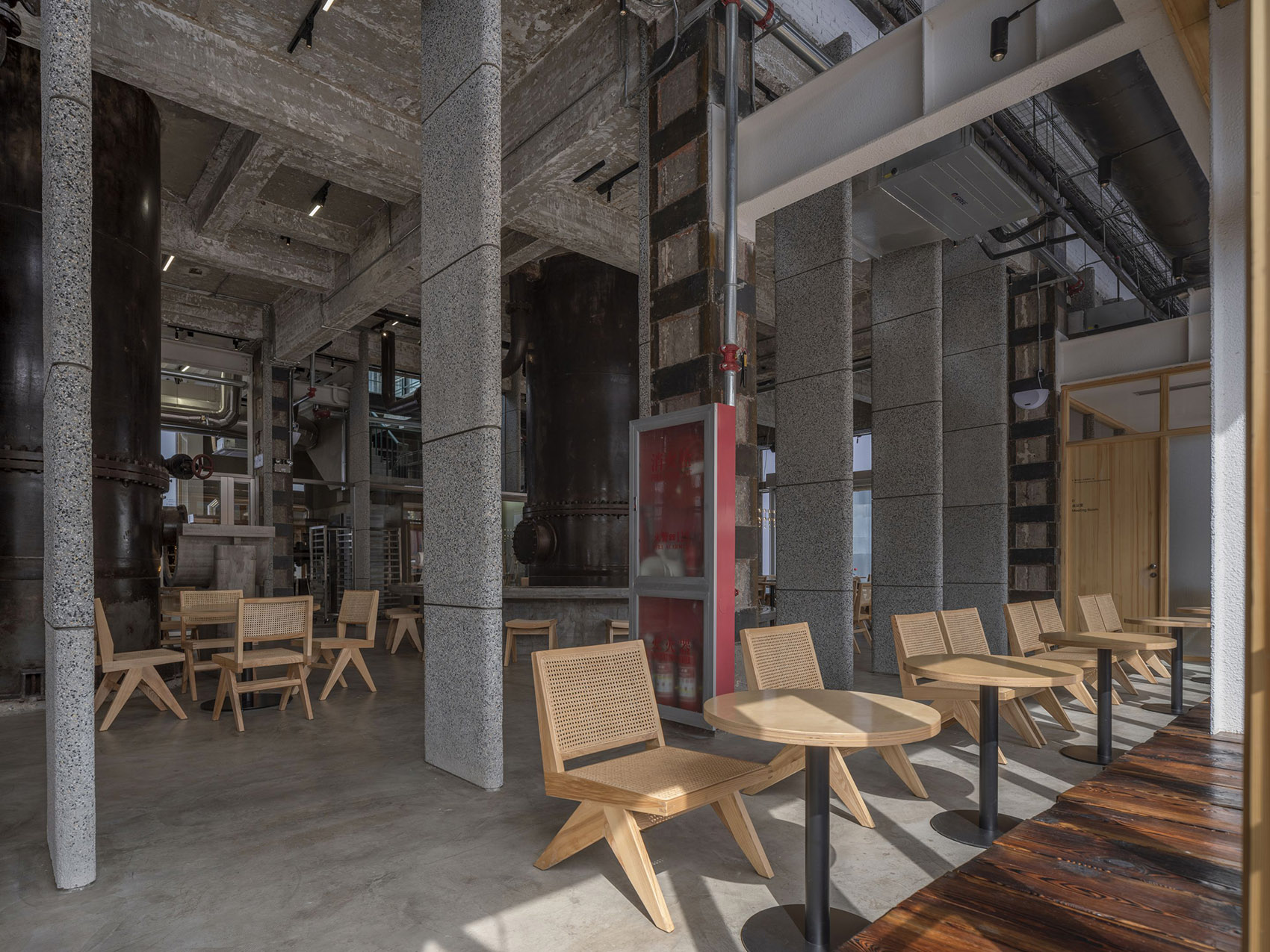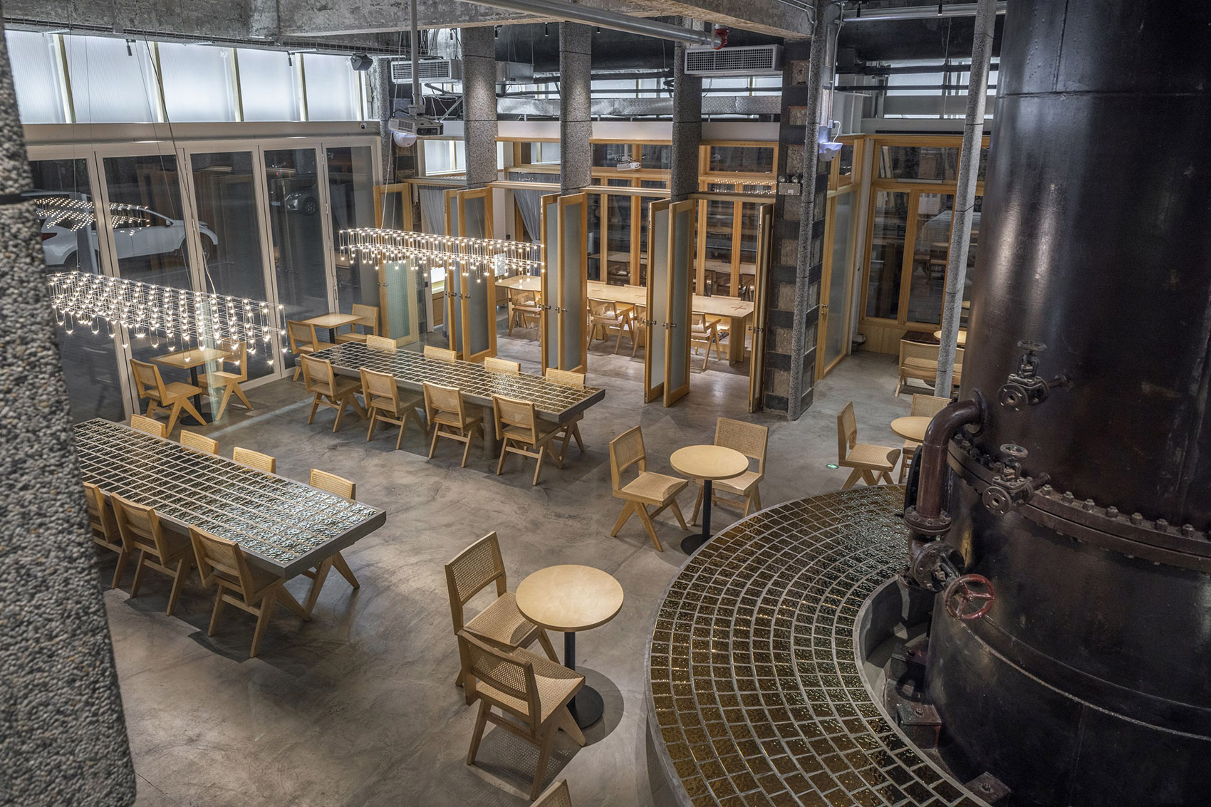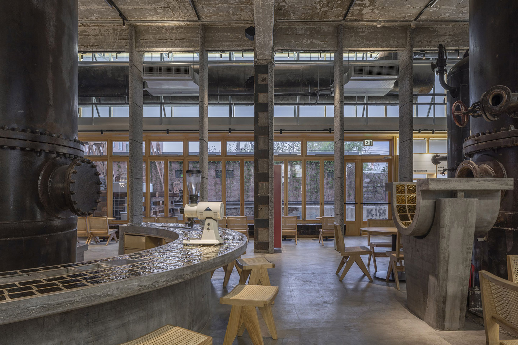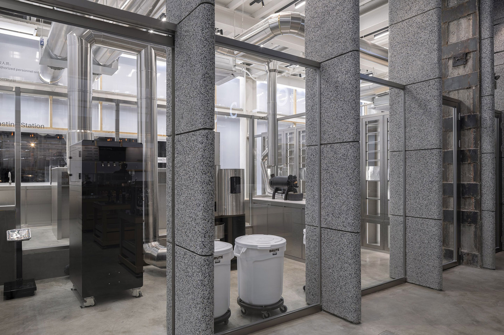 第二步,我们在三个部分的交界处安放了三排细长的“扁柱”,穿针引线,将这三部分重新“缝合”在一起。扁柱能将两侧的自然光进行过滤,使核心空间的光线更加柔和。人们在空间漫步时,视线被局部的遮挡,随着行走视点的变化,遮挡与通透不断地进行交替,形成了丰富的层次感。空间因此产生了引导性,鼓励客人去体验和发现。透过扁柱的间隙,客座区的客人可以看到整个烘焙和后厨的区域,看到咖啡制作和食物加工制作的全过程。