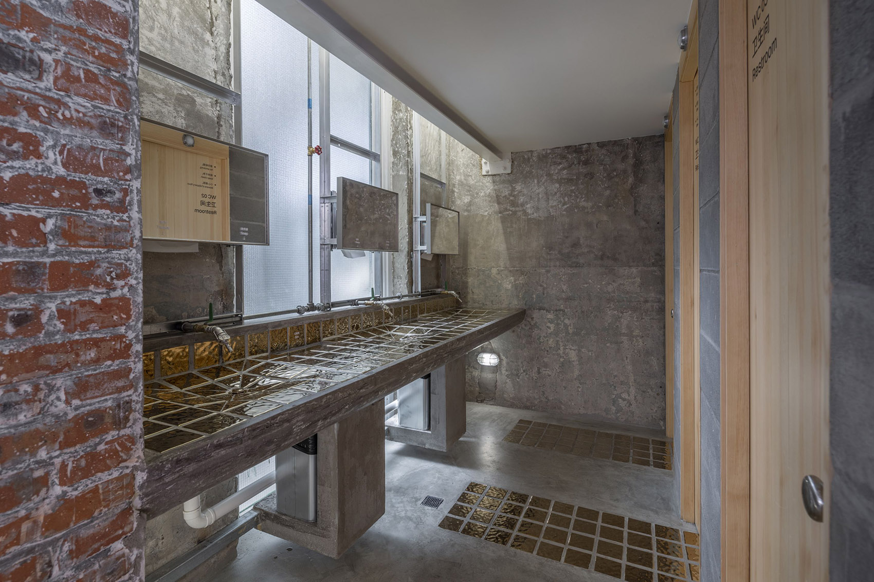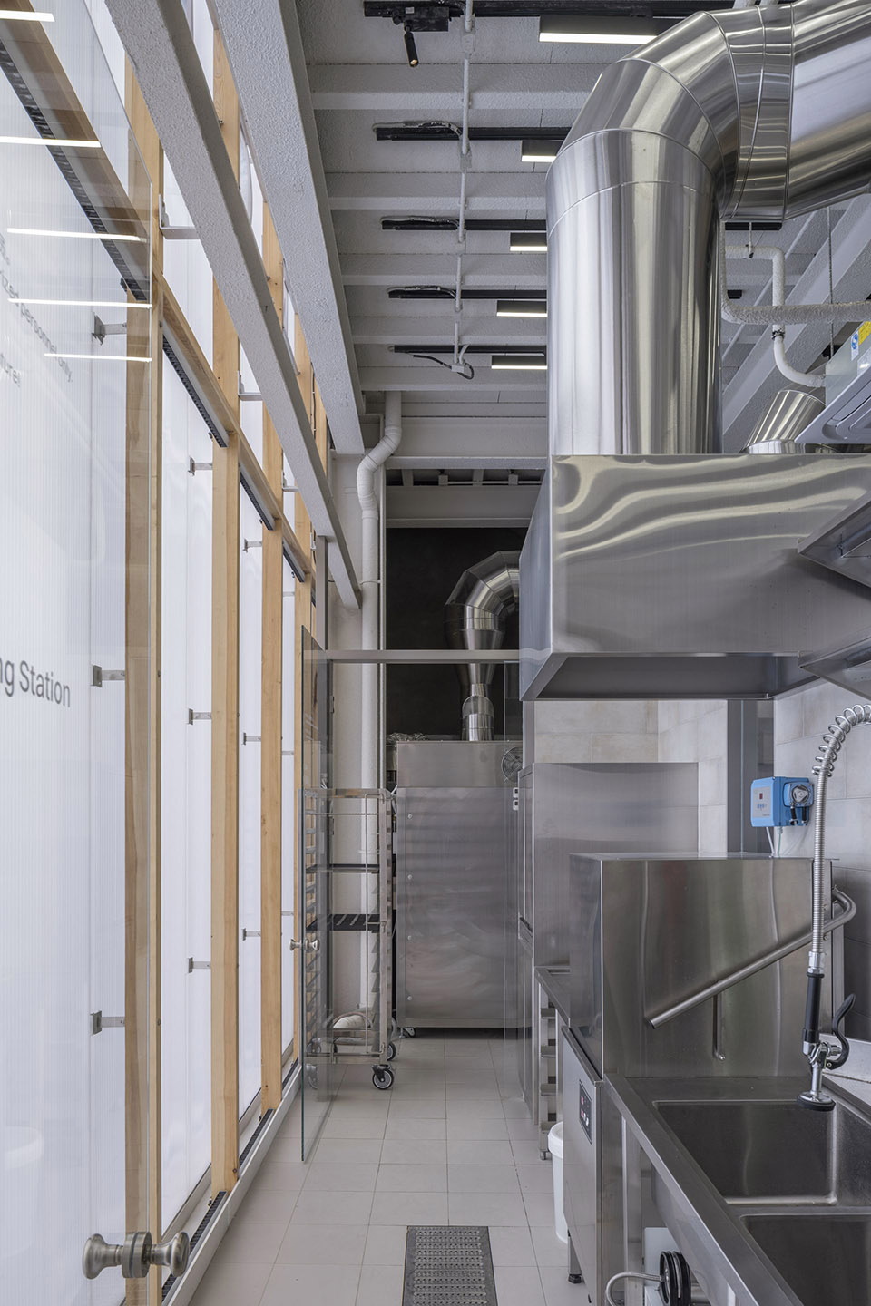 我们首先用三种材料为三部分的空间分别设计了一套家具:为炉罐区设计了镶嵌金色瓷砖的混凝土家具,为黄色钢结构区域设计了桦木多层板家具,为黑色钢结构部分设计了不锈钢的厨房家具。三套家具加强了三个部分不同的场所体验,有时代感的材料与构造做法让也体验者易于发现新与旧的区别。
