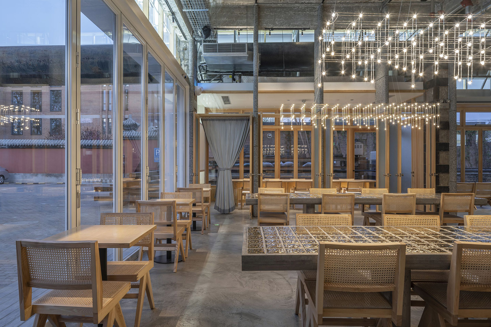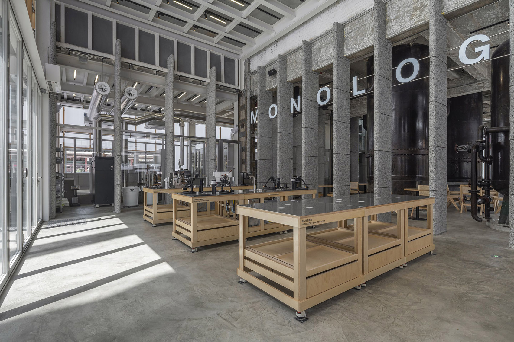 咖啡馆是一种城市公共空间。MONOLOGO的室内空间高大空旷,其中伫立着纪念碑式的炉罐,两侧高大的柱列加强了空间的纪念性,进入的瞬间宛如走进一座上个世纪的遗迹。南北两侧的立面被设计为可以完全敞开,室内空间可以切换为有咖啡座的城市广场。