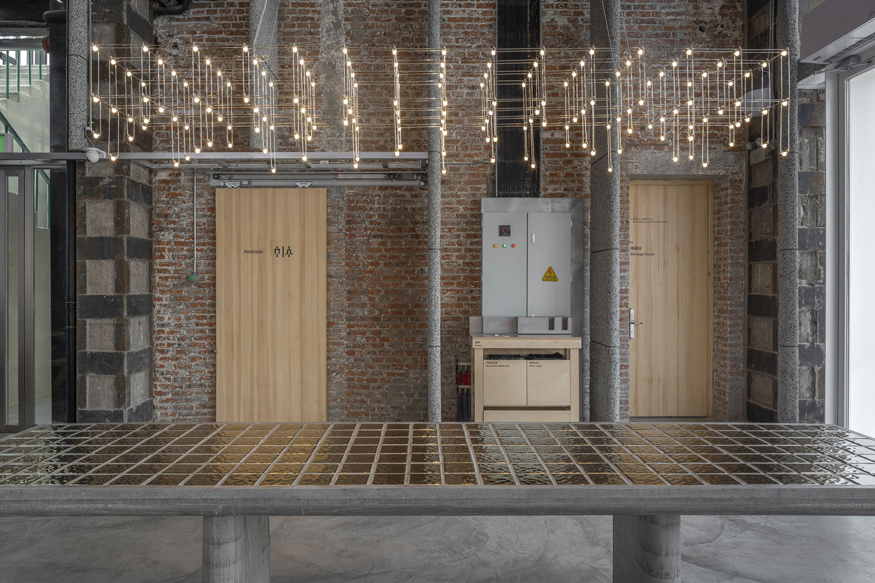 我们在空间的顶部紧贴楼板布置了均匀的条型灯。这种朴素的布光使得室内光线的效果与自然光非常接近。光线把空间中每一件物品,包括顶部的管线与设备全部照亮,弱化了内与外的区分,同时也赋予了空间中所有元素以同等的尊严。