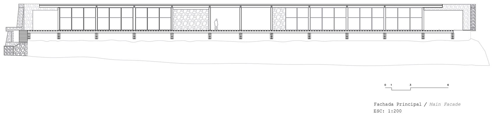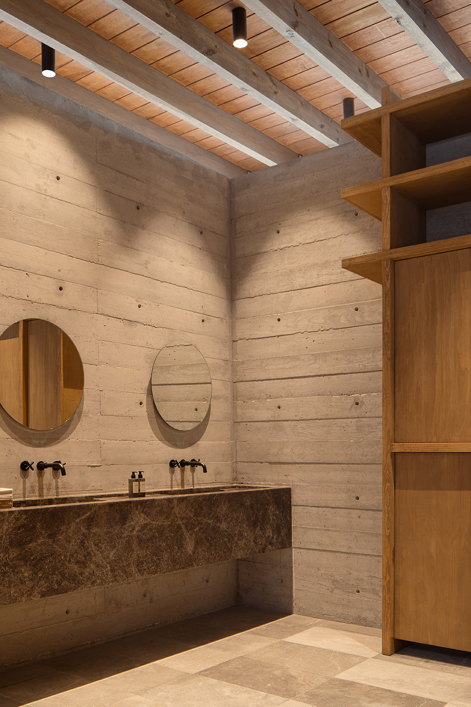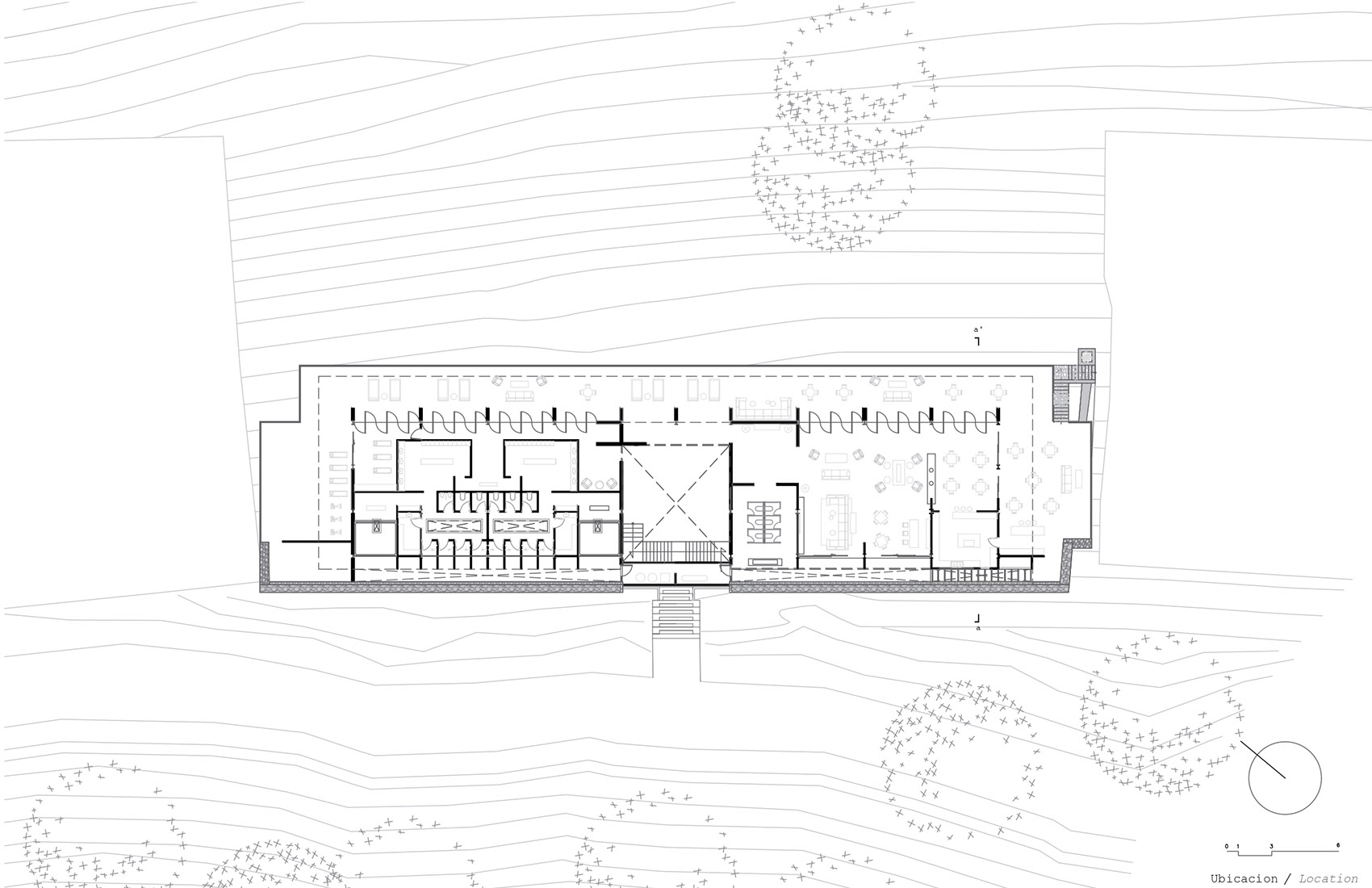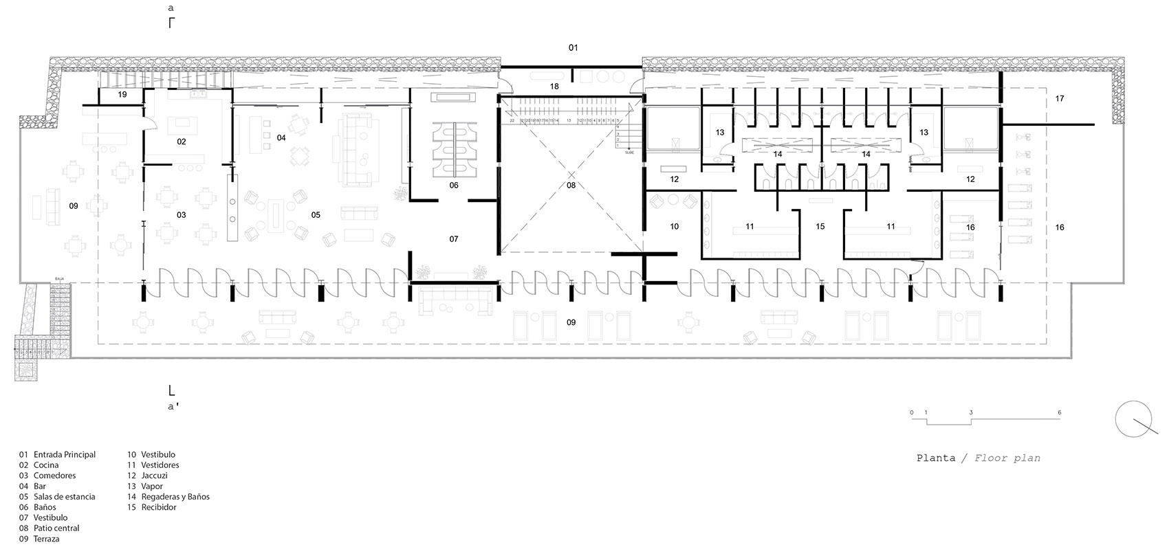 俱乐部主要是由一个中央庭院进行控制的,该庭院营造出一种开放的氛围,邀请人们凝视这堵由石墙够构成的景观,这些石墙作为分隔,还承担了过渡公共空间与私人空间之间的通道功能。