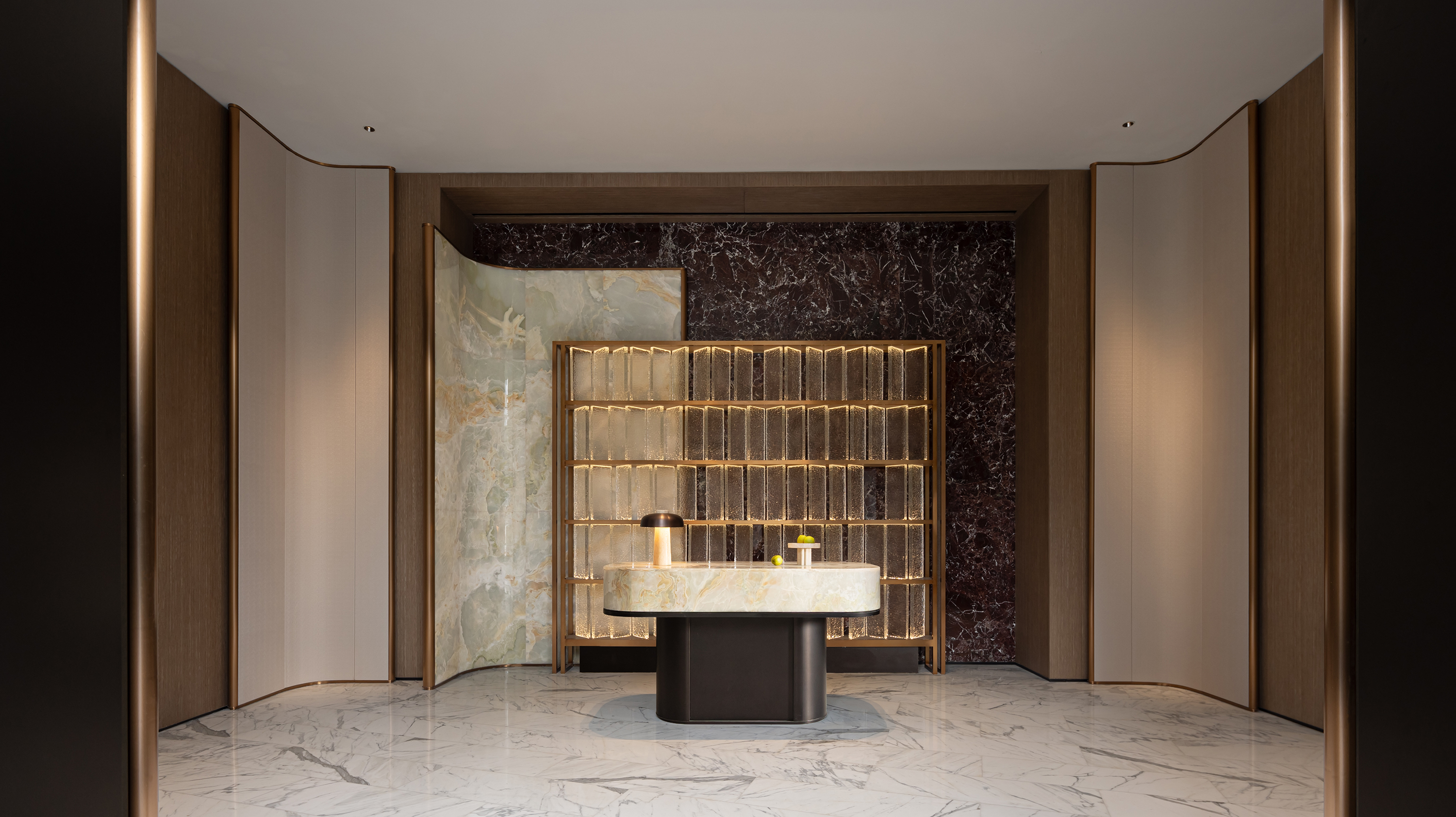 进入用户区,沙色岩板的材质转换让空间的覆上了柔和的质感。