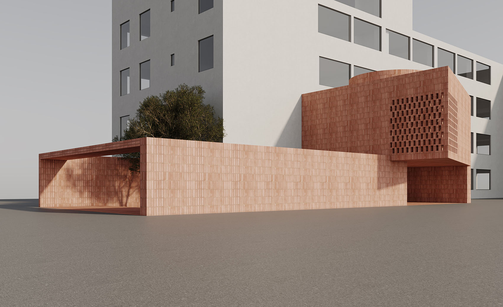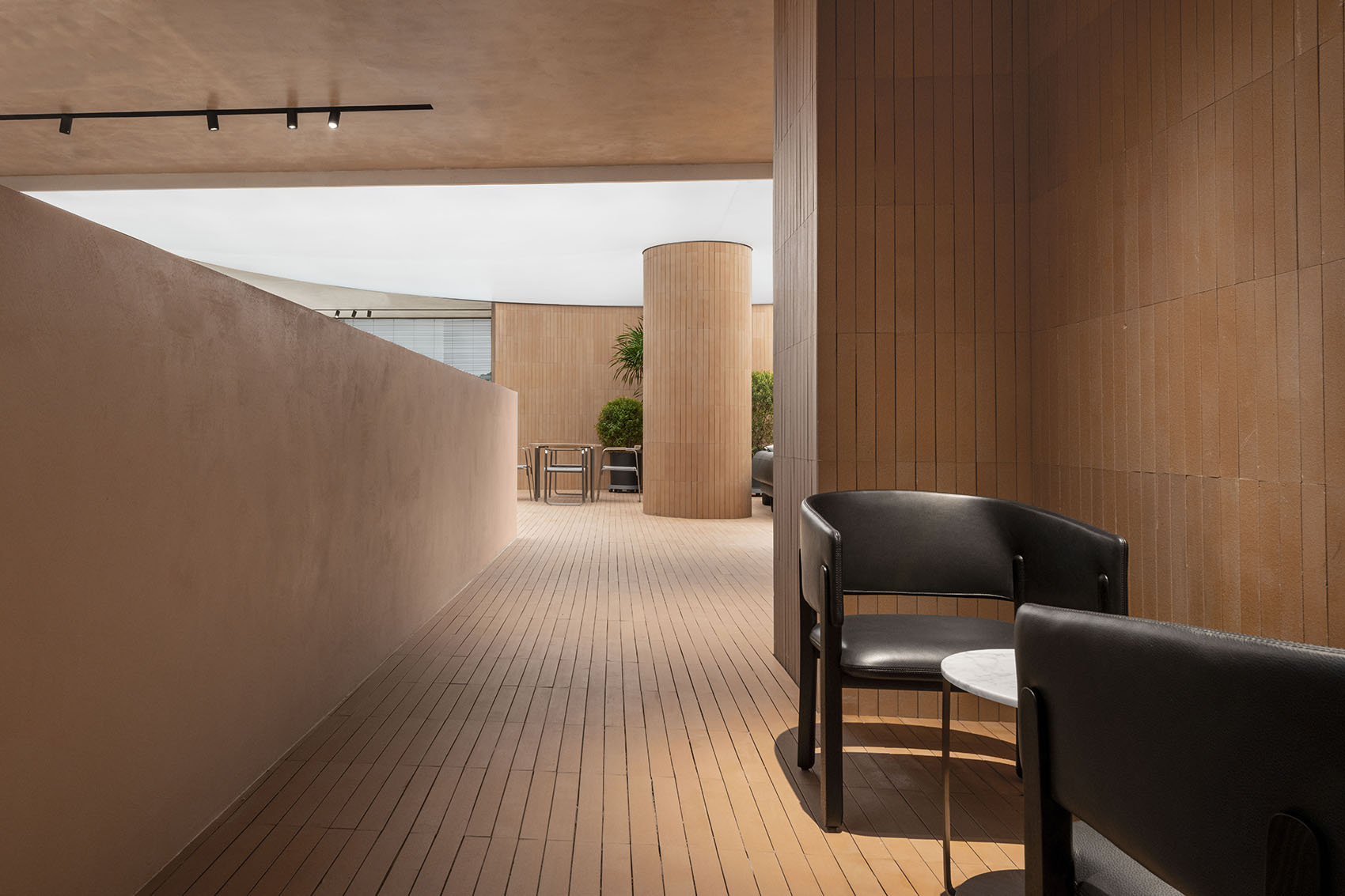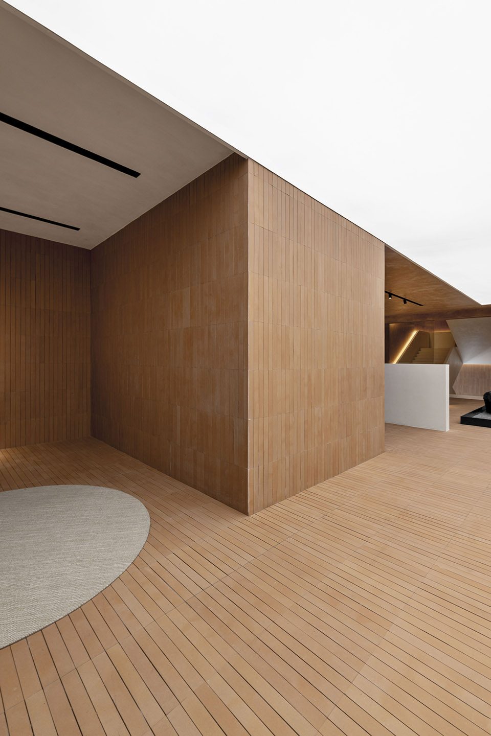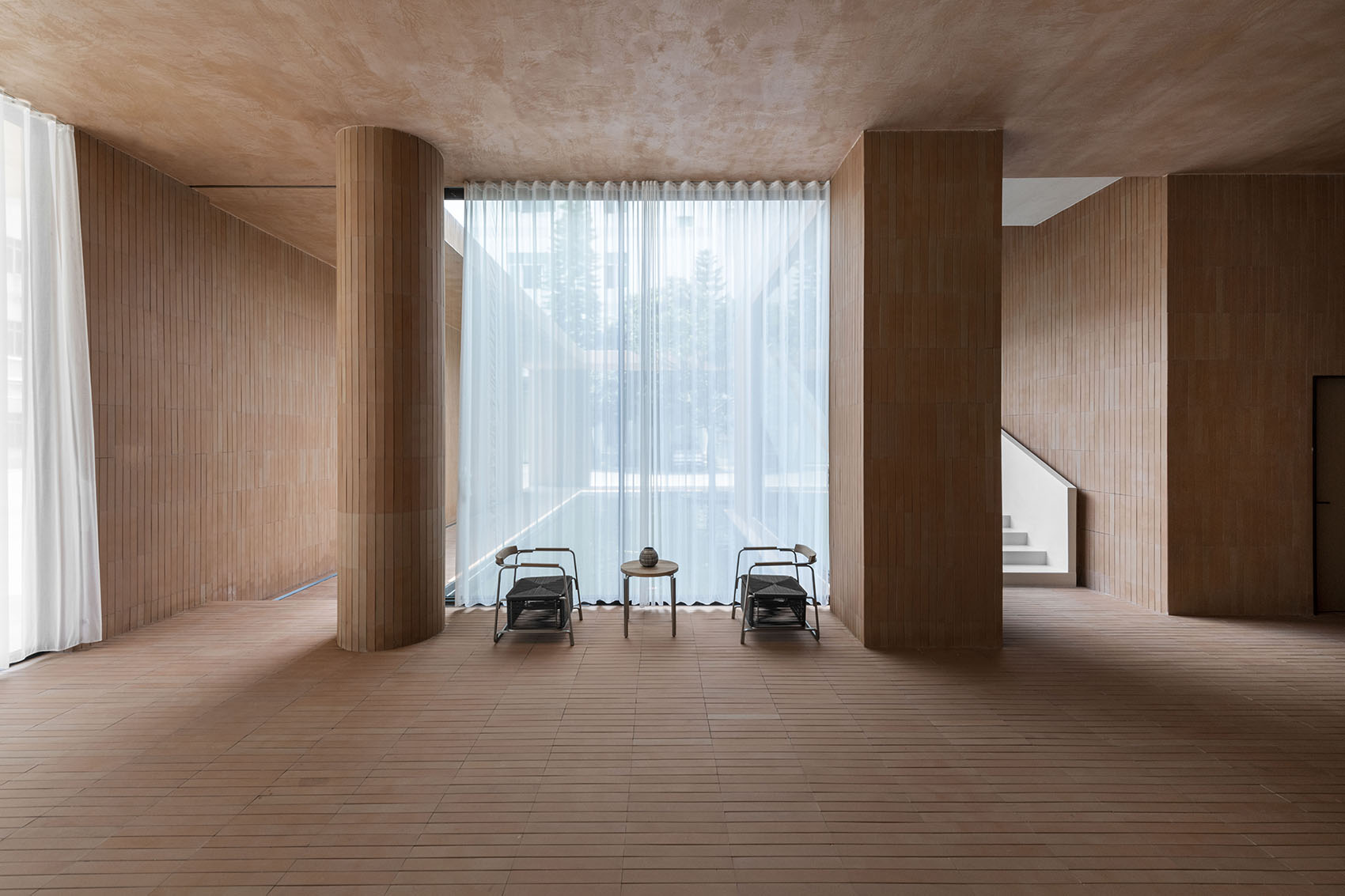 整个室内空间采用了红砖与白墙的搭配。保留一棵树,让自然光进入室内,尽量使用更接近土地颜色的立面,表达出对自然的亲和。在设计的想象中,人们在这个空间里生活也是更多的接受自然资源对人的馈赠,而不是制造更多人工的东西来建立你的生活,给自然留出进入人生活空间的余地。