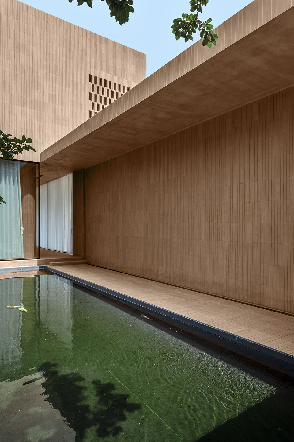 来到入口处,穿过一片平静的水面,水中有一颗郁郁葱葱的大树。光不时透过树叶,在墙上留下了斑驳的树影,随着时间推移,树影也在慢慢移动。