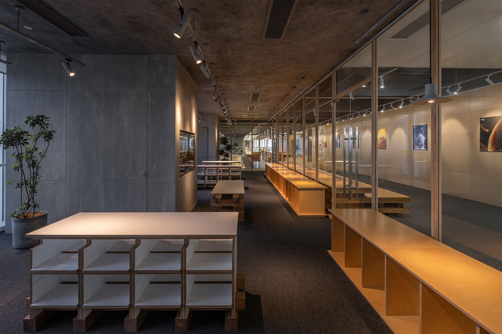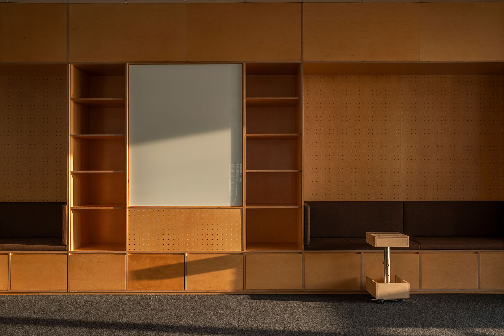 展厅紧邻广场,是城镇中的“精神空间”。它被设计成一个望向广场的玻璃盒子。在这里,我们将家具的模数单元分的更小,形成可以拼插组合的模块。由此适应不同尺寸的展品及各种展览场景。