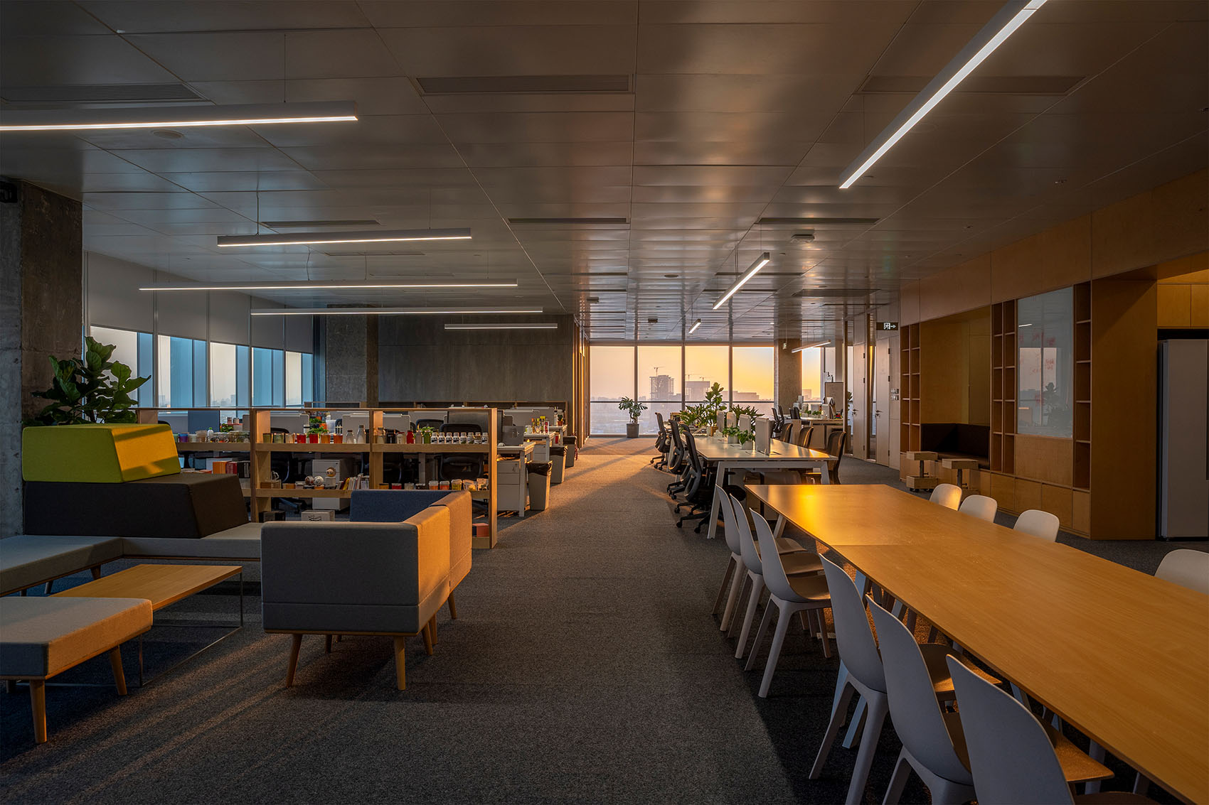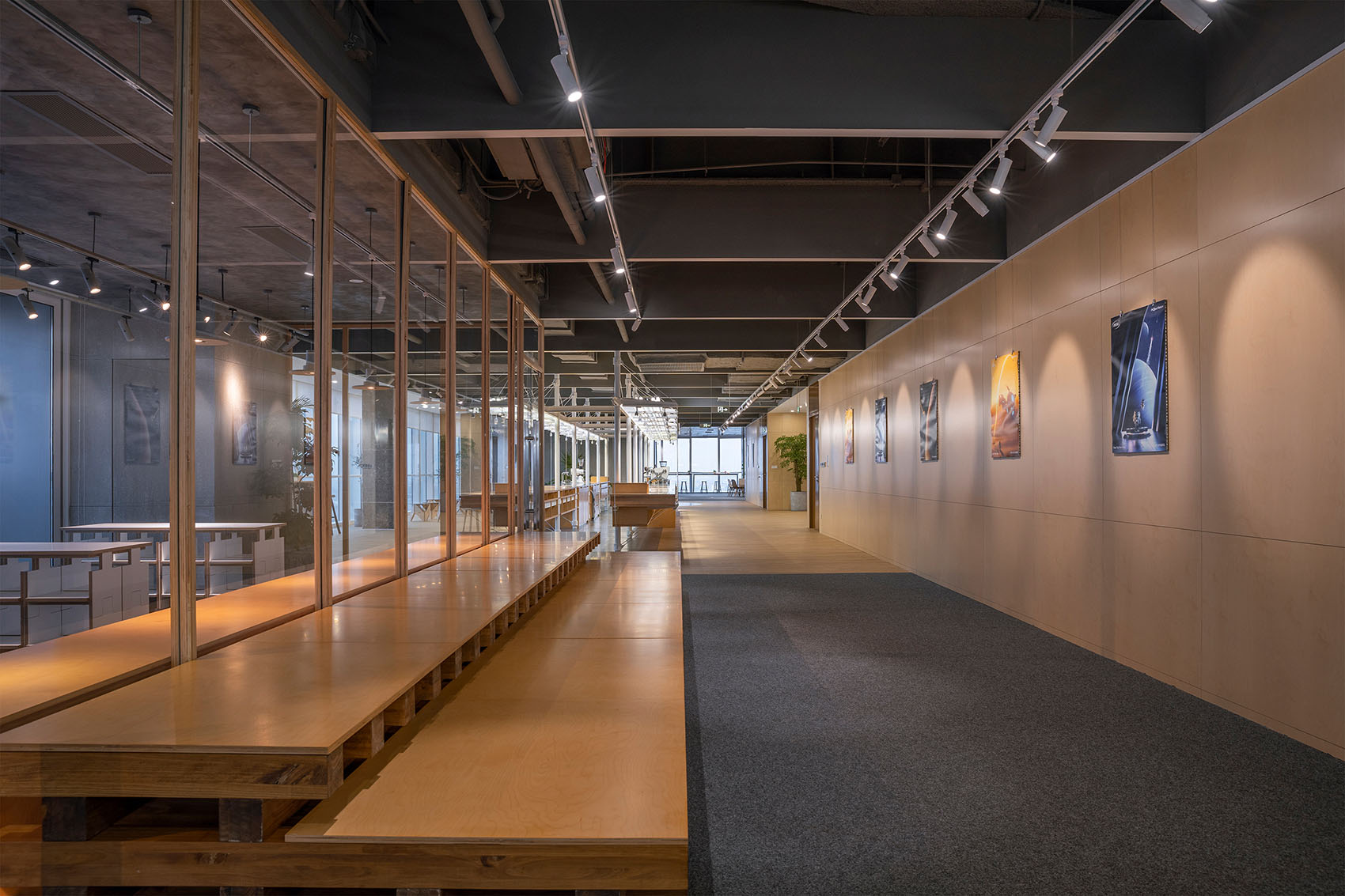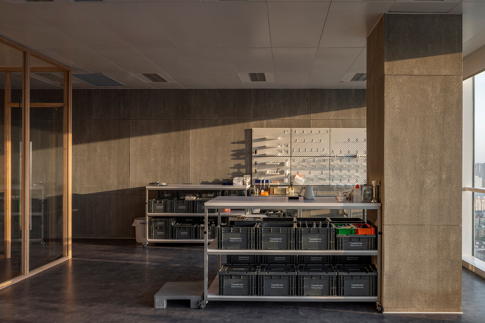 街区内部的办公家具并没有明显的工位边界。桌腿充分后退,这为工位的布置带来了灵活性。同样宽度的长桌可以在企业发展的不同阶段提供给一人、两人或三人办公。核心研发部门也有自己的缓冲空间和开放讨论区,并有开阔的景观视野。收纳家具也具有更高的组合灵活度。
