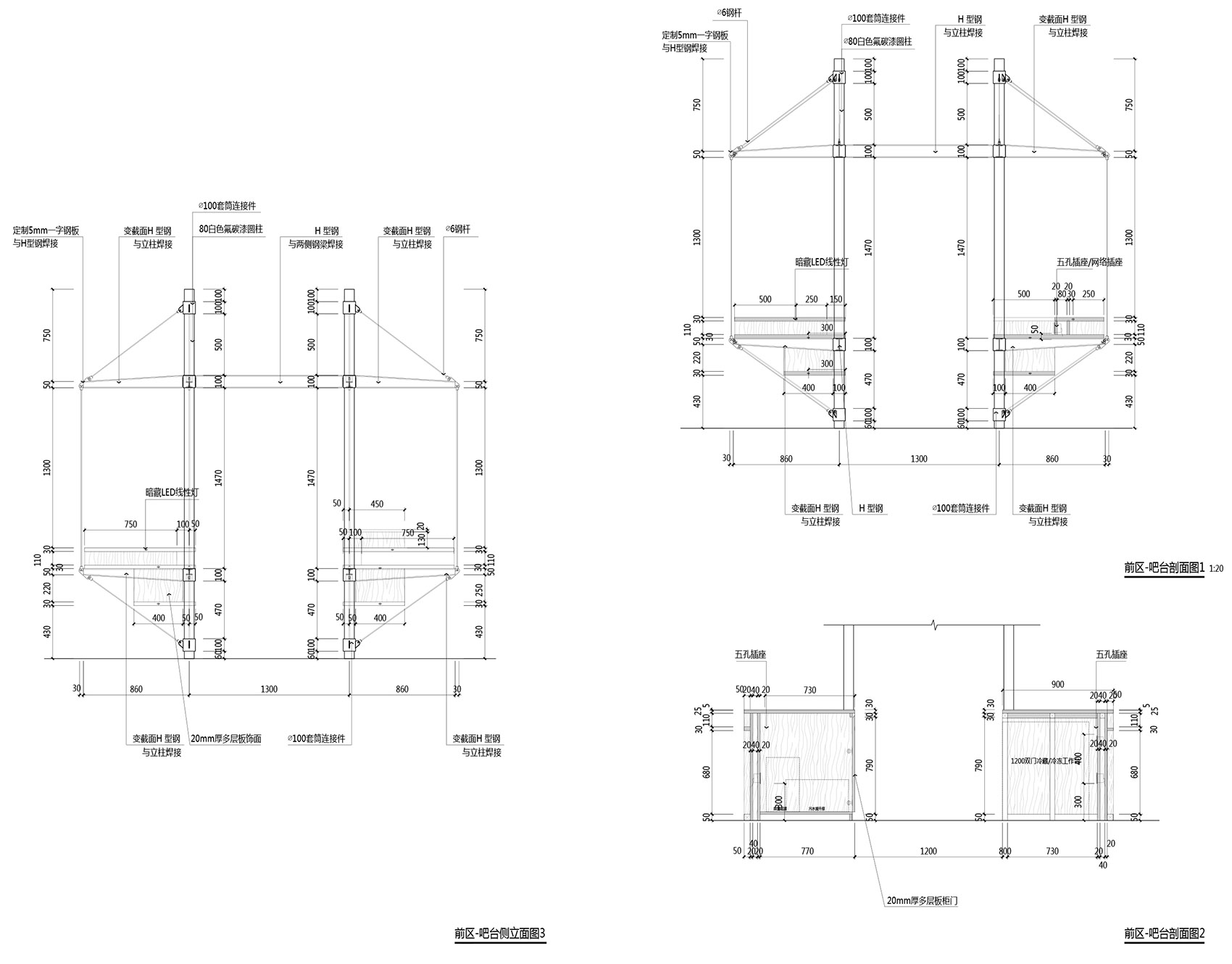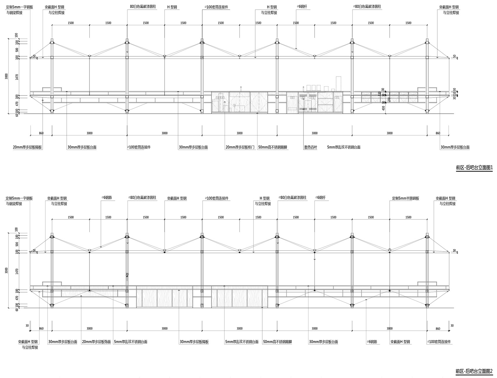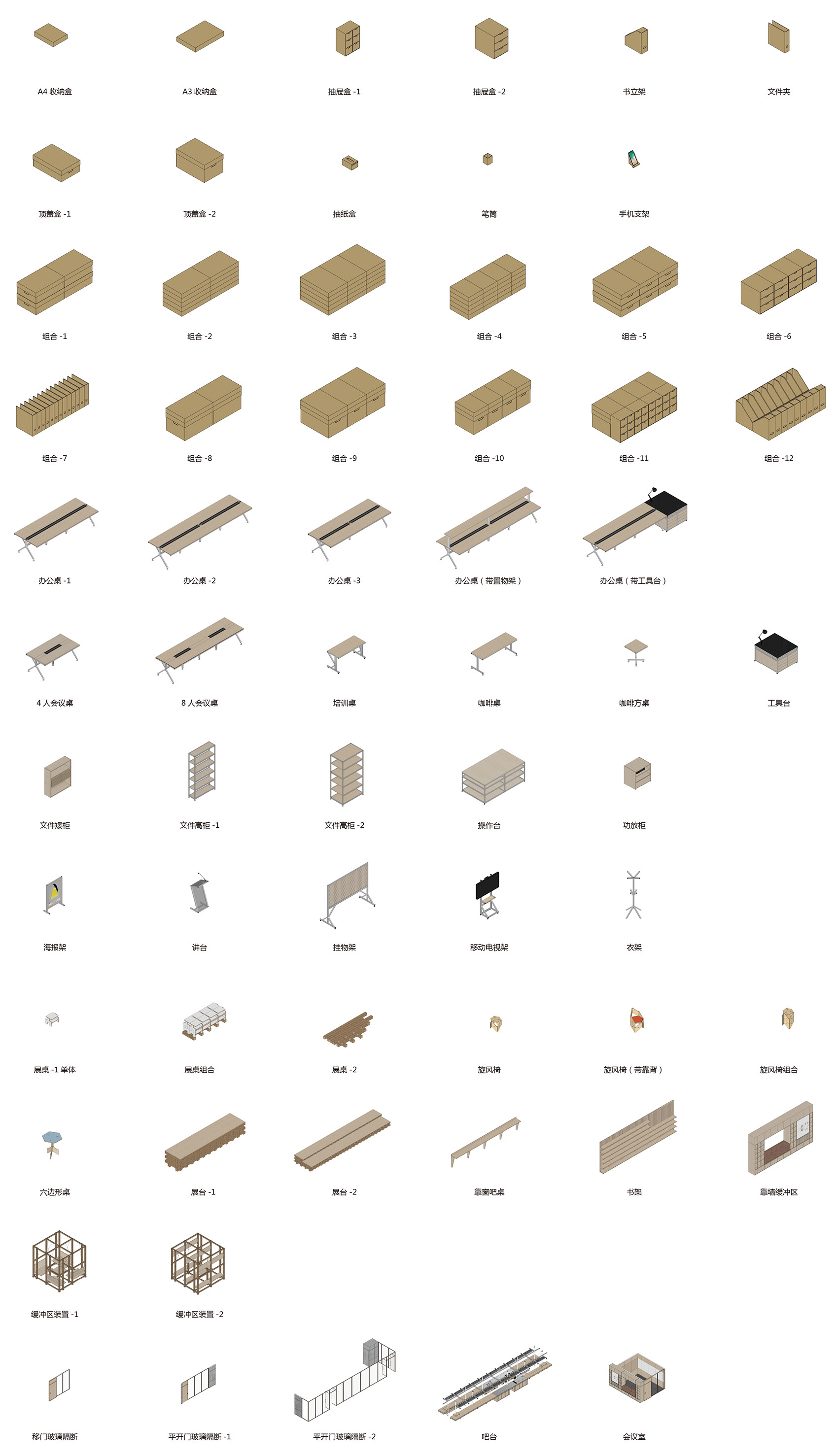 第二步我们由场地的柱网尺寸细分得出所有零件基本模数,根据这套模数确定零件的基本骨架间距。再按照不同的受力关系确定所使用板材的厚度,最终深入到节点确定材料之间的连接关系。于是形成了空间中的各种零件:桌、椅、架、墙、门、隔断,以及空间装置。