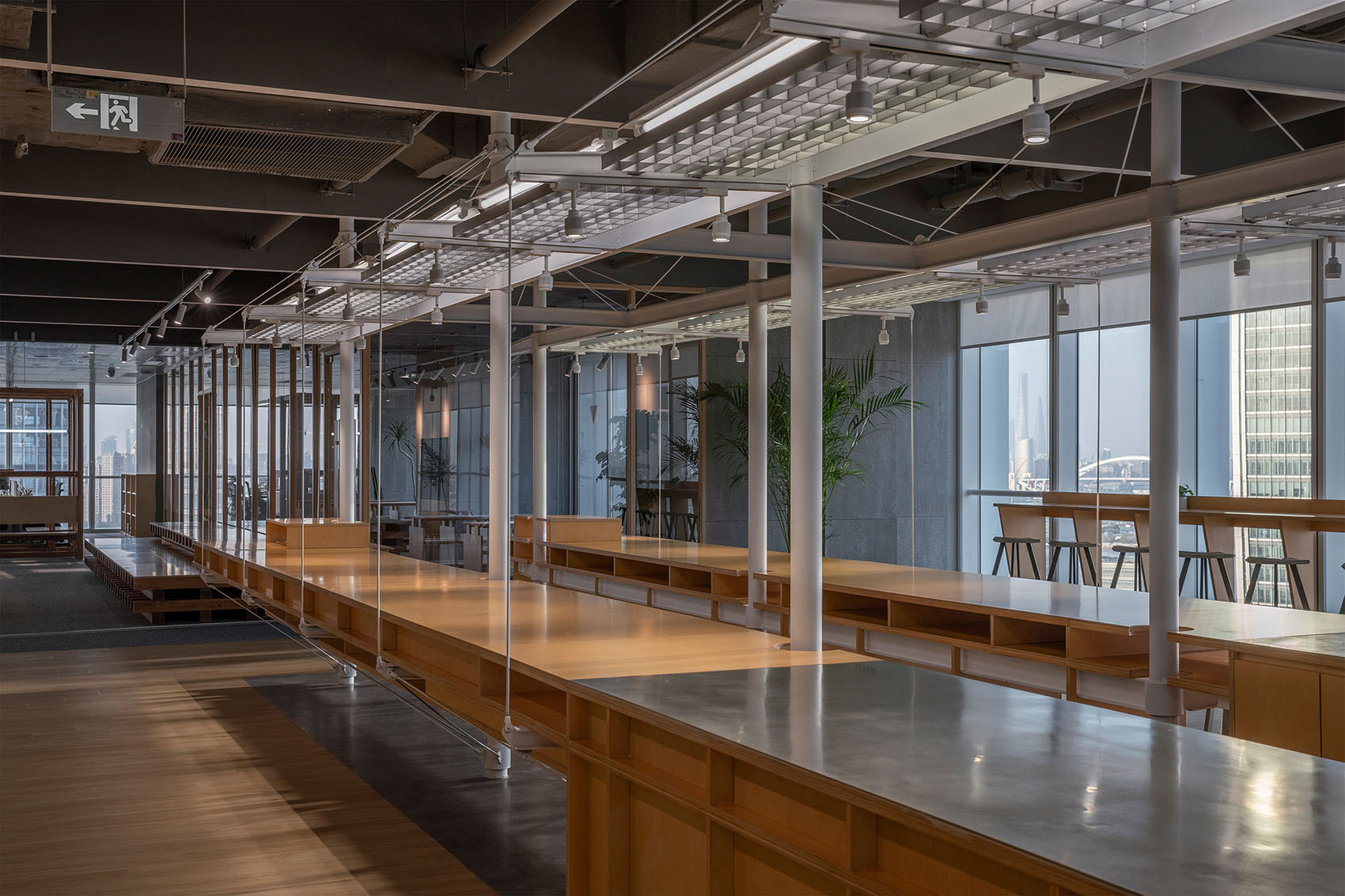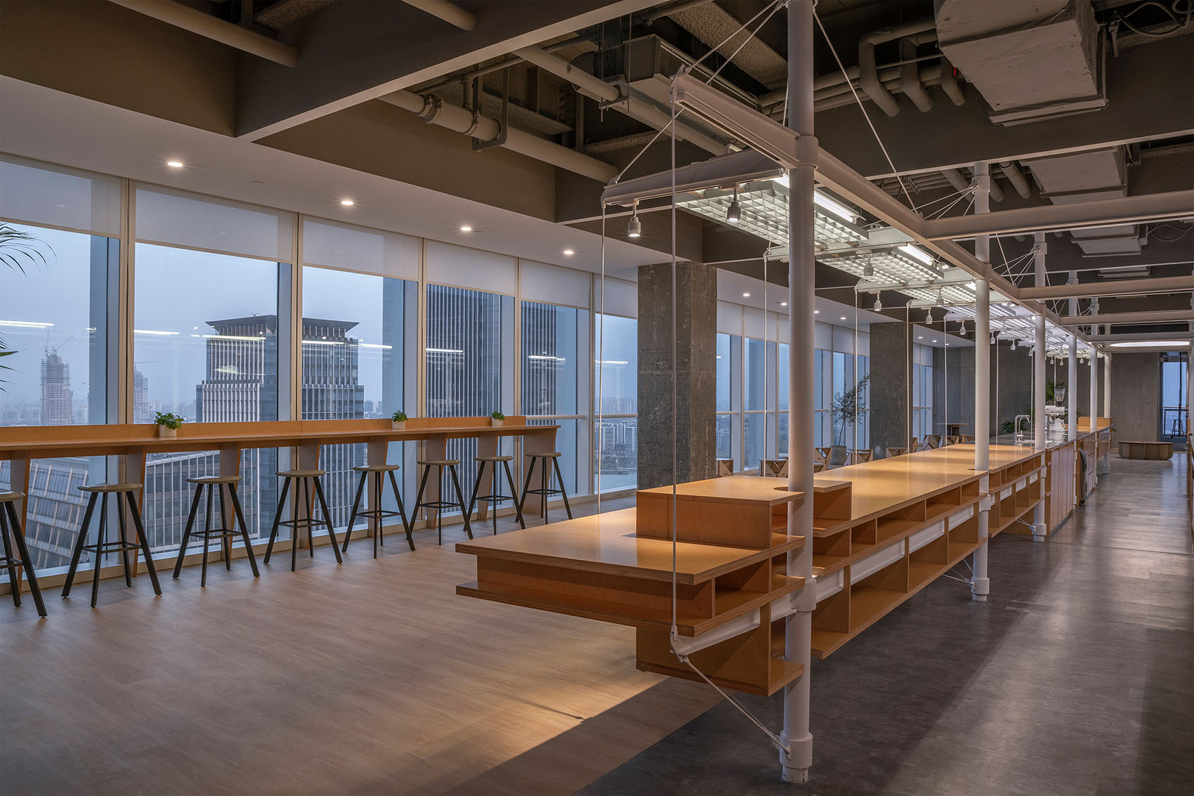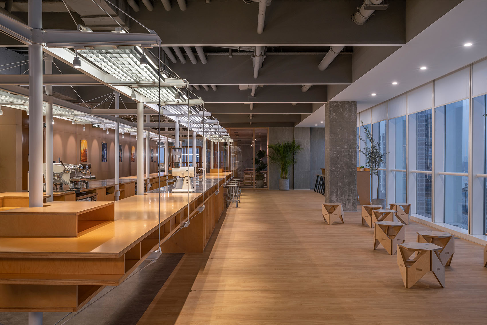 我们在入口区域设计了也是空间系统中最开放的部分:“咖啡广场”。这是这个小城镇的“居民”每天的必经之路,也是交流、休息、聚会和接待访客的场所。广场的核心是一个复杂结构组成的线性咖啡吧台,我们引入了类似桥梁结构的钢结构悬挂系统,使它匹配这个室内广场空间的尺度。同时我们设计了可以任意组合的座凳,形成广场上不断变化的景观。
