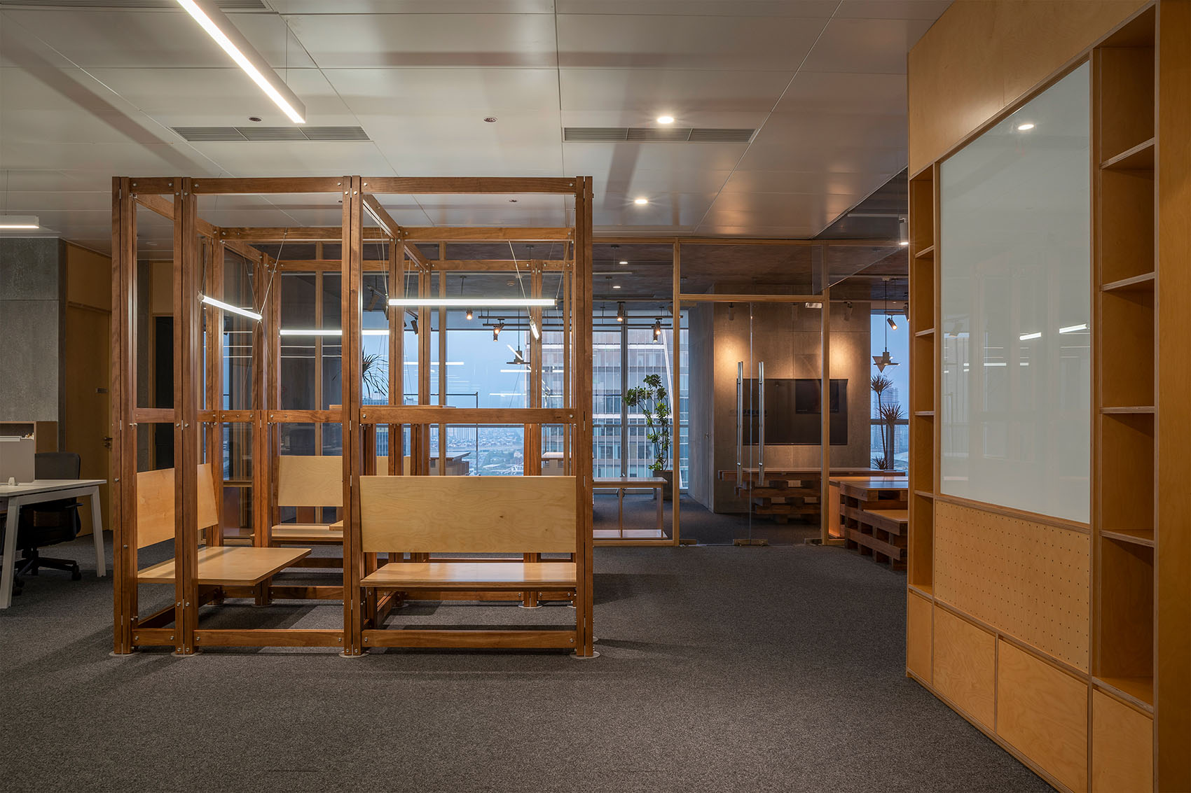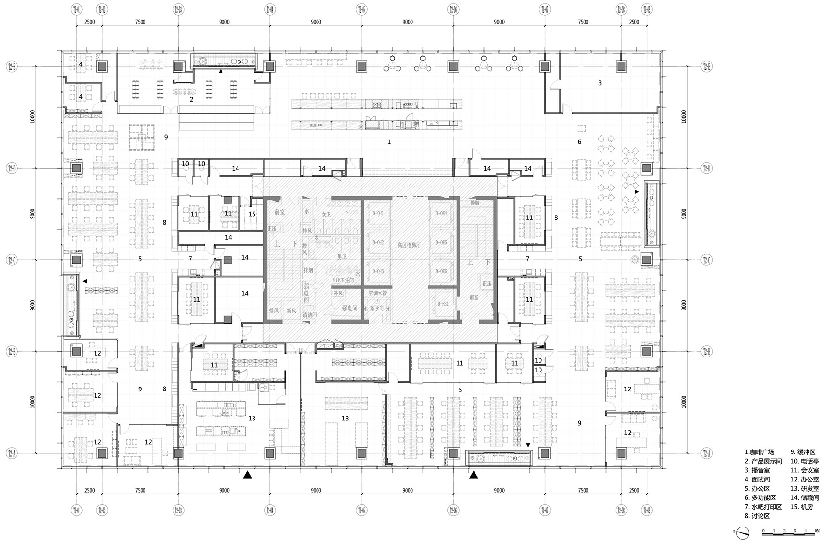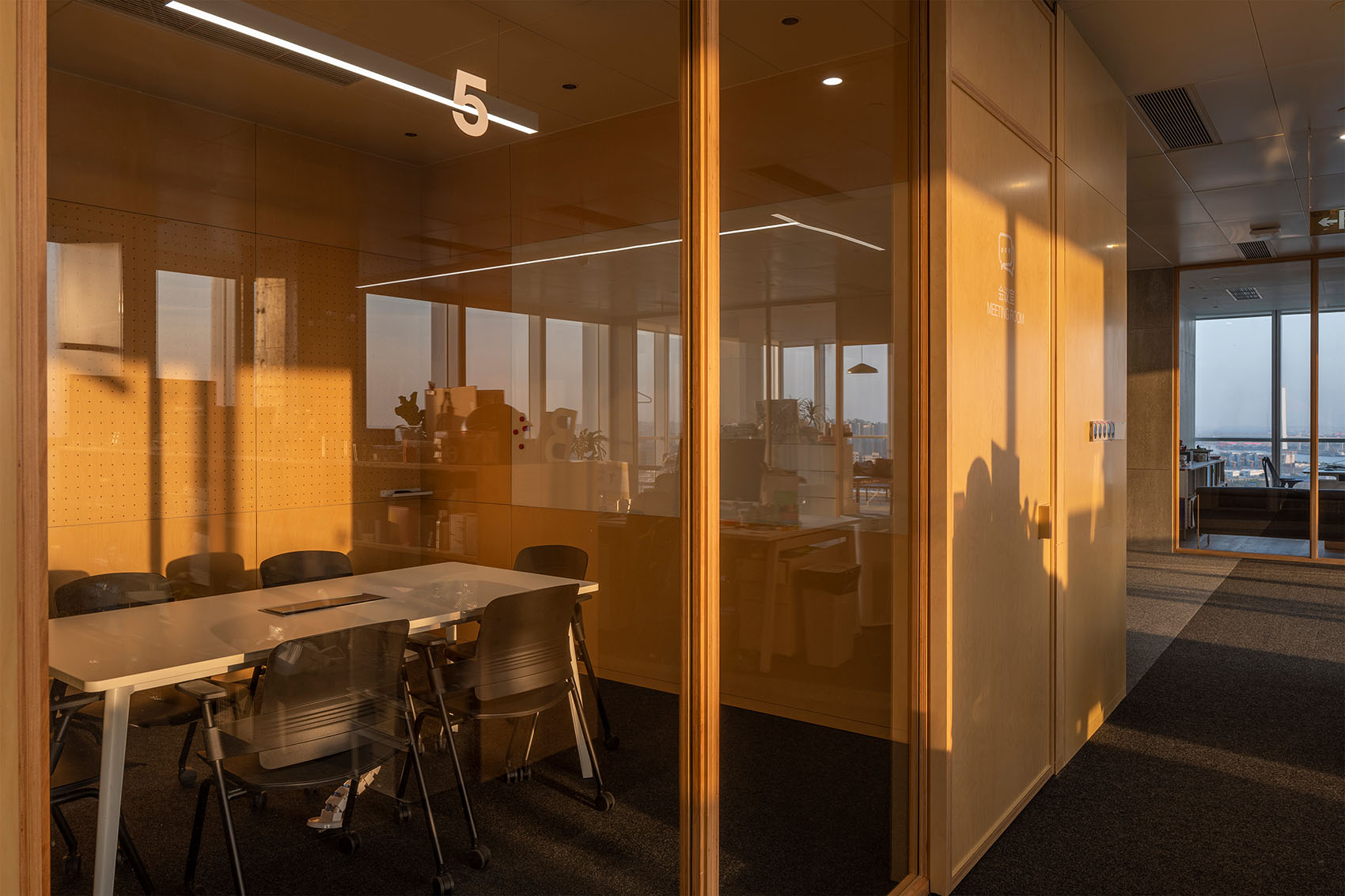 由广场可以通向各个部门的办公“街区”,在到达这些街区之前,我们设置了大大小小的缓冲空间,这里是办公室中的“公园”。公园中有可供随时停留、讨论的坐席和书写板。在公园的中心放置了有趣的空间装置。这些装置如同城市中的“纪念碑”,提示出不同区域的入口。