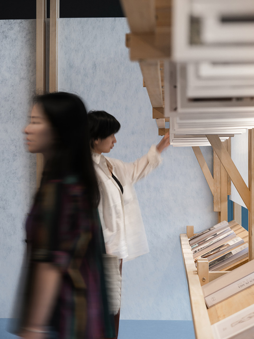 入口处翘起一角如同正待翻开的书页,在临近时,便使人能够沉浸体验空间所营造的“阅览氛围”。