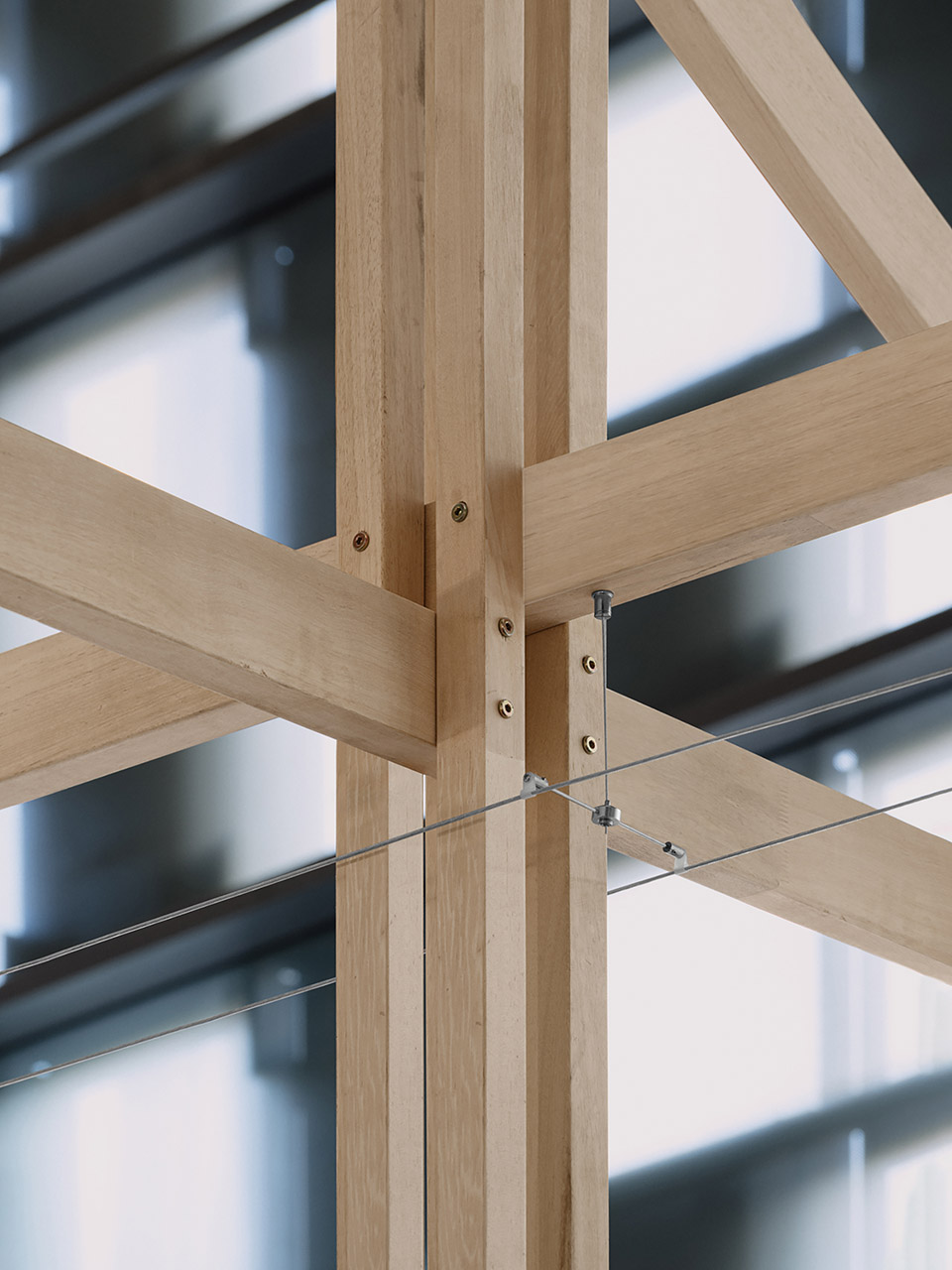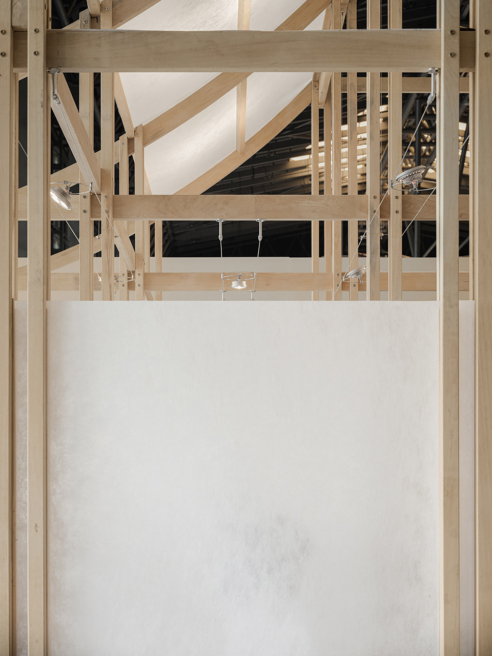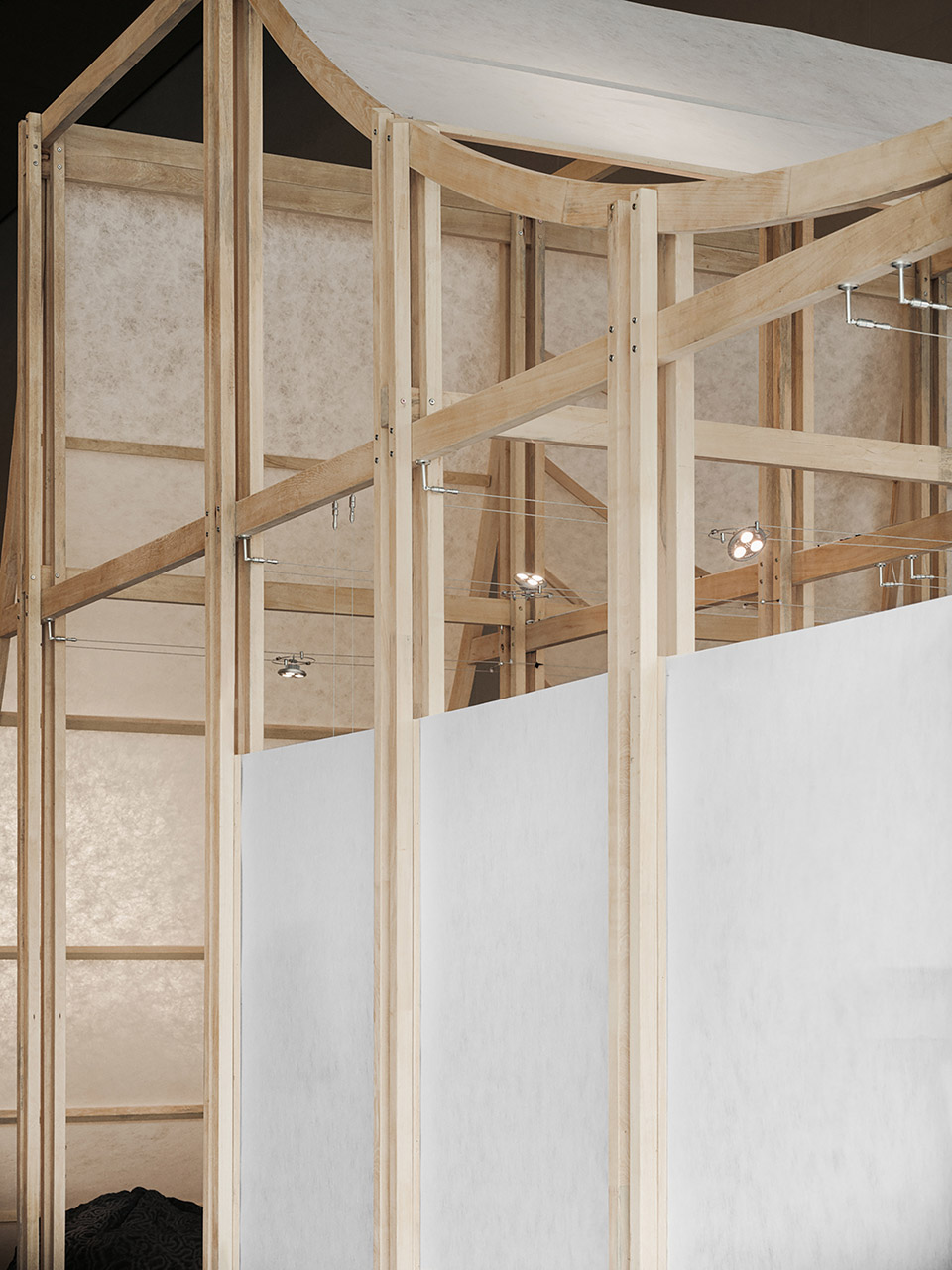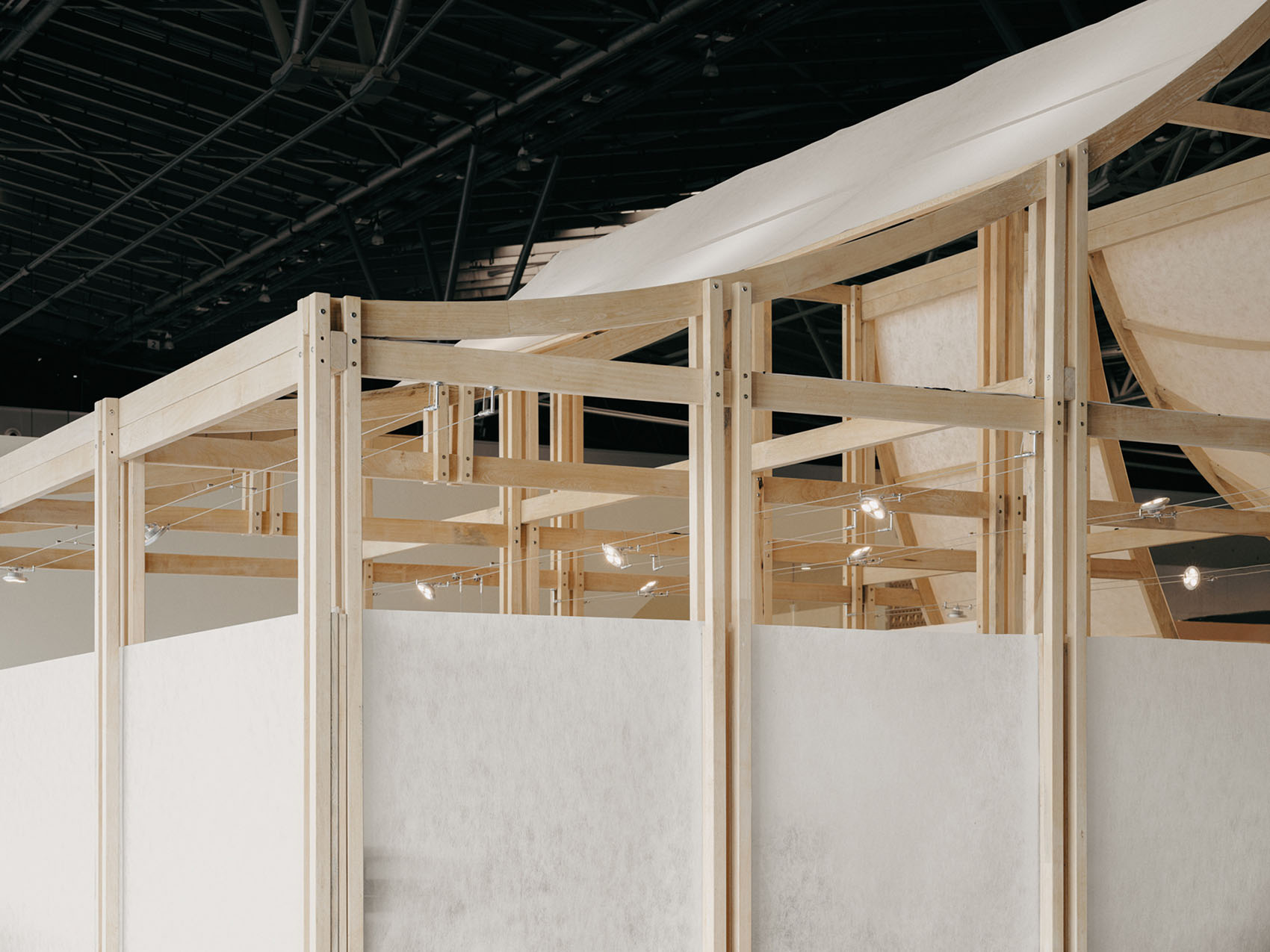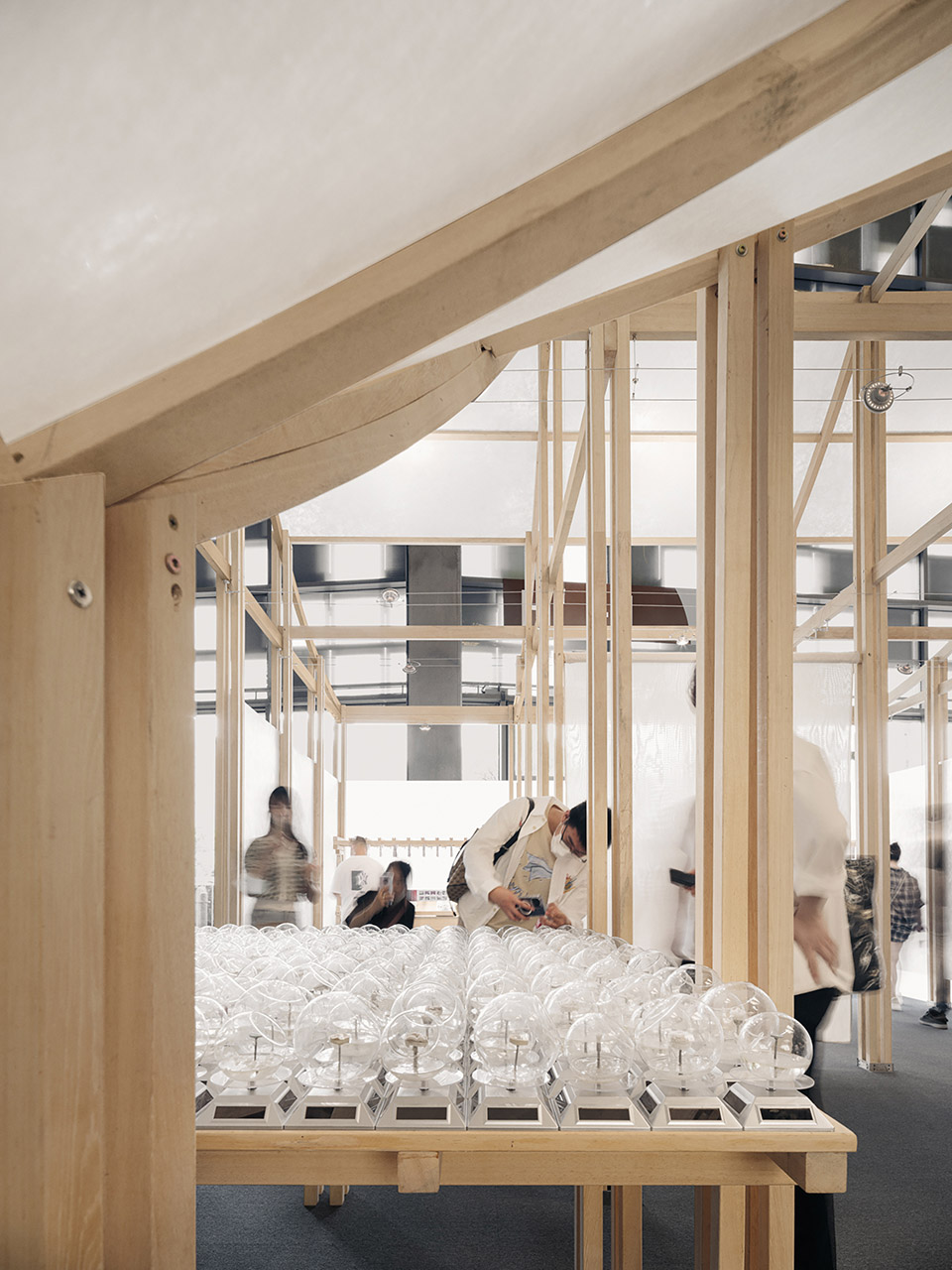 本次建筑主体以可持续使用的天然材料“木”作为核心材料,以实现整体构筑。同时,在组合形式与架构中,从实用角度切入,融合与致敬传统建筑手法,并通过当代设计表达方式加以呈现,为后期灵活拆卸、快速搬运及多次循环使用提供可行性思路。