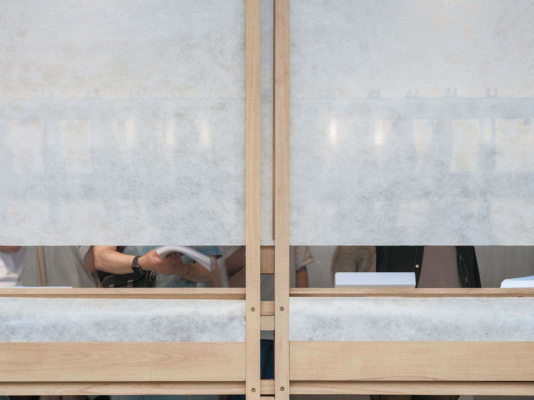 同时,在外表皮材料的选用上,以和纸作为主题呼应,由表及里包裹立面,内部以同样材质完成软隔断的设置,以此实现动静区域分隔。柔韧精巧、轻盈通透。