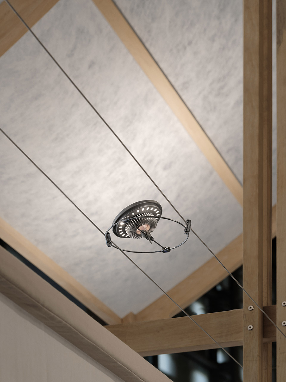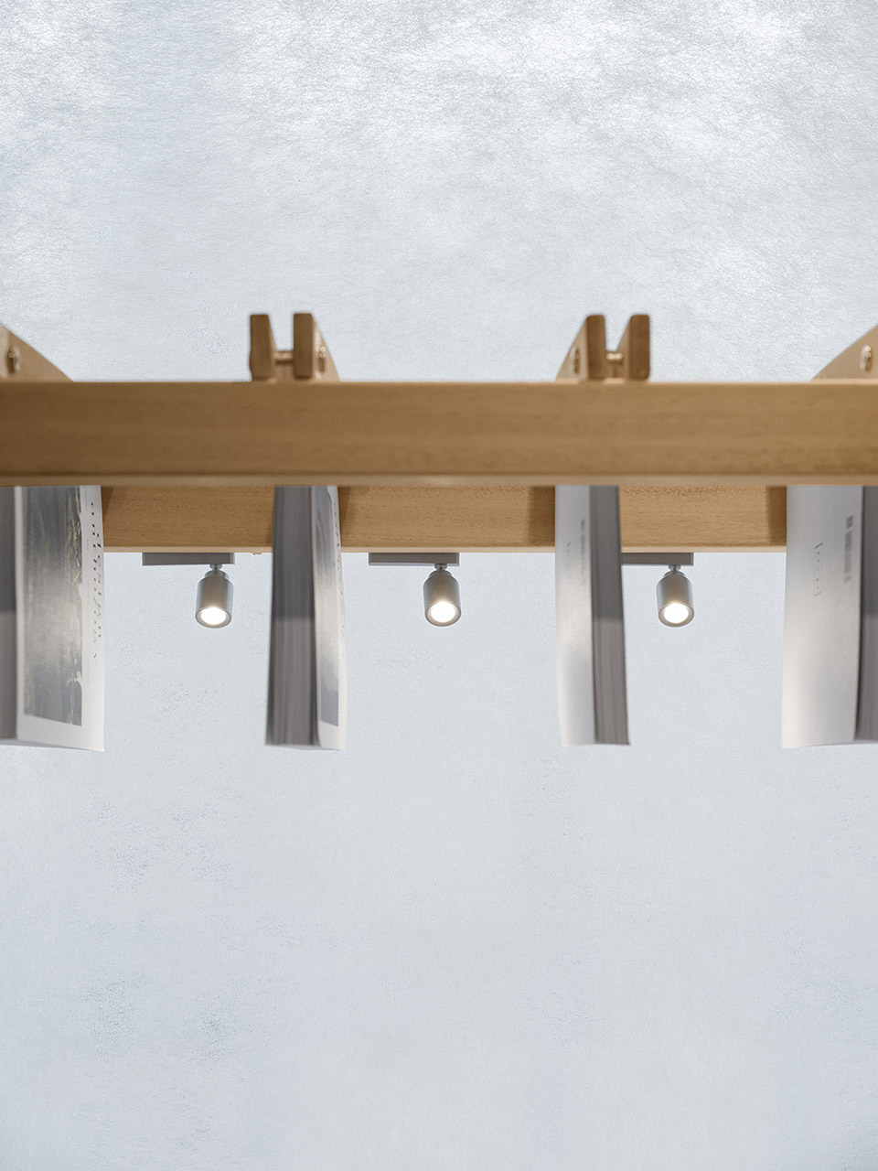 为配合本次建筑整体呈现出的轻盈与通透感,我们将常规悬挂式灯具以灯线代替,藏匿于木工凹槽中,搭配传统木工结构一并呈现,满足照明功能的同时,在空间细节部分起到装饰点缀效果。古今碰撞,传递当代设计语言之下的美感表达。