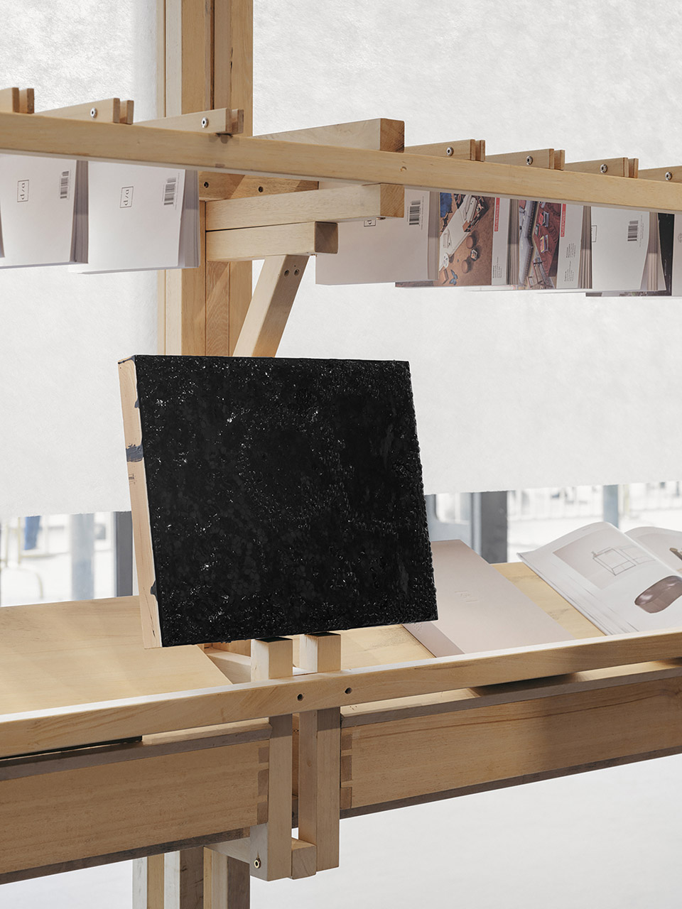 在空间动线规划中,我们通过不同板块的内容与呈现效果实现切分。其中不乏各类艺术家的展品陈列其中,人们可沉浸式查阅与游览。当进一步深入内里时,便可在一处相对独立的空间中,看见过往数期da杂志正通过传统报架的陈列方式逐一展示,在惯常的阅读体验之外,我们在已有的报架结构中加入了小型材料板装置,通过不同展板质感的切面呈现,赋予相对静态的内容更多层次体验。期刊分明、易于读取。