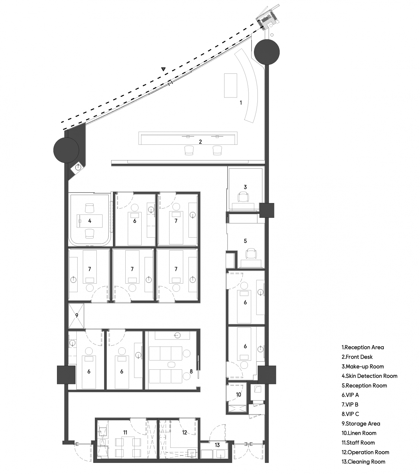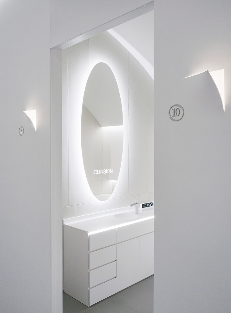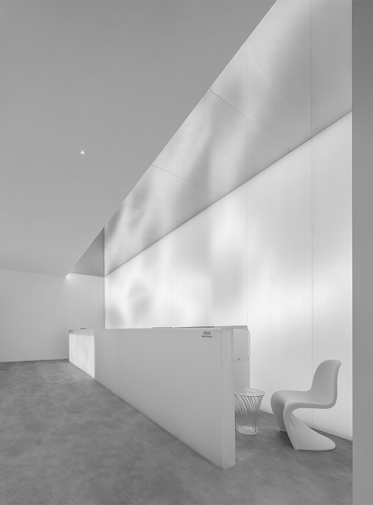 梦中所见往往难以准确描述,事物的映射往往匪夷所思,它在梦境中存在并看似合理。在紧凑的功能配置下,通过朦胧的雾白亚克力隔断整合了咨询台和化妆区的功能,形成简洁明快的空间划分。缓慢流动的光幕带来宁静的感受同时提供柔和的镜前补光。