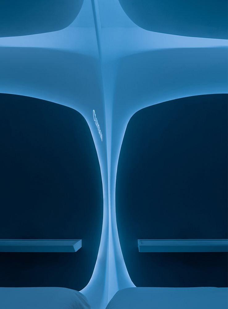 公共与私人空间中统一而纯粹的基调呈现出了一种静谧优雅的画面结构和感官体验,传递简约的空间美学。柔和、轻盈的灯光氛围,恰到好处的留白,赋予更多的想象空间。梦无论怎样模糊,总潜伏在我们心底,使我们的心境永远得不到宁静,直到这些梦成为事实。弧形将墙面与天花融为一体,镜面模糊边界,跳跃的光影,模糊现实与梦境的界线,让意识在现实中脱离开来,深入梦境的旅程。梦是灵魂撕开的缺口,是灵魂的渗漏,每个房间的门牌掀开的是一个又一个的梦境。
