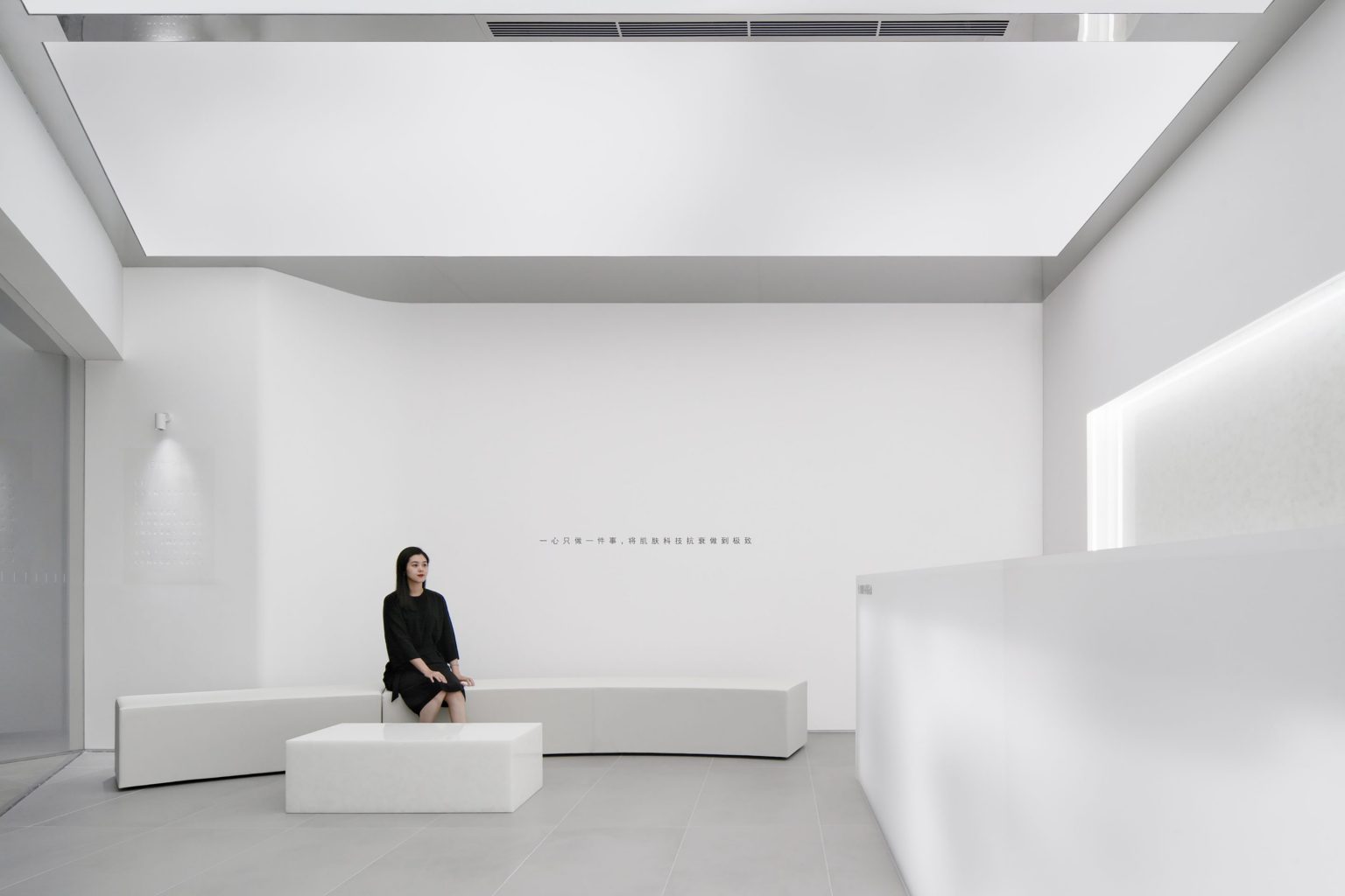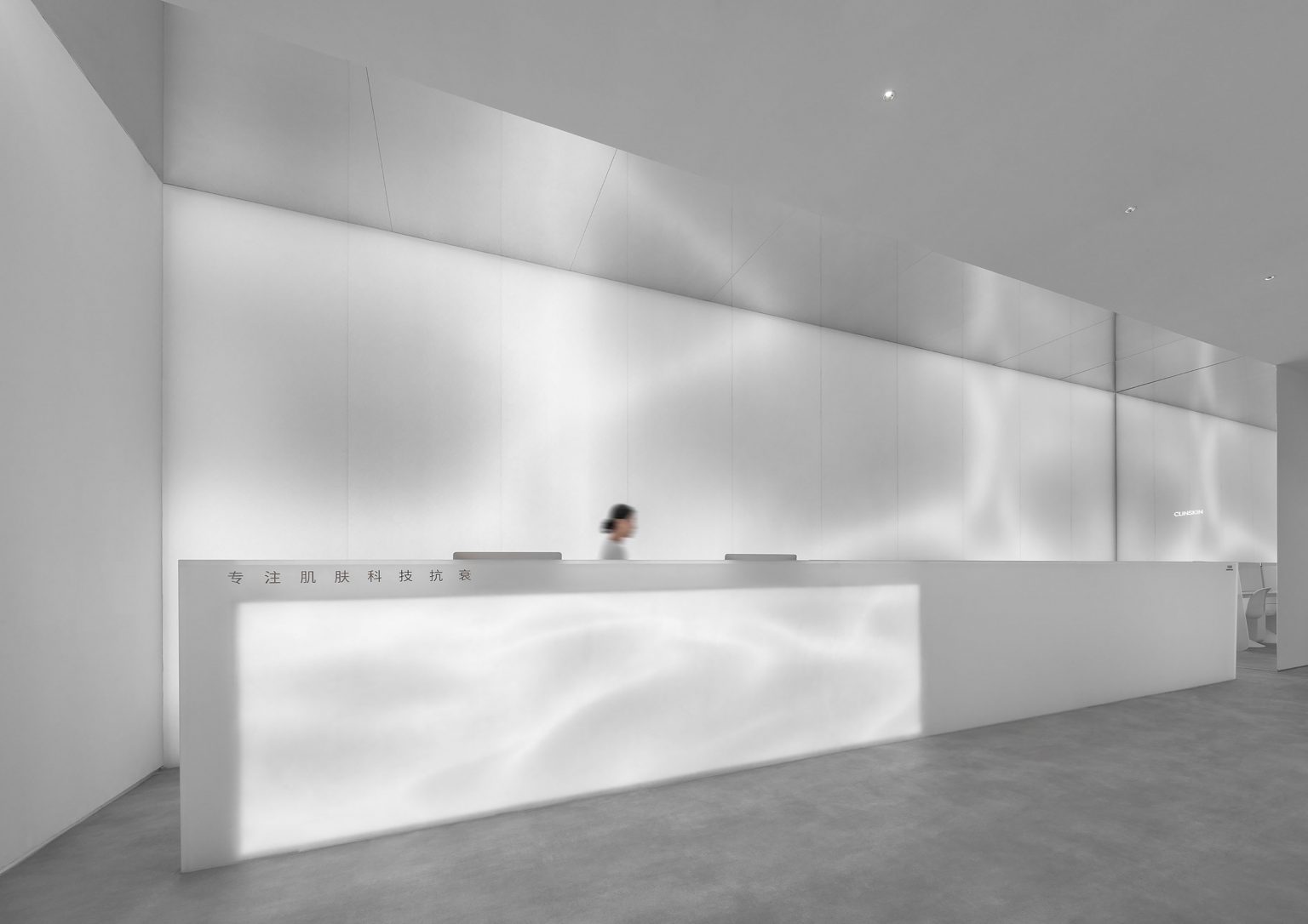 维持品牌以纯净空间为框架的内核,感官持续笼罩在白色的主基调中,无暇的晶玉玻璃的独特纹理在光的洗礼下,呈现出其自然之美,构成了皮肤修护的喻示。圆弧的家具与墙面如同一只温暖的手轻抚浮躁的灵魂,由上至下的“天光”照亮了“专注肌肤科技抗衰”的品牌核心。