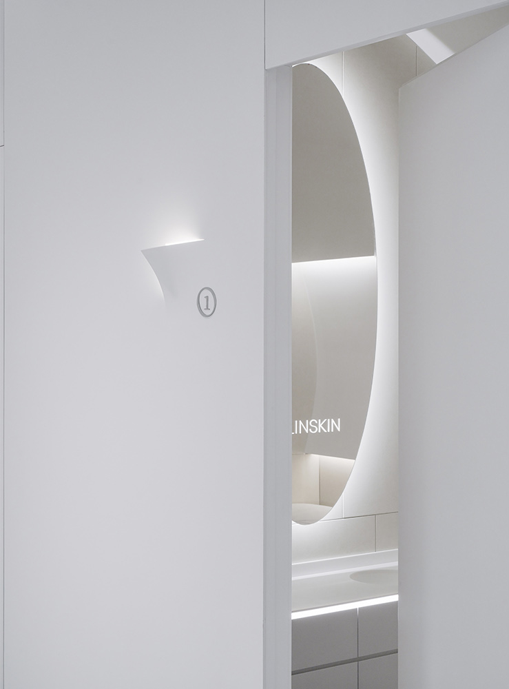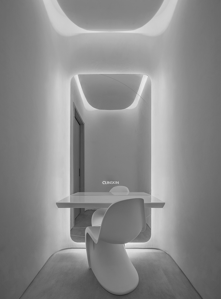 空间用用朦胧、透亮、轻盈的材质来重新诠释大众对科技美容的刻板印象。科技抗衰是对时光流逝的精准控制,是柔和而理性的并非强烈的逆转。当代都市女性有着独立的审美和自主选择意识,不跟风、不追求华而不实的表面感受。更倾向专业、用心、高效和极致的护肤体验,强调体验的“唯一性”和“独特性”从而提供专业美学进阶服务。