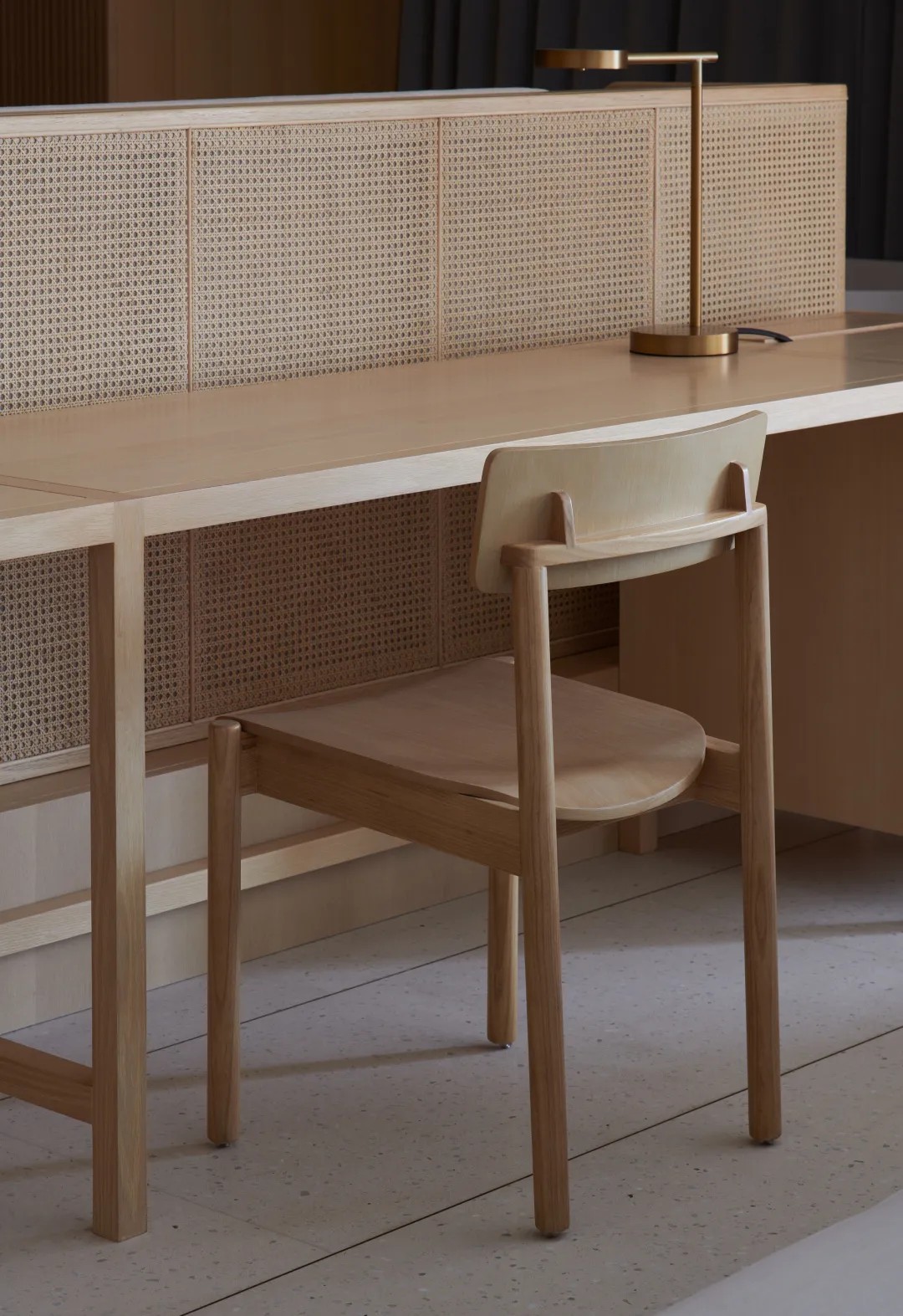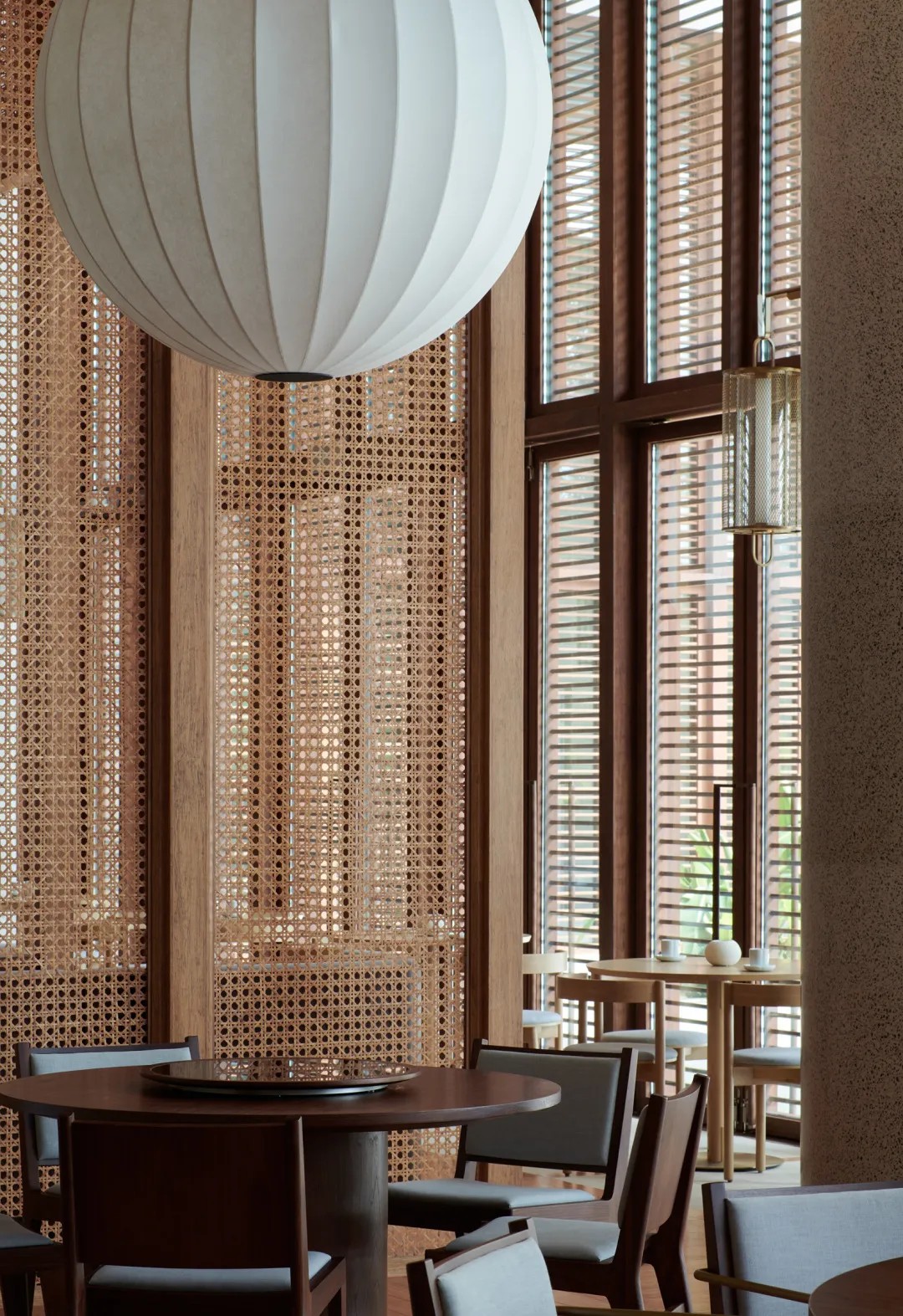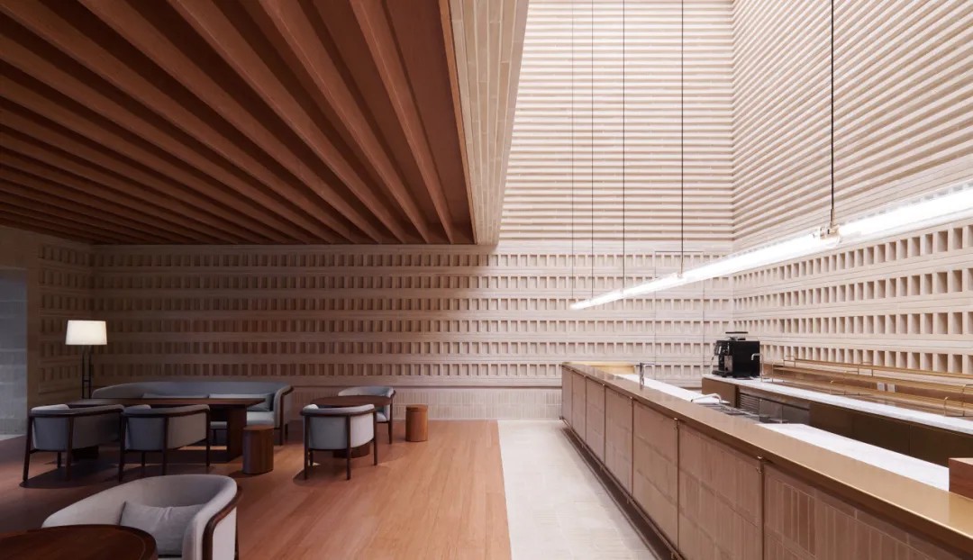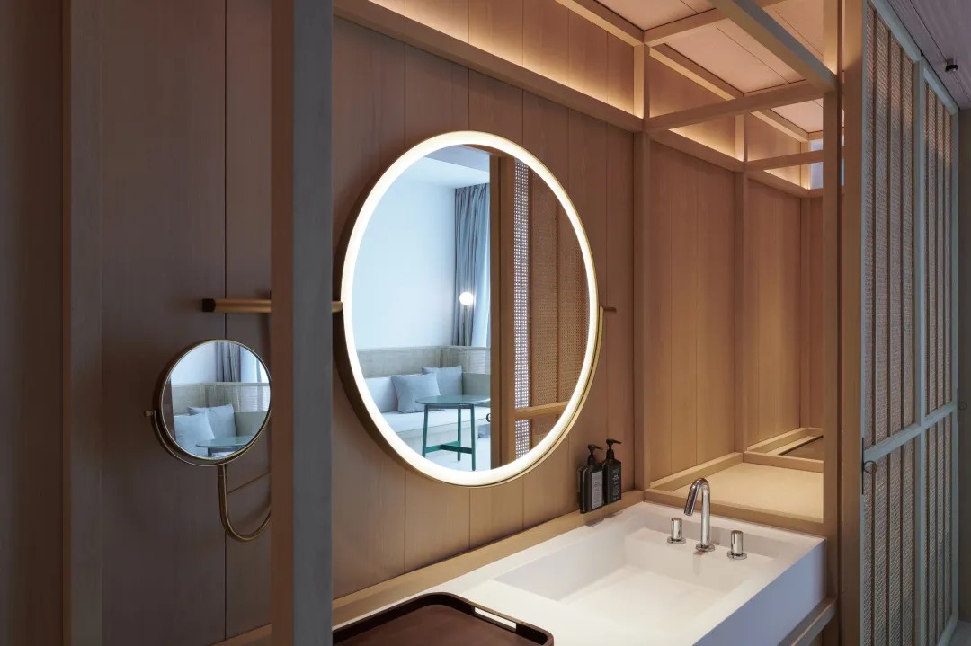 酒店大堂犹如花园景观,柔和的日光透过上空漂浮的“灯笼”,轻轻拂过建筑内部。微风徐徐,旅客亦放缓脚步,沉浸于自然之中。藻井高度被有意地降低,将旅客的视线引向远处的海边景观。