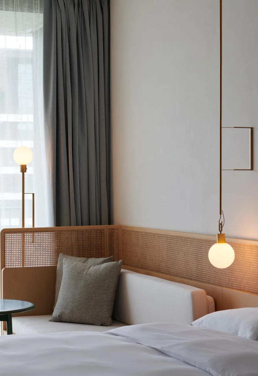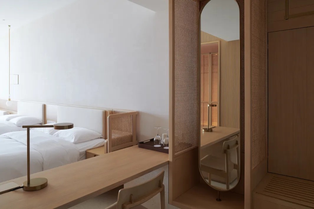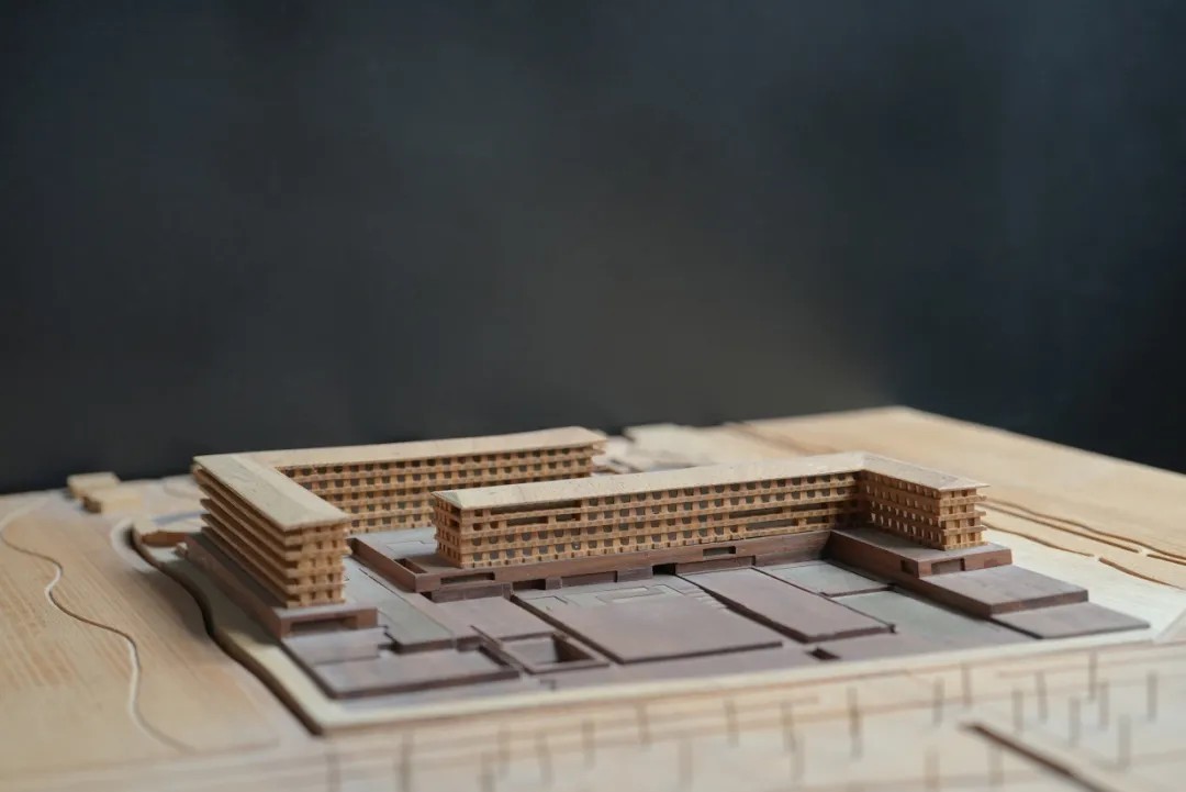 客房层的公共走道犹如一条街巷,人们在其中或驻足、或游走、或偶遇,享受旅途间的不经意。带有角度的墙面与质感材质的叙述,描绘出建筑立面的动态感,虚实交替,光影浮动。